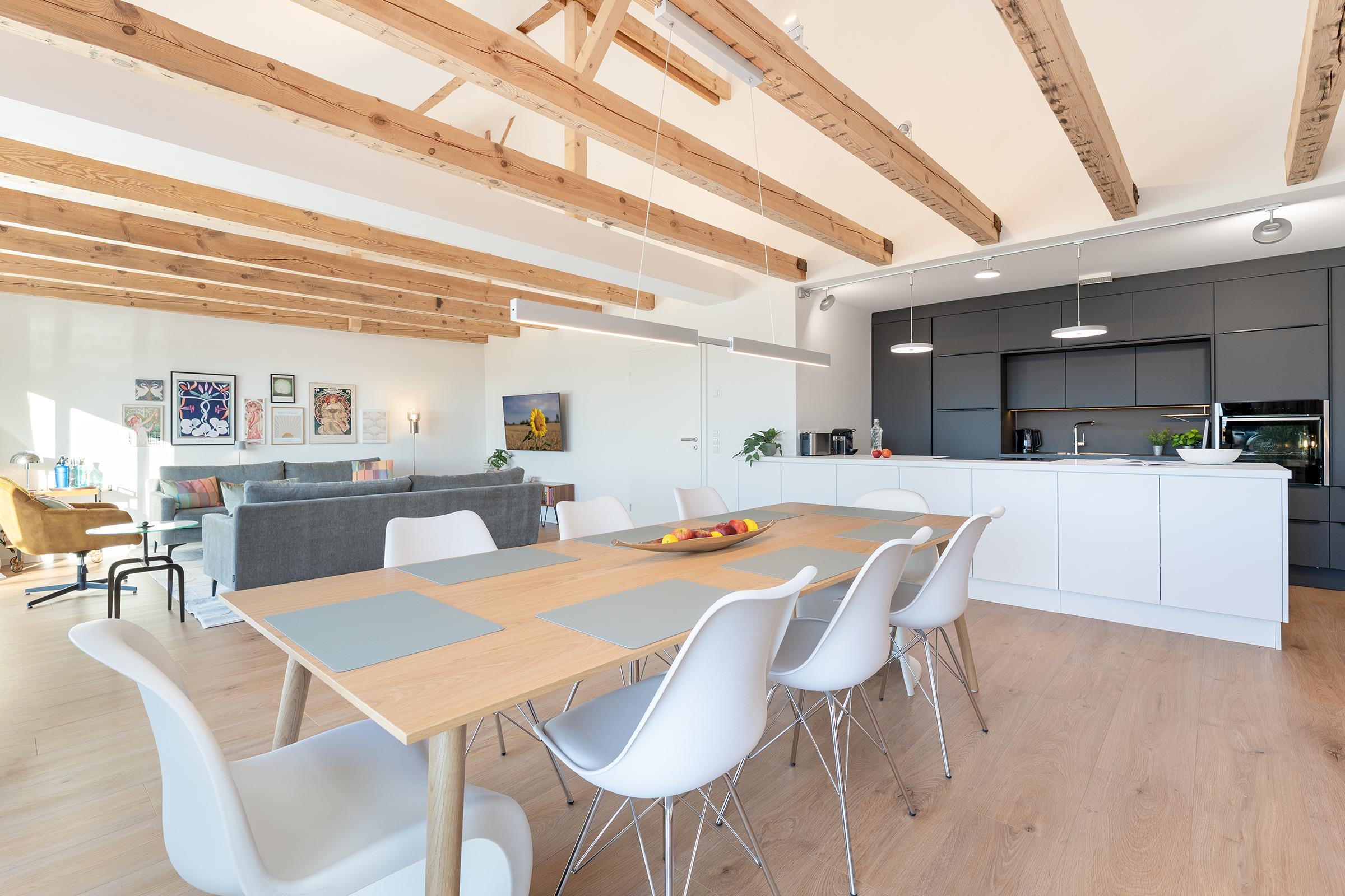 Das Herzstück dieser modernen Loft-Suite ist der weitläufige Wohnbereich mit hohen Decken und sichtbaren Holzbalken, die dem Raum einen besonderen Charme verleihen. Stilvolle Details schaffen eine einladende Atmosphäre, während große Fensterfronten viel Licht hereinlassen und den Blick ins Grüne eröffnen. Von hier aus gelangen Sie auf den Balkon mit Westausrichtung, ideal für entspannte Nachmittage in der Sonne. Zusätzlich steht Ihnen eine Terrasse mit Ostlage zur Verfügung, perfekt für das Frühstück im Freien.