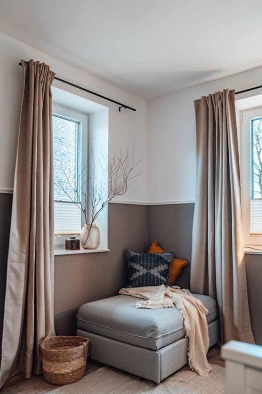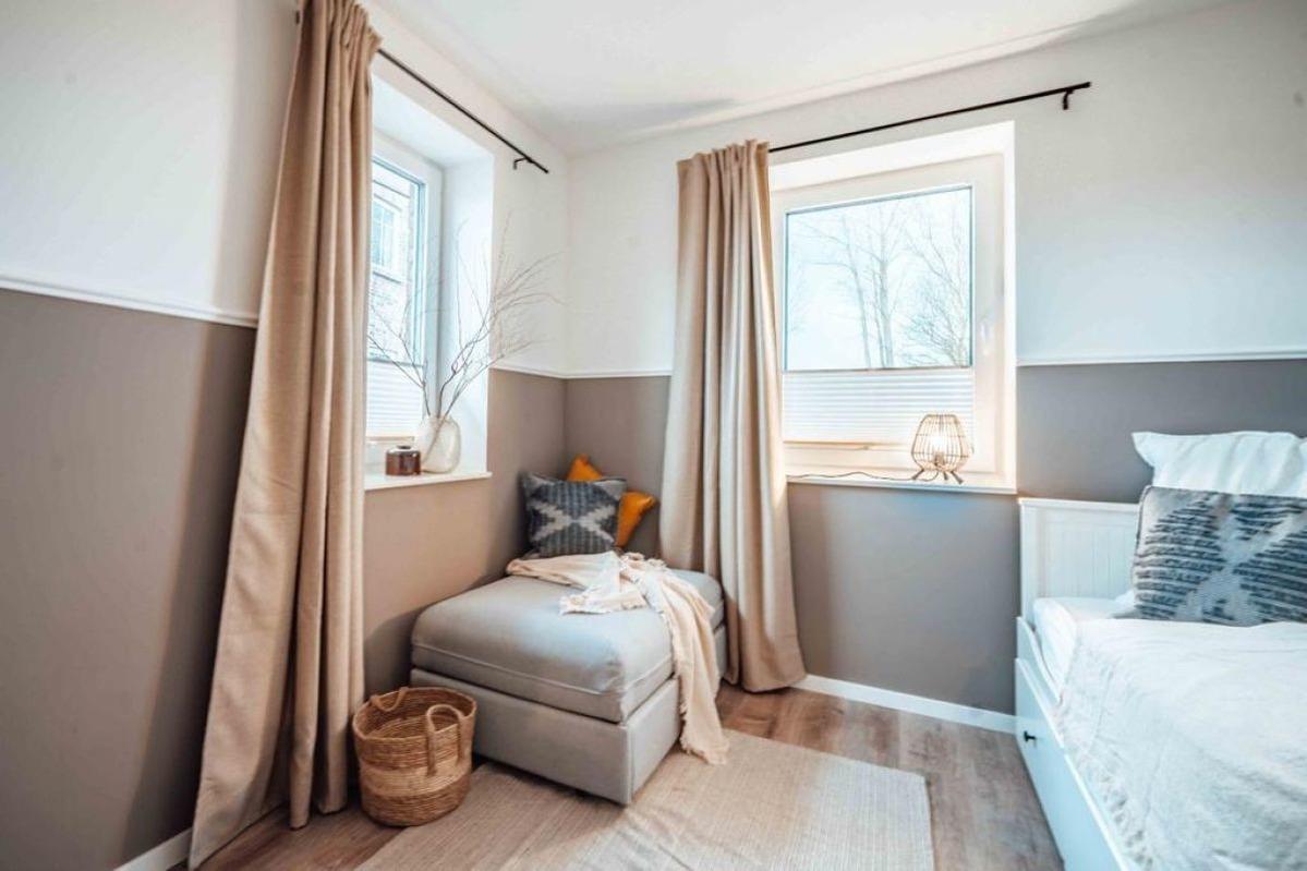 Es gibt zwei Schlafzimmer. Das Hauptschlafzimmer mit Doppelbett (180x200cm) und auch das kleinere Schlafzimmer mit zwei Einzelbetten (90x200cm) bestechen durch den Blick ins Grüne.