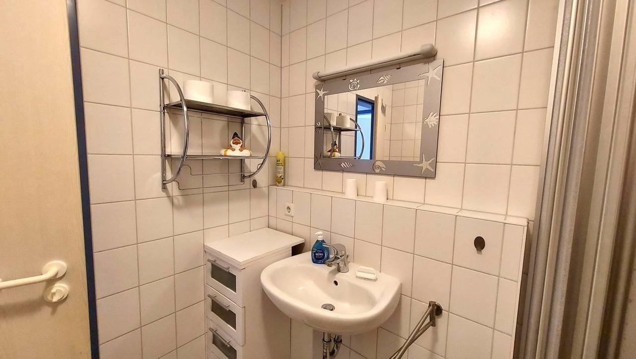 Das Badezimmer erreichen Sie direkt vom Flur aus. Am Ende des Flures schließt sich das Schlafzimmer in der unteren Ebene an.