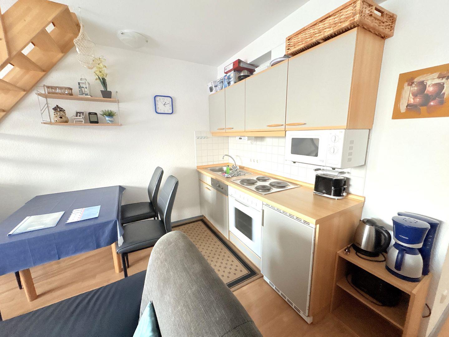 Im ersten Stock befindet sich ein einladender Wohn- und Essbereich, der Platz für bis zu 4 Personen bietet. Die funktionale Küche ist mit einer Pantry ausgestattet und verfügt über Herd, Backofen, Kaffeemaschine, Mikrowelle, Toaster und Geschirrspüler. Ein Schlafzimmer mit zwei bequemen Betten, ein Bad und ein Balkon, auf dem Sie die frische Ostseeluft genießen können, runden diese Ebene ab.
