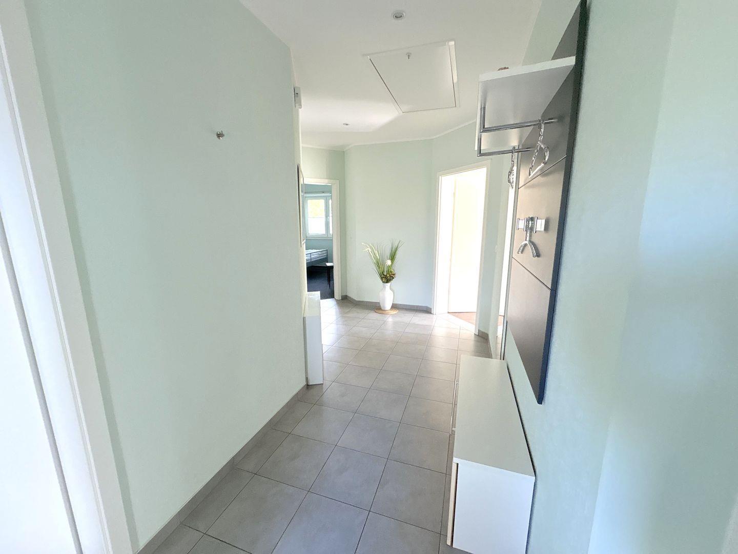 Zwei moderne Bäder – jeweils mit Dusche, Waschtisch, WC – sorgen für maximalen Komfort. Die Fußbodenheizung in allen Räumen sowie ein Kamin im Wohnzimmer schaffen eine behagliche Wohlfühlatmosphäre – auch an kühleren Tagen.