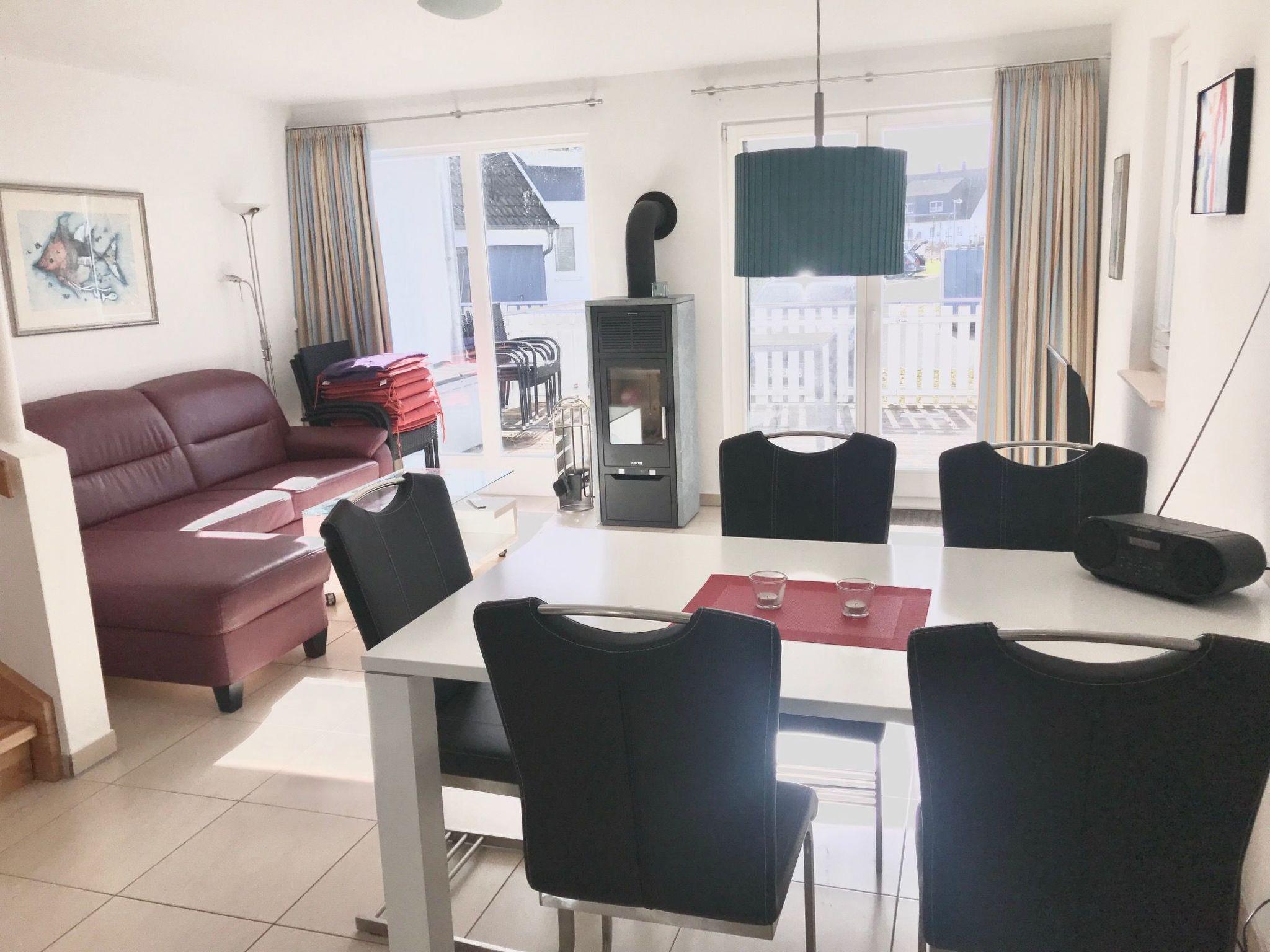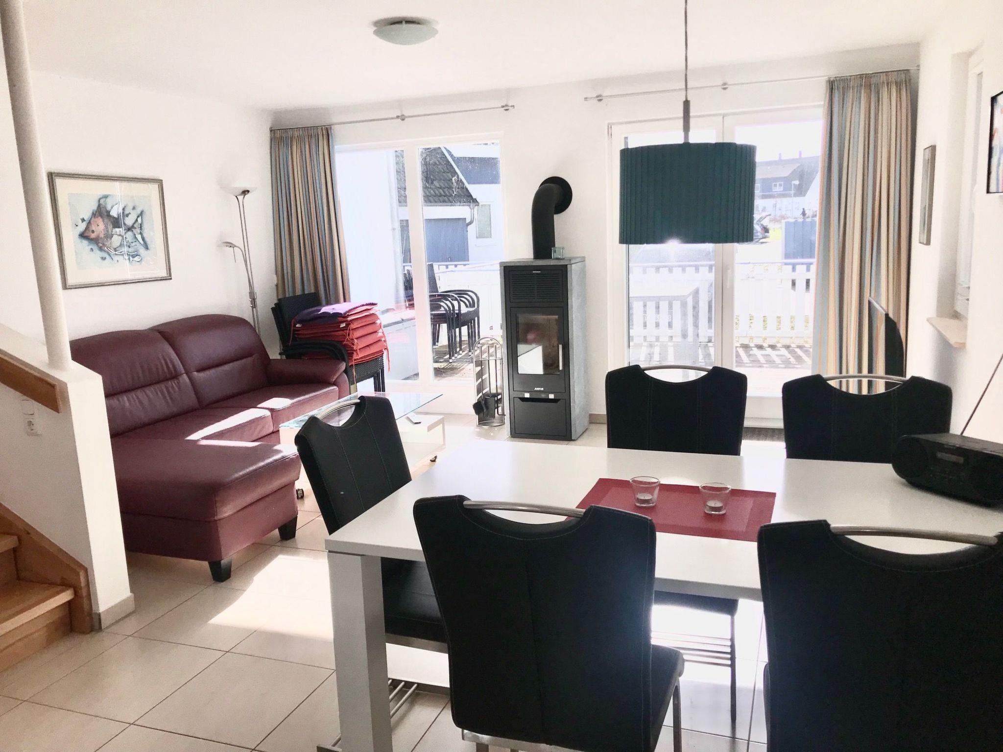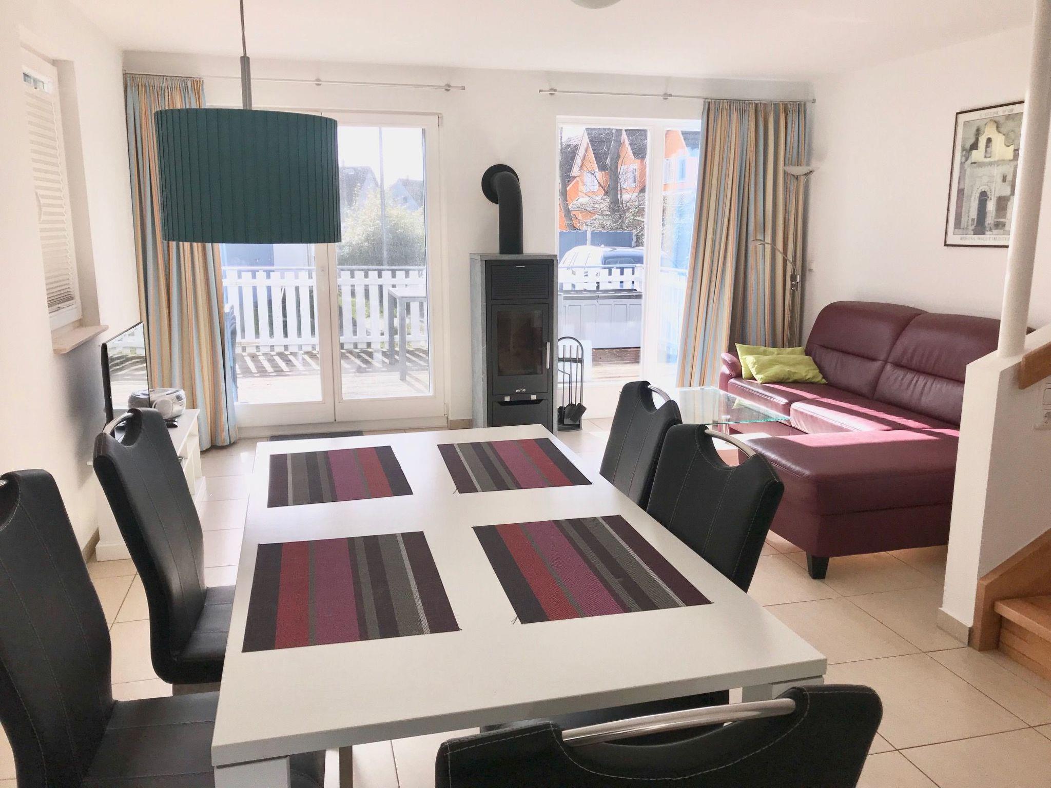 Der Außenbereich lädt mit einer Terrasse und einem idyllischen Garten, der zur gemeinschaftlichen Nutzung bereitsteht, zum Verweilen in frischer Luft ein. Für die Selbstversorgung ist das Ferienhaus mit modernen Annehmlichkeiten wie einem Cerankochfeld, einer Filter-Kaffeemaschine, einem Wasserkocher und einer Spülmaschine ausgestattet. Zusätzlich steht den Gästen zur alleinigen Nutzung eine Waschmaschine im Objekt zur Verfügung. Für gemütliche Abende sorgt der Kamin im Wohnbereich, während das warme Wasser umweltfreundlich mit Solarenergie ergänzt betrieben wird.
