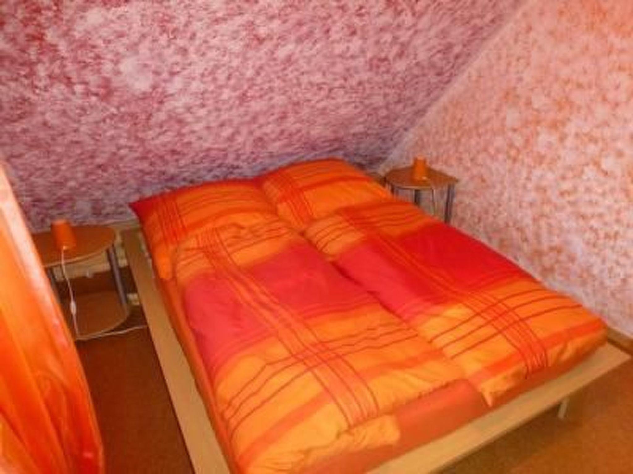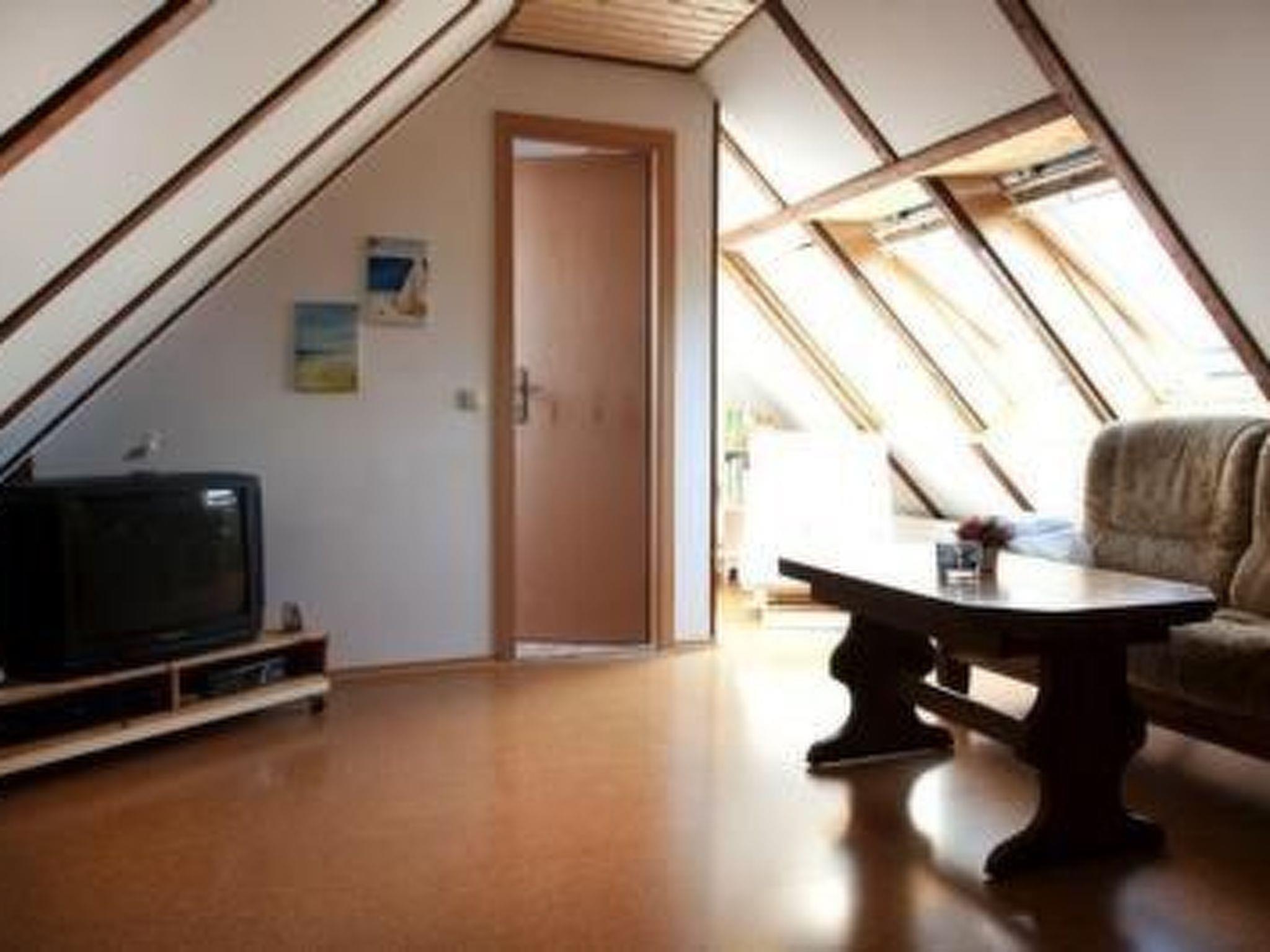 Hier befindet sich das Schlafzimmer mit einem Doppelbett und 2 Einzelbetten. Das Schlafzimmer sowie die Küche sind mit Insektenschutzrollos ausgestattet. Der rustikal eingerichtete Wohnbereich im Dachgeschoss, bietet bequeme Sitzgelegenheiten zum Plaudern. Eine Spiel- und Kuschelecke unterm Gaubendach wird von kleineren Kindern sofort entdeckt. Das Treppenauge ist mit einer Brüstung und einem Steckschott gesichert, so dass selbst Krabbelkinder unbehelligt spielen können. Sat/TV- Gerät, DVD Player sowie ein Radio gehören ebenso zur Ausstattung wie Gesellschaftsspiele, Kinderspielsachen und einige Kinderbücher. Drei große Dachfenster (mit außen liegenden Hitzeschutzrollos) verleihen Ihrem Urlaubsdomizil einen hellen freundlichen Charakter. Das Bad mit Dusche und WC ist der dritte Raum unterm Dach und wurde 2011 neu installiert. Außer dem Bad ist die gesamte Ferienwohnung mit Kork- bzw. Laminatparkett ausgelegt, alle Räume sind beheizbar, so dass auch in der Nebensaison für angenehme Wärme gesorgt ist.