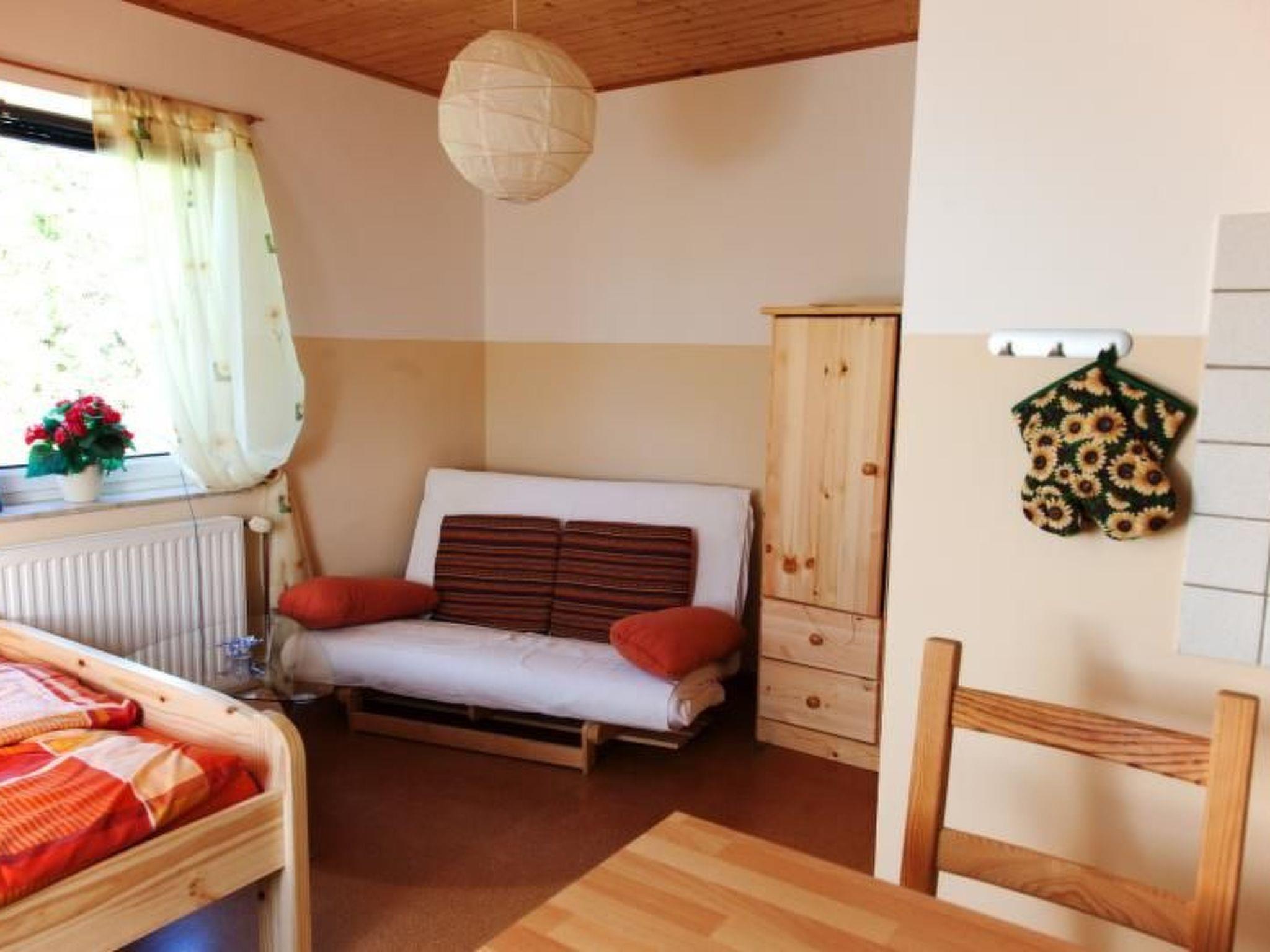 Das Ferienstudio befindet sich in der ersten Etage eines freistehenden Wohnhauses und ist durch ein separates Treppenhaus erreichbar. Im Vorflur finden Sie den Zugang zum gemütlichen Schlaf- und Wohnraum, der mit einem Doppelbett und einer ausklappbaren Liege ausgestattet ist. Zur weiteren Ausstattung gehören ein Sat/TV-Gerät, ein Radio mit CD- und Weckfunktion sowie eine Miniküche. Dieser Bereich verfügt über einen Kühlschrank, einen 2-Plattenherd, Toaster, Wasserkocher, Kaffeemaschine und natürlich Geschirr. Ein kleiner Essbereich bietet Platz für 2-3 Personen. Ein modernes Bad mit Dusche und WC vervollständigt das Raumangebot.