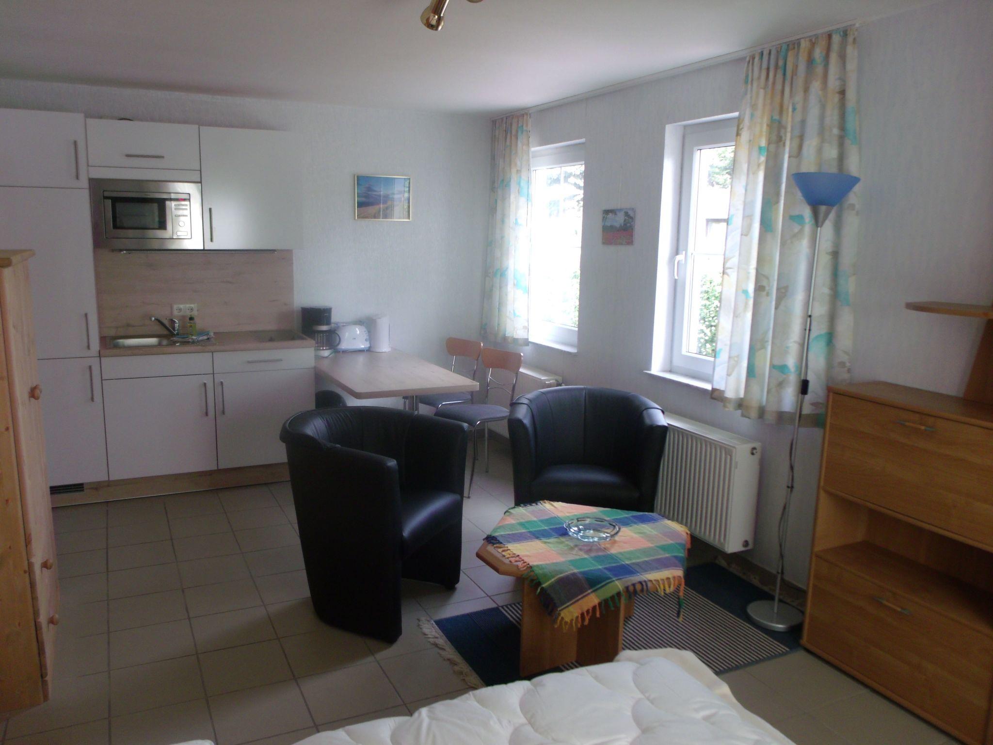 Das Einraumappartement liegt im EG. Zur Ausstattung gehört ein 1,80 Doppelbett, Sat-TV, eine Küchenzeile mit 2-Platten-Cerankochfeld, Mikrowelle, Kaffeemaschiene,Wasserkocher,Toaster, Essecke, 2 Sessel, sowie ein Bad mit Dusche,Waschbecken und WC.