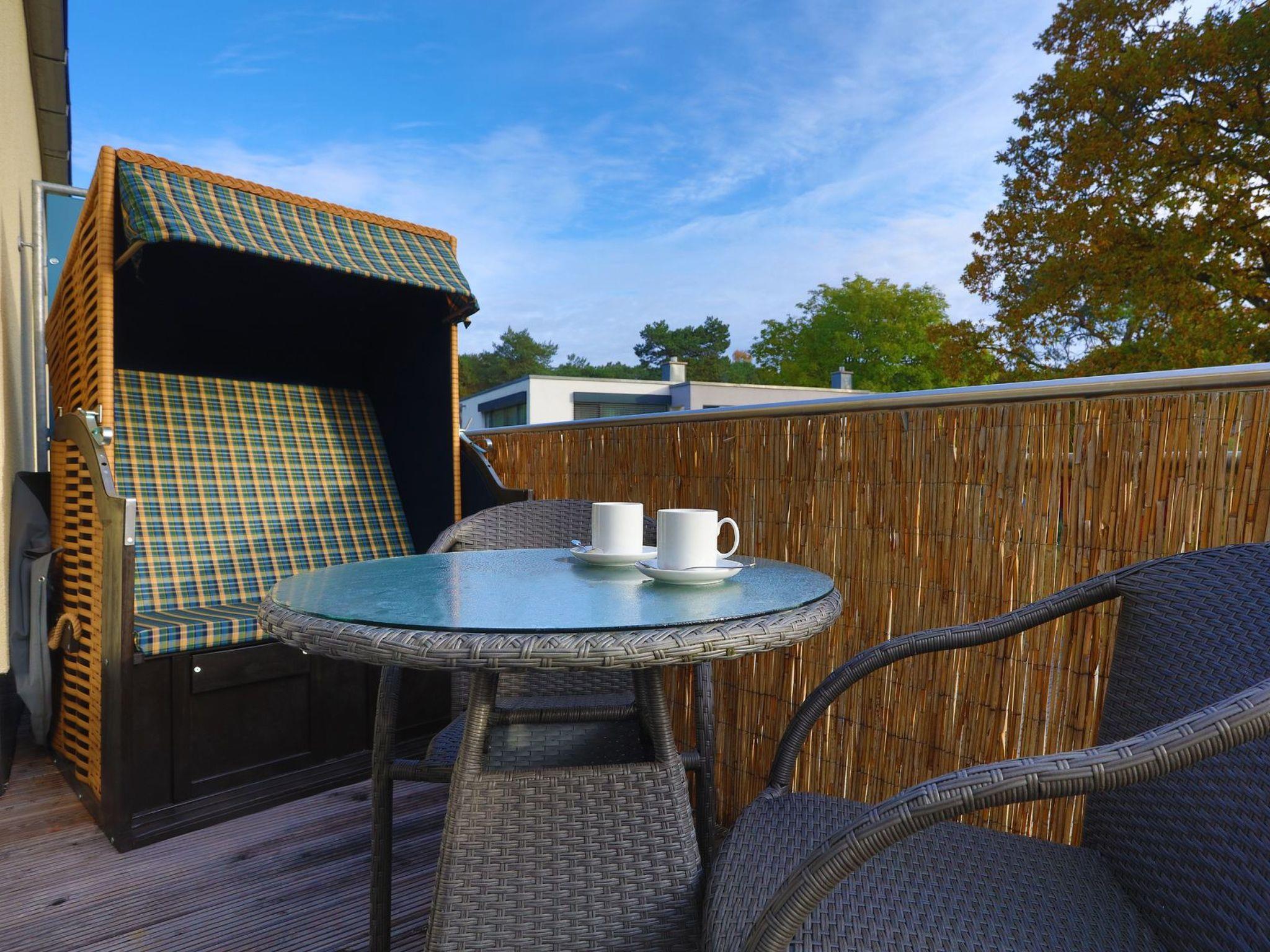 Der Balkon ist mit einem Strandkorb und Korbbestuhlung ausgestattet.