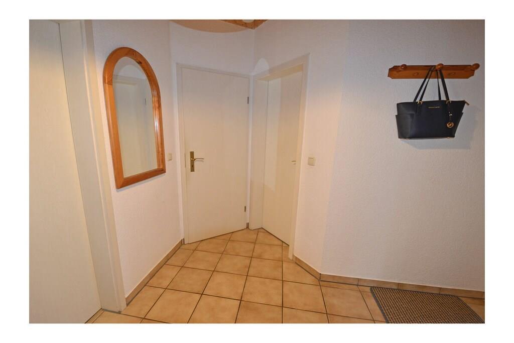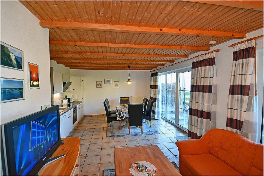 Wohnpark Breege, Parterre, ruhige Lage, ca 900 m zum Sandstrand (Ostsee), ca 500 m zum Hafen Breege gemütliches Wohnzimmer mit Sitzecke, kostenfreies Internet (WLAN) und Couch, TV/ Sat, Radio, komplett ausgestattete Einbauküche mit Essbereich, 4-Plattenherd (Ceranfeld), Backofen, Kühlschrank mit kleinem Gefrierfach, Geschirrspüler, Mikrowelle und diversen Elektrogeräten, 1. Schlafzimmer mit Doppelbett (Matratzen getrennt je 90x200), 2. Schlafzimmer mit 2 Einzelbetten (je 90x200), Bad mit Dusche und WC, Gartenterrasse (16qm) mit Zugang vom Wohnzimmer, Frühstücksterrasse mit Zugang vom Schlafzimmer, jeweils mit Gartenmöbeln ausgestattet, Grillmöglichkeit besteht eigener PKW-Stellplatz am Haus. Ca. 2 km entfernt in Altenkirchen finden Sie einen Netto, das Kaufhaus „Stolz“, Edeka und einen Getränkemarkt. Restaurants und Radverleih sind in der Nähe. Vom ca. 500 m entfernten Hafen sind Ausflugsmöglichkeiten per Schiff zur Insel Hiddensee möglich, optimal für Rad- und Wandertouren, abschließbare Unterstellmöglichkeit für Fahrräder, Haustiere nicht erwünscht