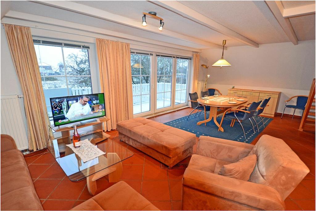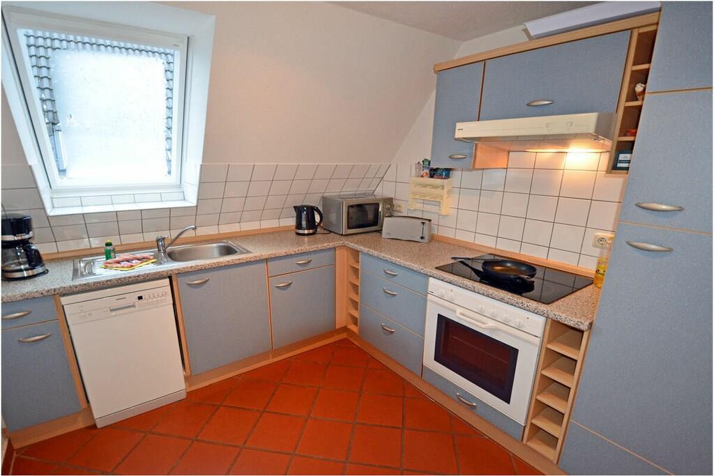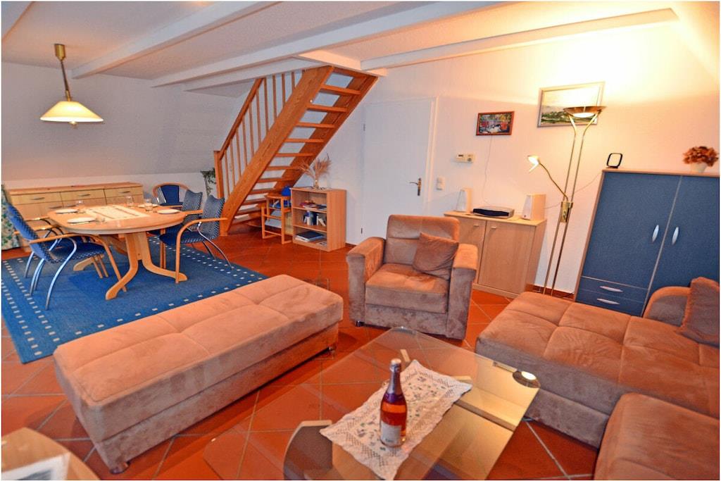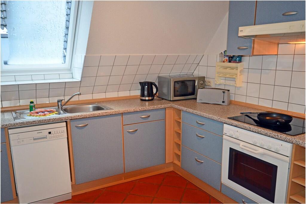 1. Etage: Wohnzimmer mit Ausziehcouch und Essecke, TV/ Sat, Radio/ CD, WLAN, seperate komplett ausgestattete Küche mit 4-Plattenherd (Ceranfeld), Backofen, Geschirrspüler, Mikrowelle und diversen Elektrogeräten, Kühlschrank mit Gefrierfach, 1. Bad mit Dusche/ WC Dachgeschoss: Schlafzimmer mit Doppelbett und Kleiderschrank, 2. Bad mit Dusche/ WC Außenbereich: großer Balkon (Südseite) mit Zugang vom Wohnzimmer, Gartenmöbeln (Gartentisch & Gartenstühle)