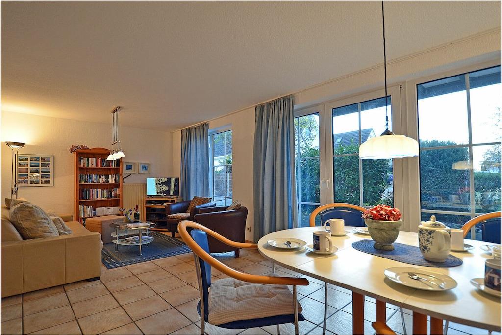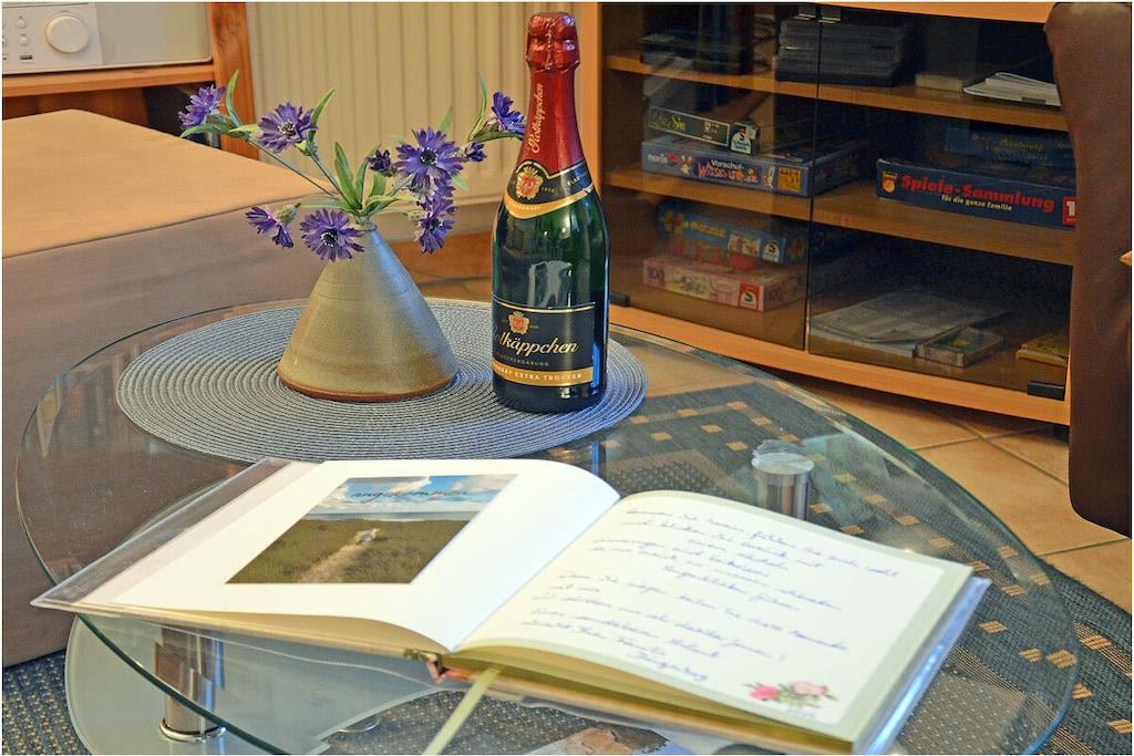 Wohn- Essbereich: gemütlicher Wohnbereich mit Couch, kostenfreies Internet (WLAN), TV/ Sat, DVD-Player, Radio/CD, Büchern und Spiele für gesellige Abende, komplett ausgestattete Einbauküche mit Essbereich, Herd (Ceranfeld), Backofen, Kühlschrank mit kleinem Gefrierfach, Geschirrspüler, Mikrowelle und Kaffeeautomat. 1. Schlafzimmer: mit Doppelbett (je 90×200) und Kleiderschrank, Insektenschutz 2. Schlafzimmer: mit Tandembett (je 80×200) und Kleiderschrank, Insektenschutz Badezimmer: mit Dusche, Waschbecken, Waschmaschine, Föhn und Spiegel Flur: große Terrasse: vorm Haus mit Loungemöbeln kleine Terrasse: hinterm Haus mit Gartenmöbeln für 4 Personen, Sonnenschirm,