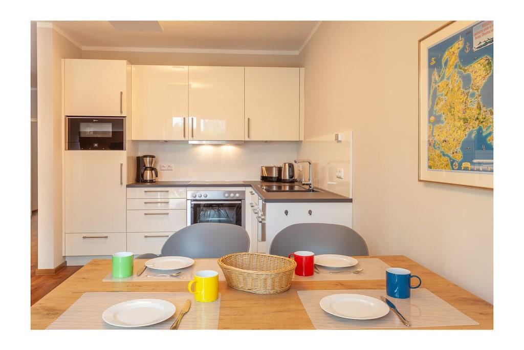 Parterre: neue moderne Ferienwohnung mit offener voll eingerichteter Küche mit 4-Plattenherd (Ceran), Backofen, Mikrowelle, Kühlschrank mit kleinem Gefrierfach, Geschirrspüler und diversen Elektrogeräten (z.B. Kaffeemaschine, Wasserkocher, Toaster), großzügiger Ess- und Wohnbereich mit TV/Sat (Flatscreen) und kostenfreiem WLAN, Bücher und Gesellschaftsspiele für gemütliche Abende vorhanden. Das Badezimmer ist mit Regendusche und WC ausgestattet. 1. Schlafzimmer mit einem Doppelbett (getrennte Matratzen je 90 x 200), Kleiderschrank und Kommode, 2. Schlafzimmer mit zwei Einzelbetten (je 90 x 200) und Kommode, Flur mit Garderobe, Hauswirtschaftsraum mit Waschmaschine und Wäscheständer. Außenbereich: 25m² große Terrasse mit Gartenmöbel für 4 Personen Erstvermietung Mai 2019 – Urlaub im schönen Seebad Breege/ Juliusruh! Die Wohnung ist eine Nichtraucherwohnung und ist nach Süden und Westen ausgerichtet. Internet/ WLAN steht kostenfrei zur Verfügung. Alle Räume sind mit Fußbodenheizung ausgestattet. Die Fenster sind mit elektrisch bedienbaren Rollläden verdunkelbar. Im Schlafzimmer und im Wohnbereich sind Fliegenschutzgitter. Eine abschließbare Remise kann für das Abstellen von Fahrrädern genutzt werden. Ein PKW- Stellplatz am Haus ist vorhanden. Auf der Terrasse haben Sie die Möglichkeit zu grillen. Haustiere mit Rücksicht auf Allergiker leider nicht gestattet!