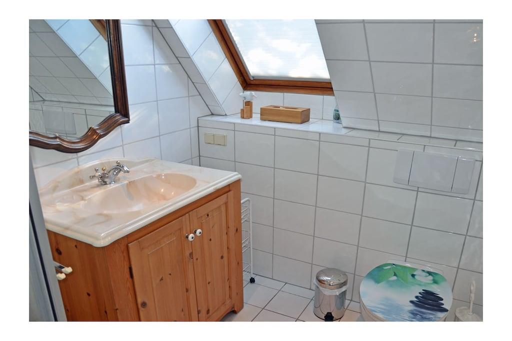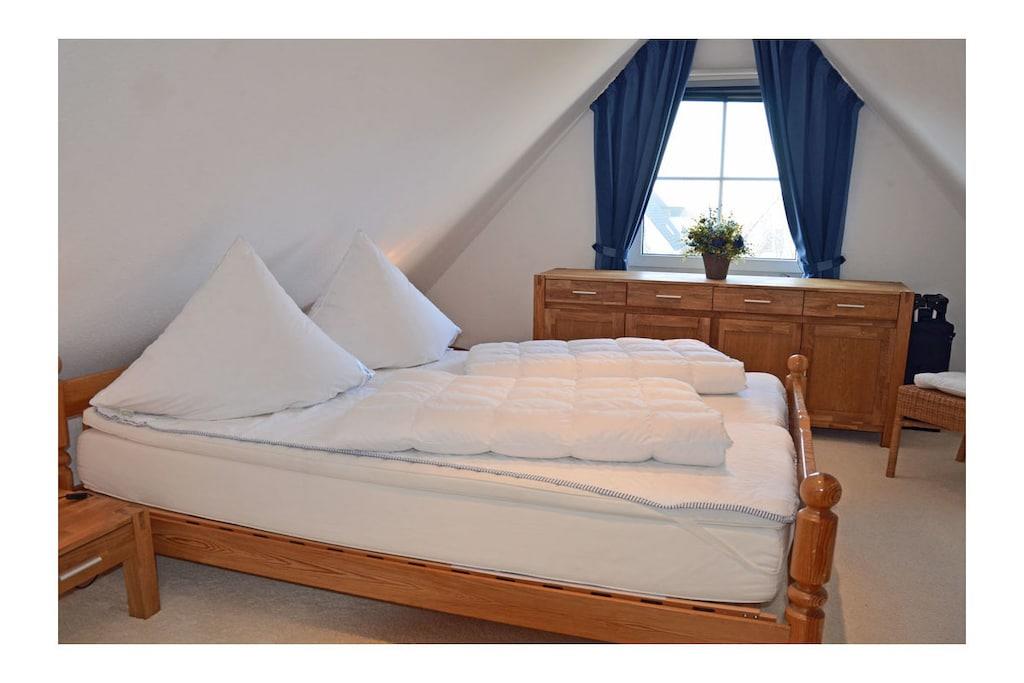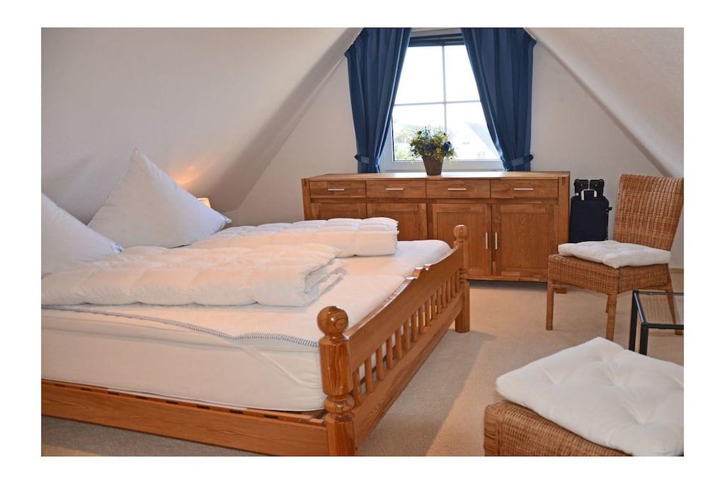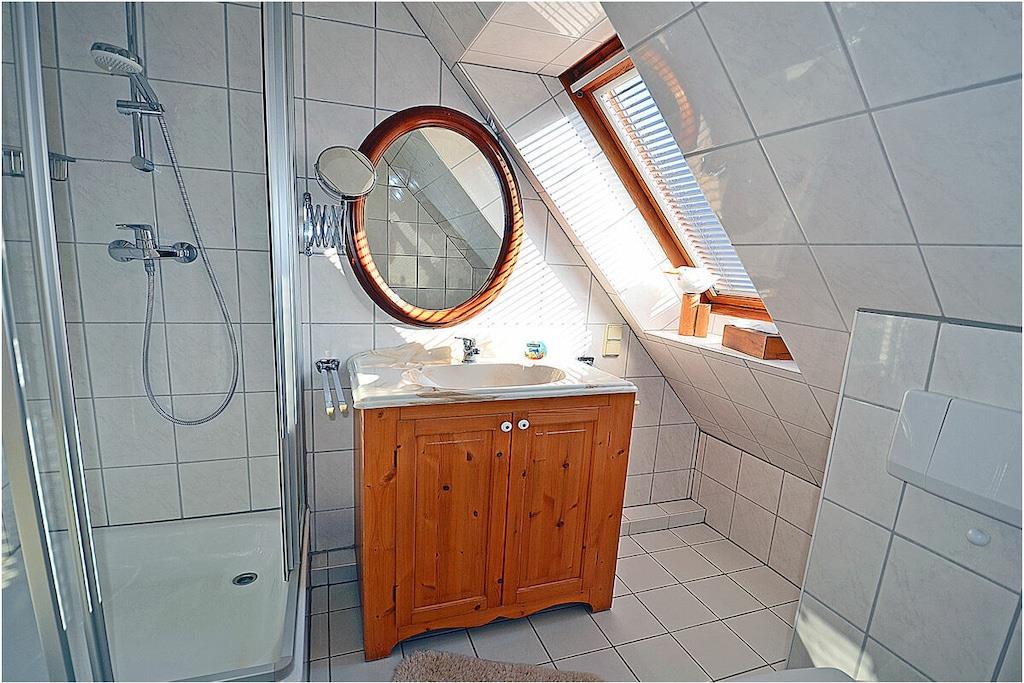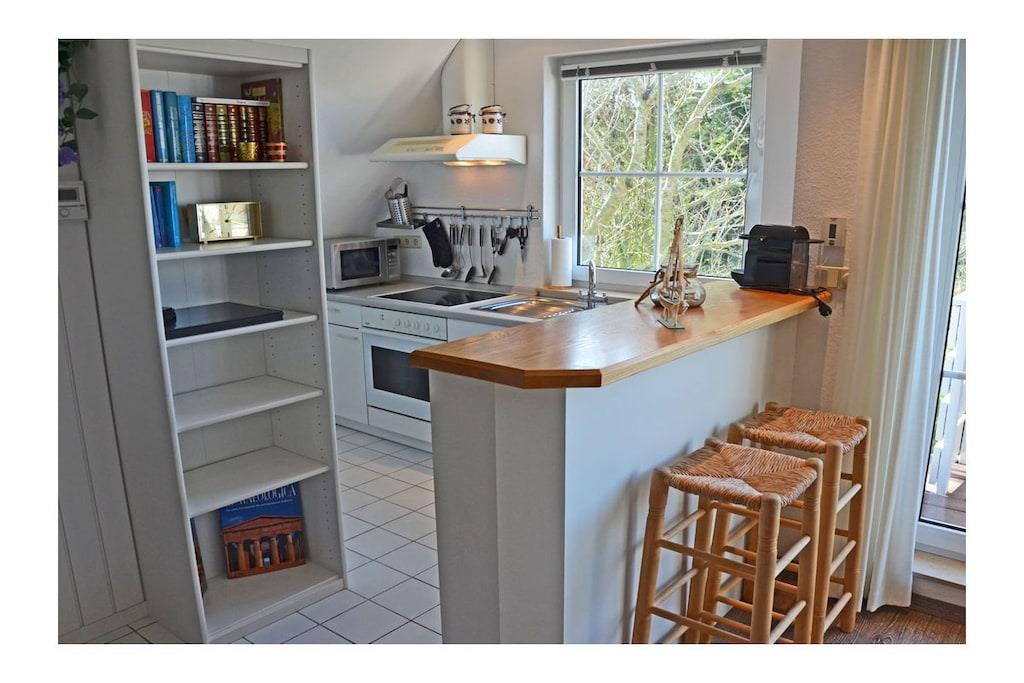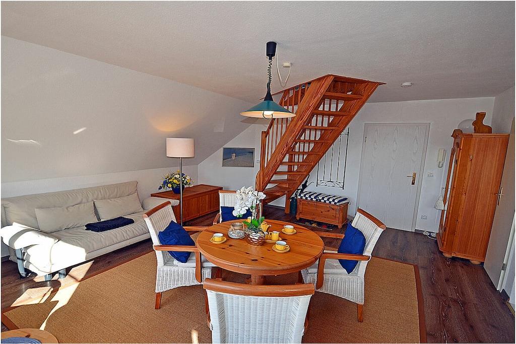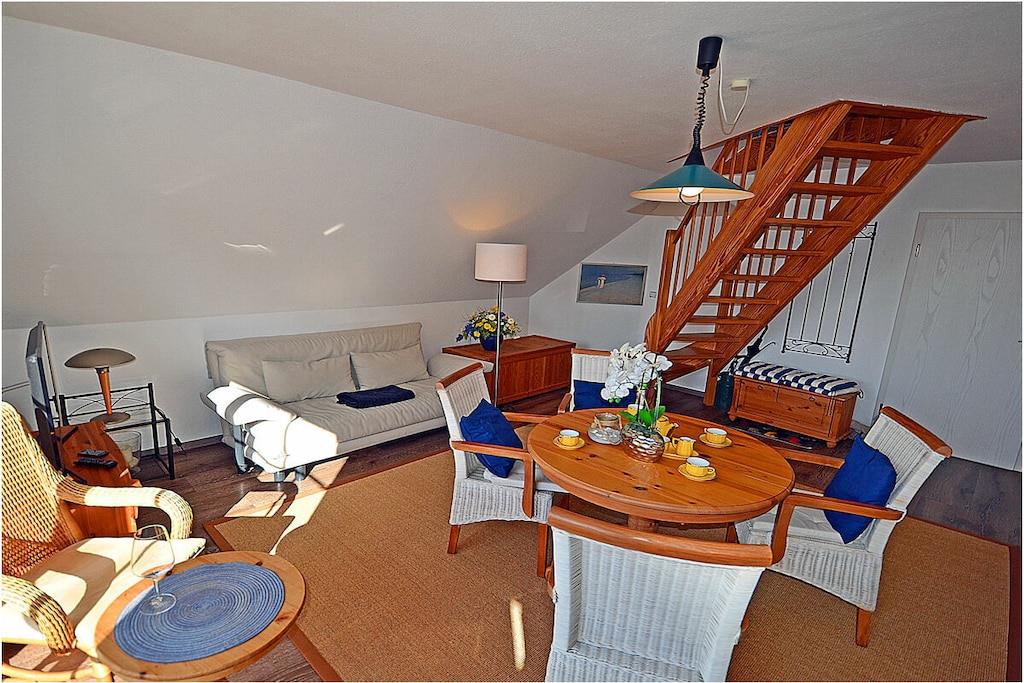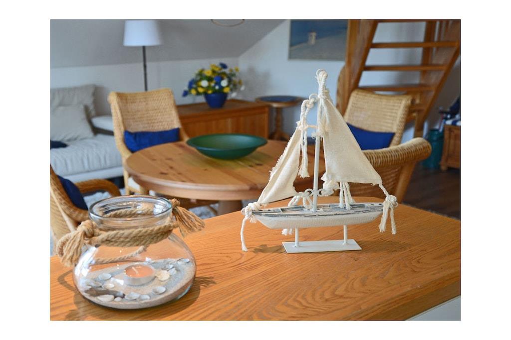 Eine liebevoll eingerichtete Ferienwohnung mit ca. 55 m², bietet Platz für 2 Personen, lichtdurchfluteter Wohn- Essbereich mit gemütlicher Couch (Schlaffunktion 160 x 200), TV/ Sat (Flachbildschirm), Radio mit CD, komplett ausgestattete Küche mit 4- Plattenherd (Ceranfeld), Backofen, Mikrowelle, Kühlschrank mit kleinem Gefrierfach und Geschirrspüler, Gäste-Bad mit Dusche und WC, Waschmaschine und Trockner vorhanden (ohne Gebühr), Sauna lädt zum Entspannen ein, Balkon mit Tisch und Gartenstühlen, Sonnenschirm, im Obergeschoss befinden sich 1 Schlafzimmer mit Doppelbetten (180 x 200/ 2 Einzelmatratzen) und Sideboard, Bad mit Dusche und WC Besonderes: Entspannungsurlaub zwischen Bodden und Meer Sauna, Waschmaschine und Trockner (ohne Gebühr), Fenster mit Insektenschutz, eigener PKW-Stellplatz am Haus, Fahrradabstellmöglichkeit (Schuppen) vorhanden, Nichtraucherwohnung. Ca. 2 km entfernt in Altenkirchen finden Sie einen Netto, das Kaufhaus „Stolz“, Edeka und einen Getränkemarkt. Restaurants und Radverleih sind in der Nähe. Vom ca. 500 m entfernten Hafen sind Ausflugsmöglichkeiten per Schiff zur Insel Hiddensee und zu den Störtebeker-Festspielen möglich, Segelschule, optimale Rad- und Wandermöglichkeiten, Haustiere nicht erwünscht