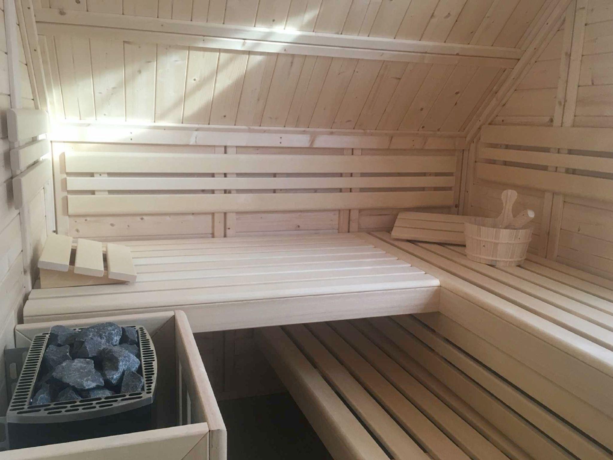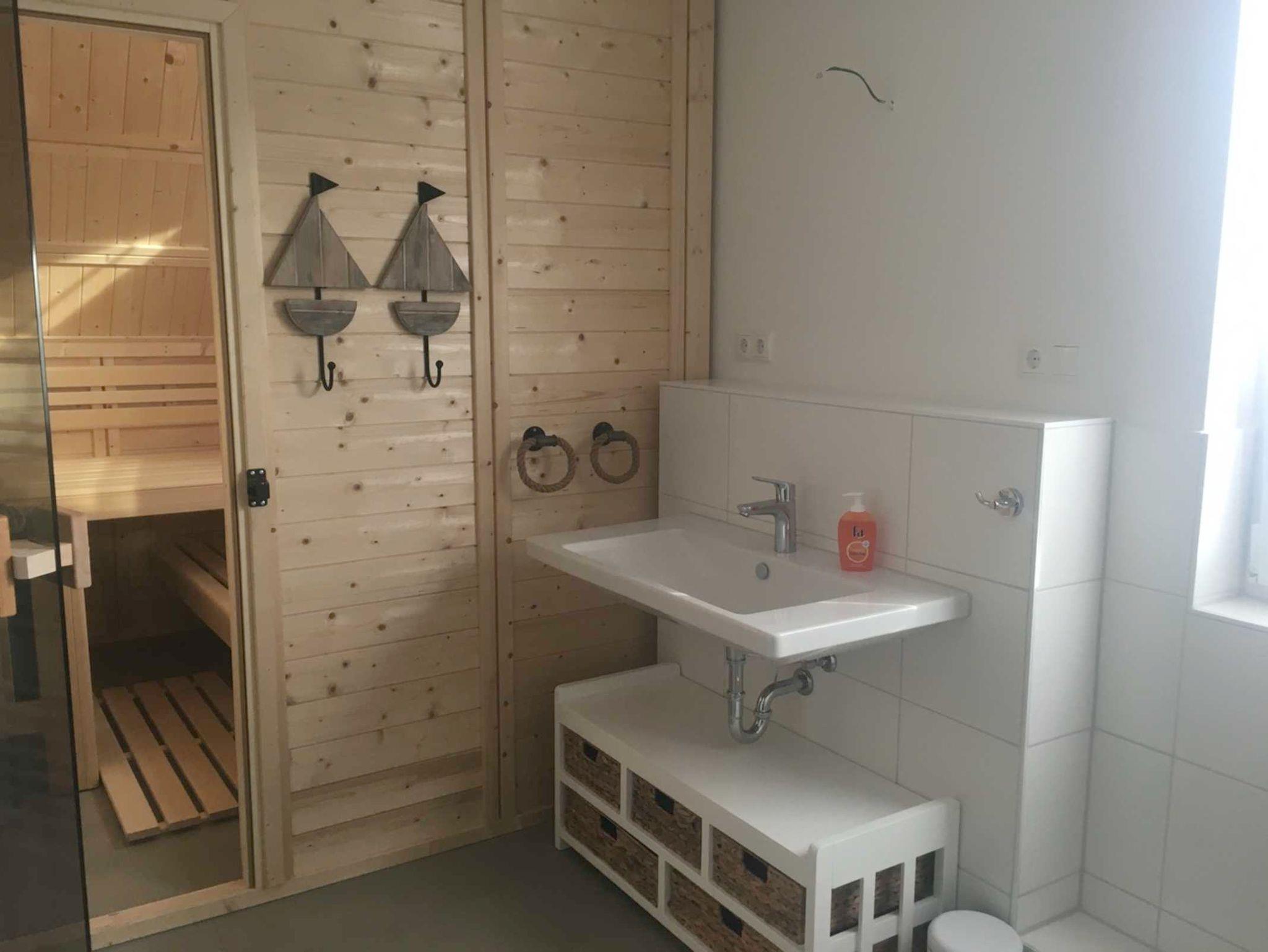 Nach einem langen Spaziergang im Winter können Sie sich in der großzügigen Sauna, im Bad OG, aufwärmen und anschließend auf dem Balkon die frische Luft genießen.