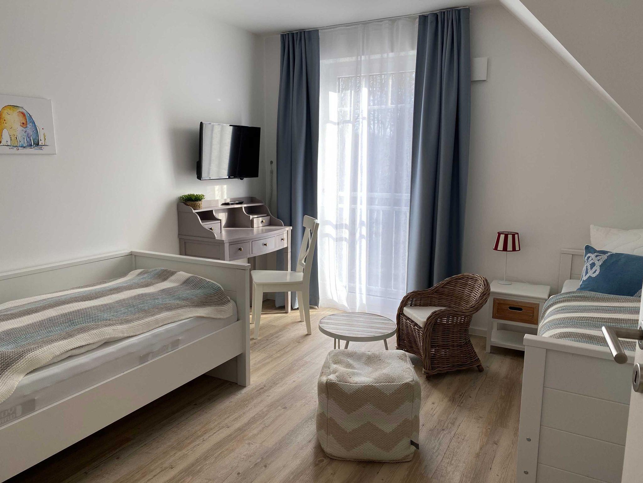 Im OG befinden sich zwei weitere Schlafzimmer, eins mit einem Doppelbett (180x200) und das andere mit zwei einzelnen Kojenbetten (90x200). In beiden Schlafzimmern finden Sie auch je einen Fernseher.