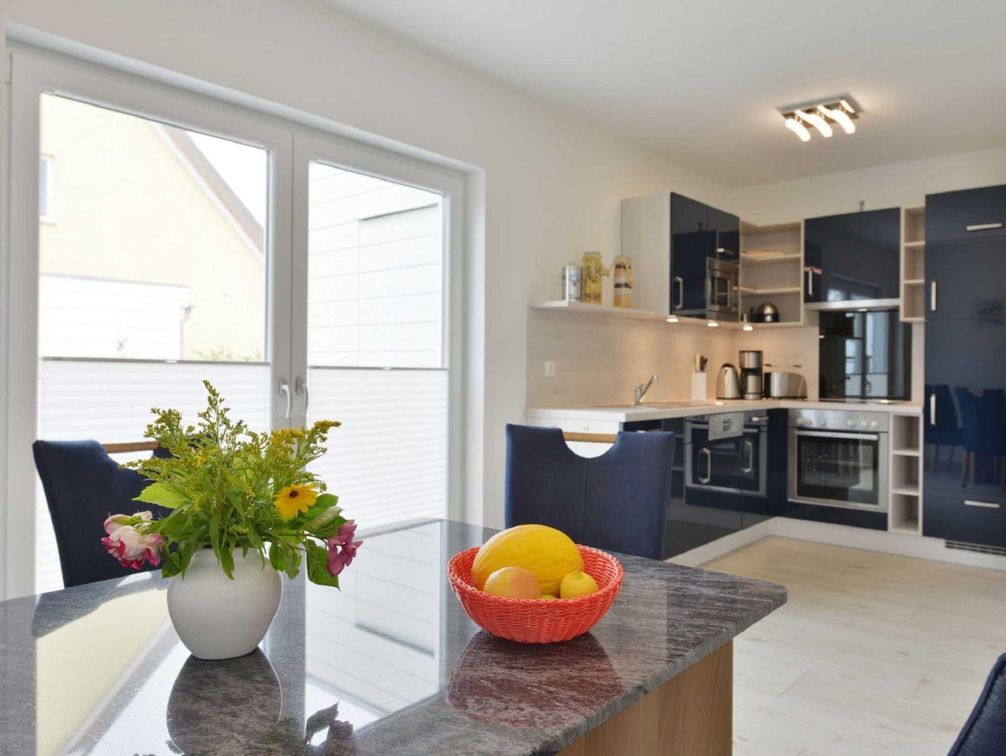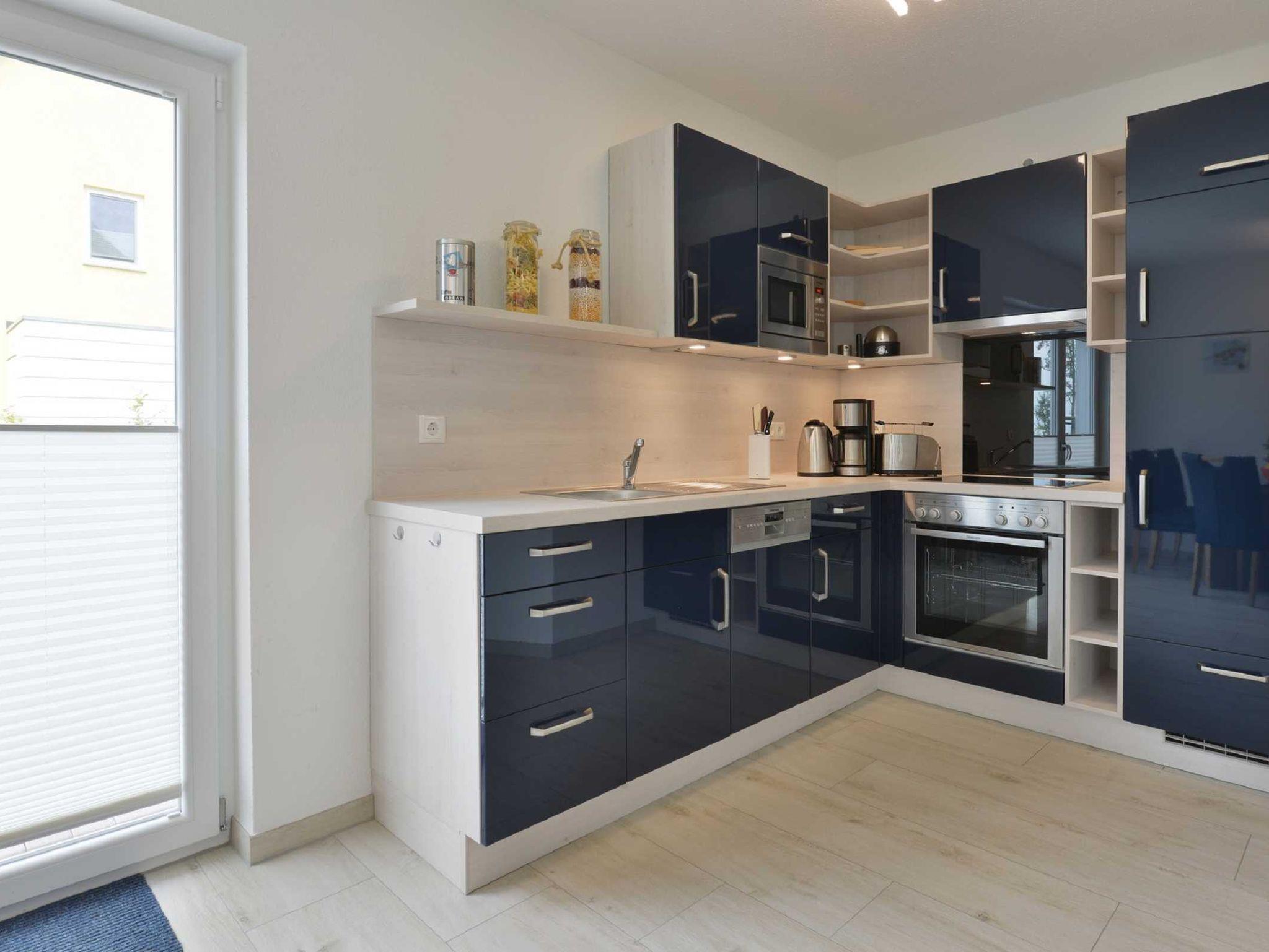 Küche mit Spülmaschine, Mikrowelle, Kühlschrank mit Gefriermöglichkeit, Kaffeemaschine, Wasserkocher, Toaster