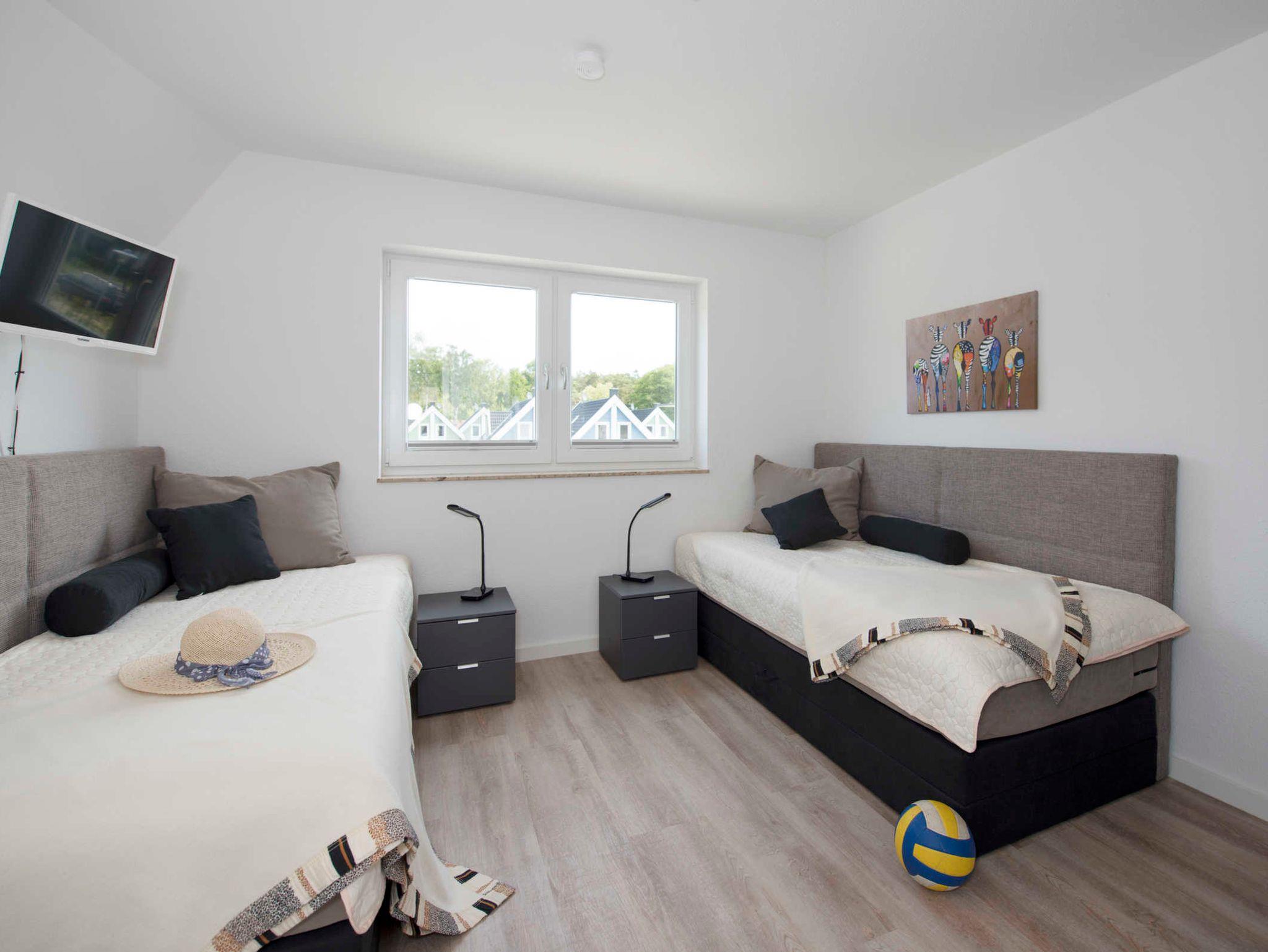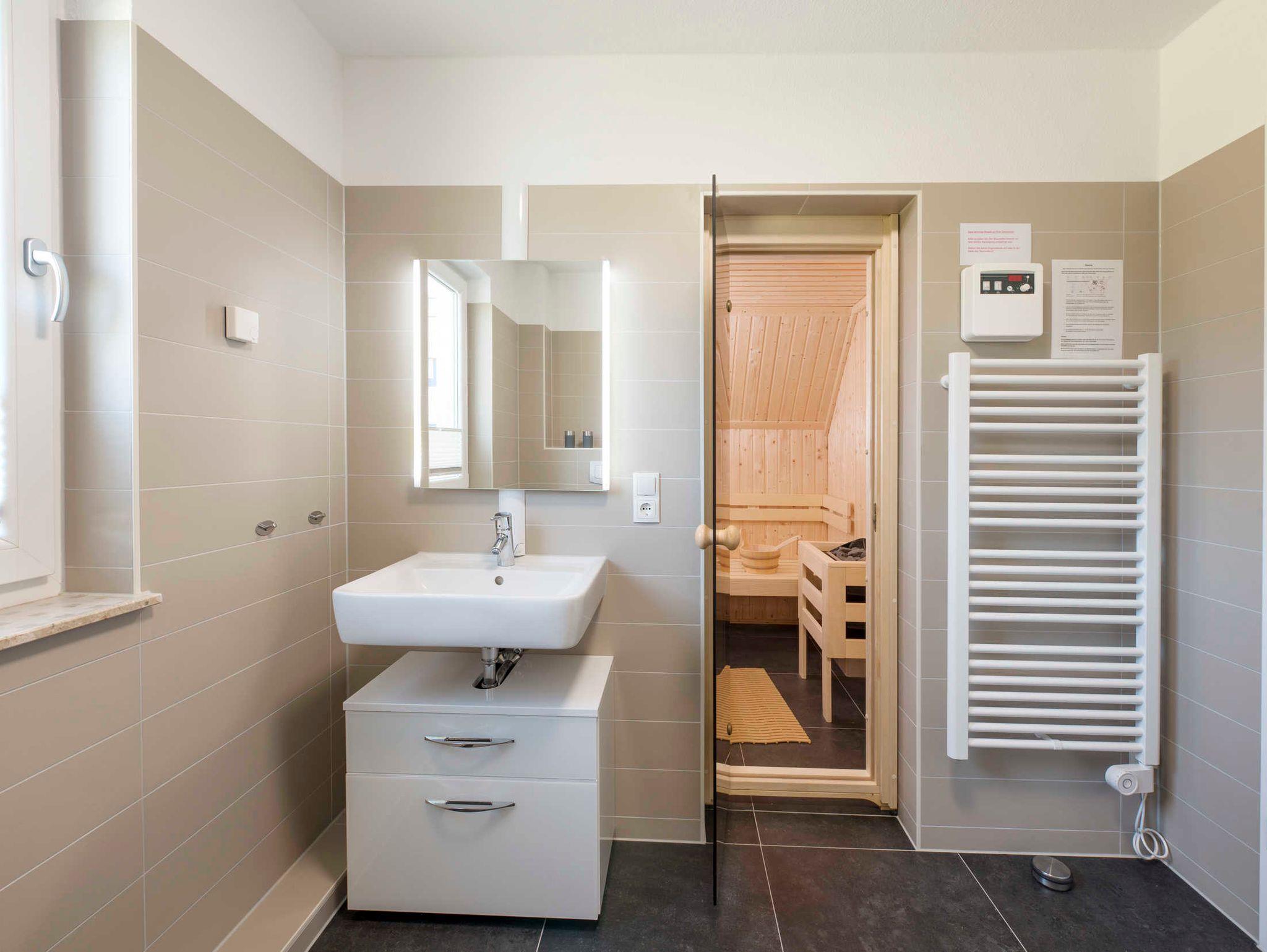 Die hochwertige Ausstattung wird komplementiert durch eine Sauna, in der 4 Person bequem Platz finden. Außerdem sind zwei Bäder mit Dusche vorhanden.