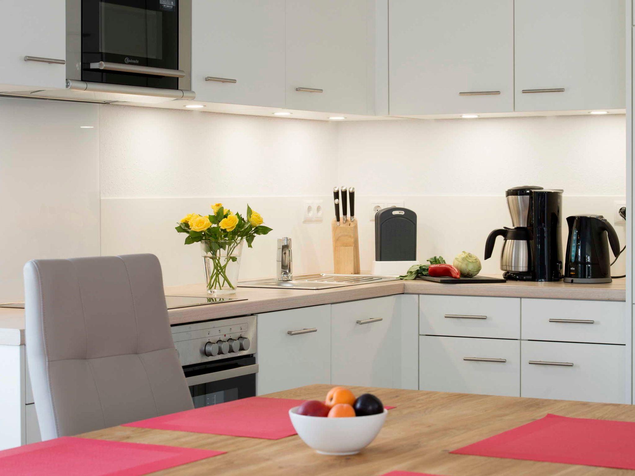 Küche mit Mikrowelle, Toaster, Geschirrspülmaschine