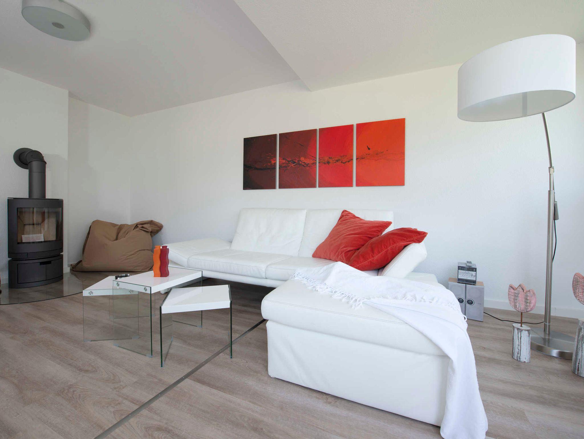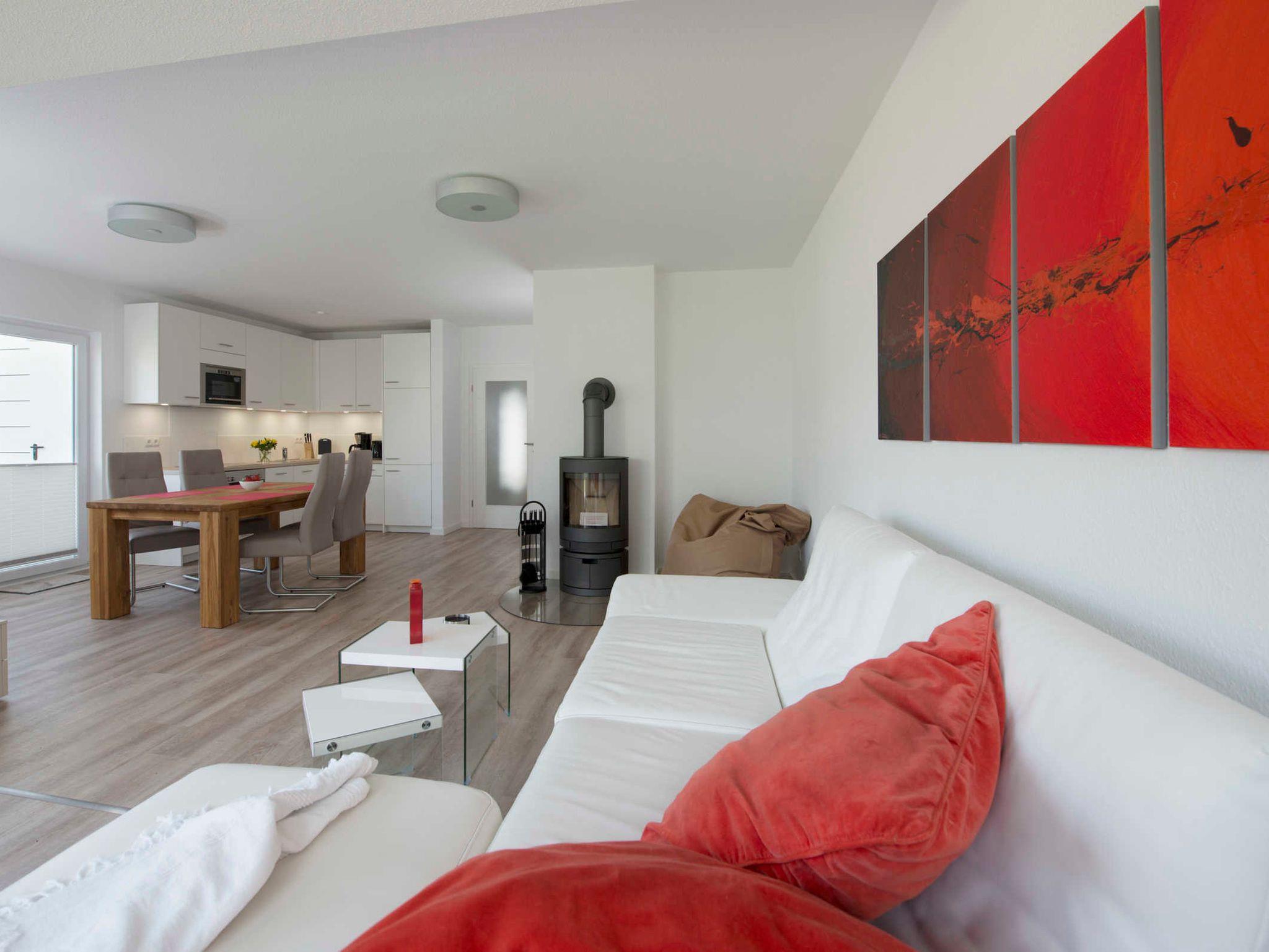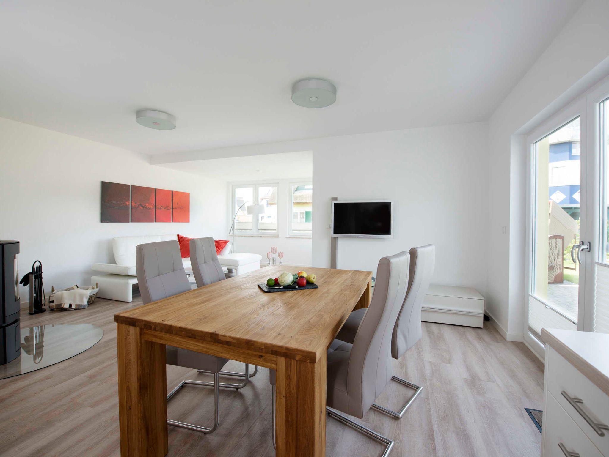 In drei Schlafzimmern finden sechs Personen himmlische Ruhe. Im großzügigen Wohn- und Essbereich mit angrenzender Terrasse finden Sie neben einer vollausgestatteten Küche einen gemütlichen Sitzbereich mit Couch, Sitzsack und Kamin.