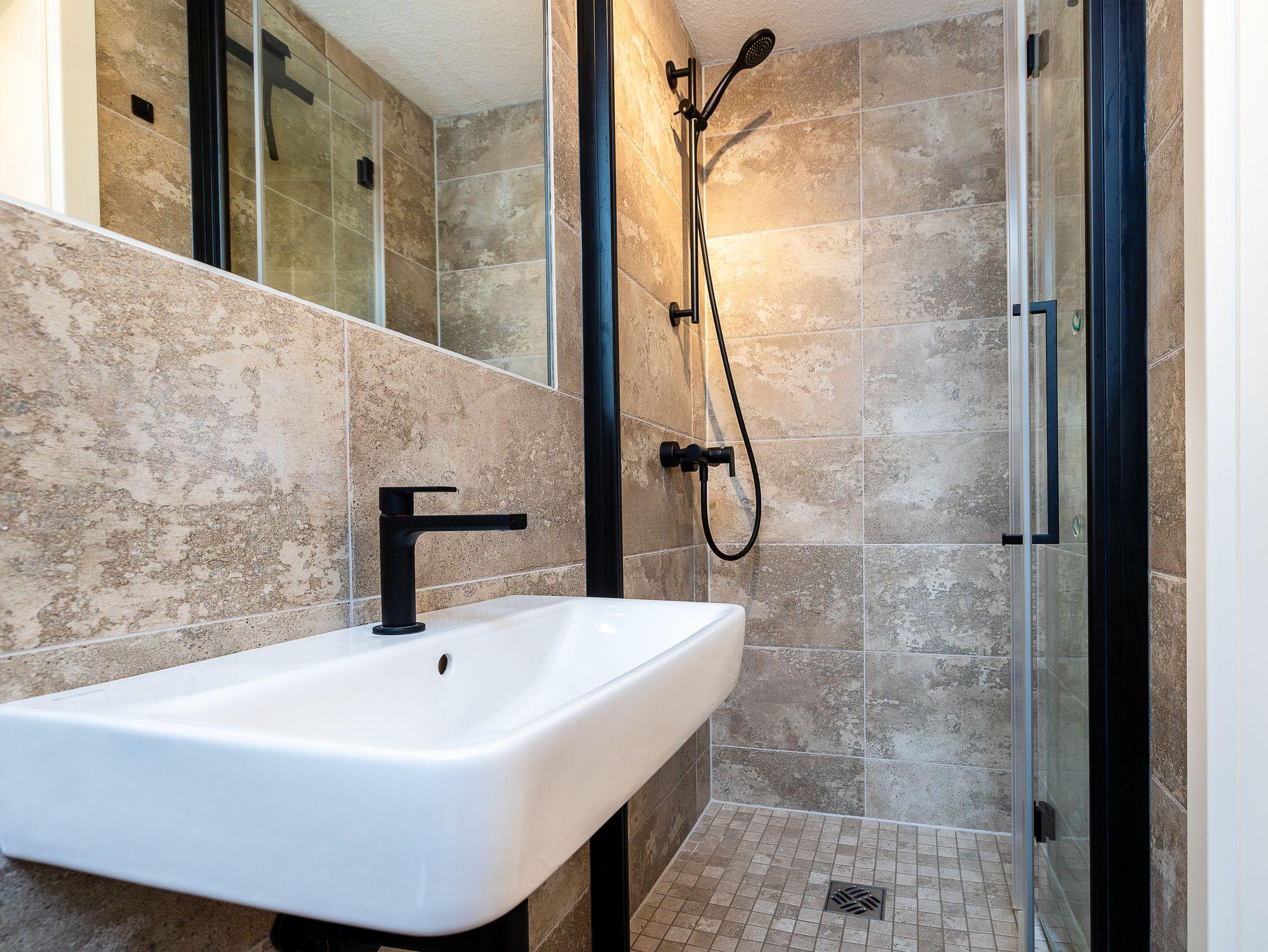 Das neu modern gestaltete Badezimmer überzeugt mit einer komfortablen, ebenerdigen Dusche und einem klaren, zeitgemäßen Design. Ein zusätzliches Gäste-WC ergänzt die Ausstattung.