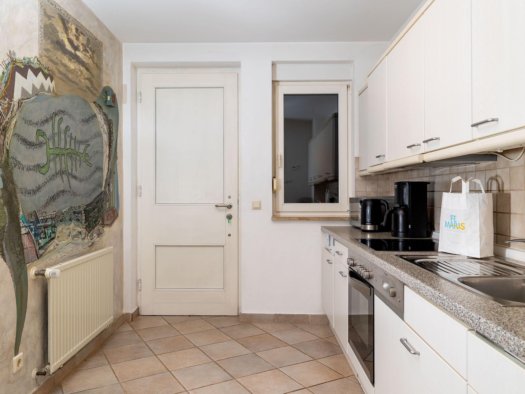Küche mit Spülmaschine, Mikrowelle, Kühlschrank mit Gefriermöglichkeit, Kaffeemaschine, Wasserkocher, Toaster