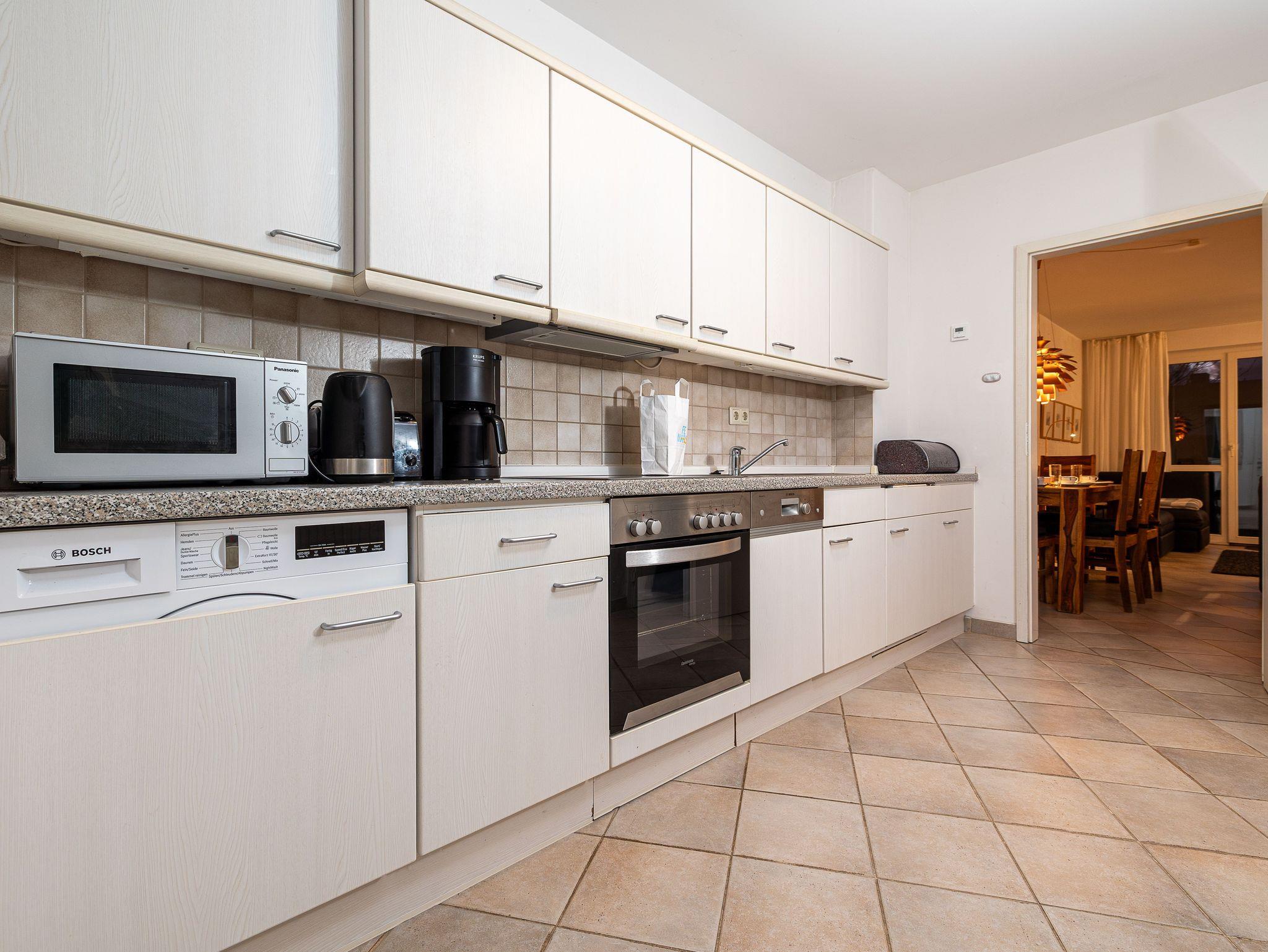 Der helle Wohnbereich öffnet sich direkt zur Terrasse und schafft eine freundliche Atmosphäre, die sich wunderbar ins Freie verlängert perfekt für ein Frühstück in der Morgensonne oder ruhige Momente an der frischen Luft. Die bestens ausgestattete Küche ermöglicht das mühelose Zubereiten gemeinsamer Mahlzeiten.