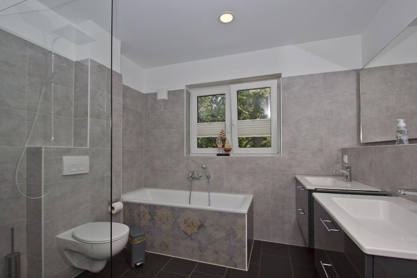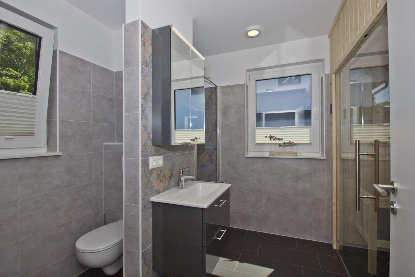 BAD // 2 Bäder, ein Tageslichtbadezimmer im EG mit ebenerdiger Dusche, WC, Waschtisch und Sauna, zweites Tageslichtbadezimmer im OG mit ebenerdiger Dusche, Badewanne, Doppelwaschbecken und WC ++