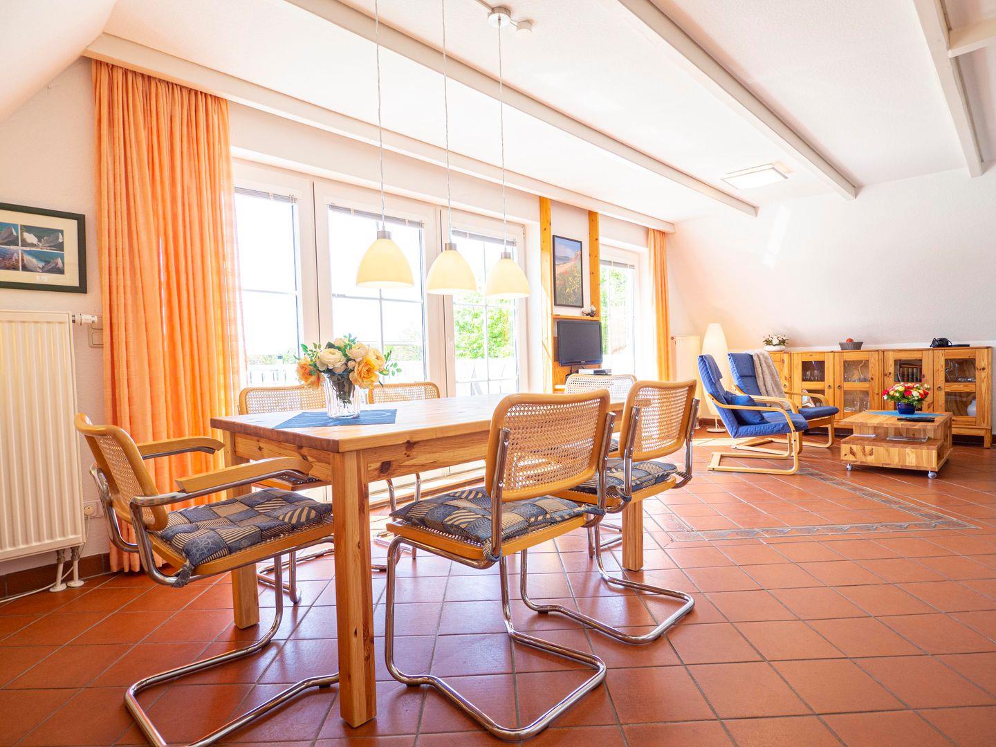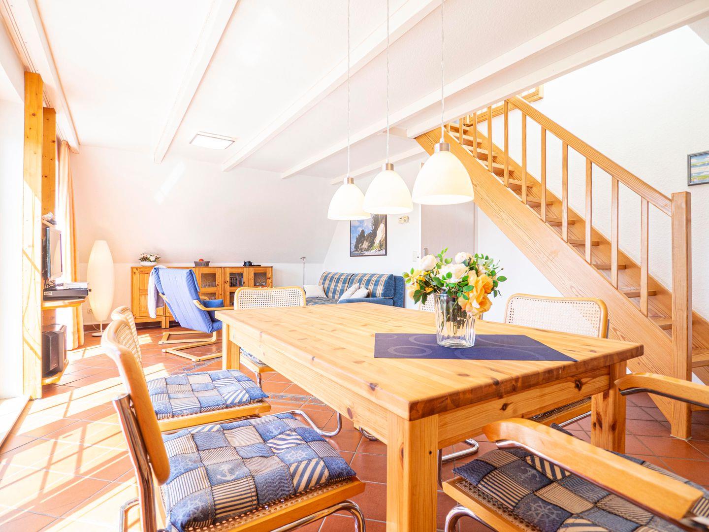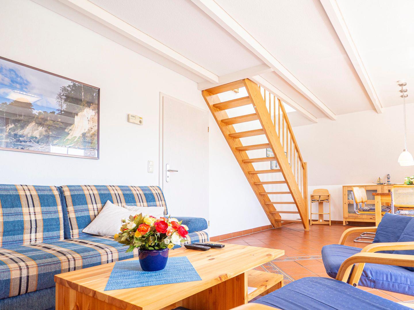 Die Ferienwohnung "Meeresrauschen" befindet sich im 1.OG links, hat ca. 70qm Wohnfläche und bietet Platz für bis zu 6 Personen. Sie erstreckt sich über 2 Etagen. Im OG liegt der lichtdurchflutete Wohn- und Essbereich (ca. 28 qm) mit großzügigem Südbalkon, Sitzecke mit Schlafcouch und Sesseln, SAT-TV, Radio/CD/DVD. Es gibt einen Essplatz mit großem 6eckigen Esstisch und 6 Stühlen. Die abgeschlossene Küche ist ausgestattet mit einem Kühlschrank mit Gefrierfach, 4-Platten Ceranfeld, Backofen, Geschirrspüler, Kaffeemaschine, Wasserkocher, Toaster, Töpfen und Pfannen. Das Bad bietet Dusche, WC und Haartrockner. Im Dachgeschoß (über wohnungsinterne Treppe verbunden) gibt es zwei abgeschlossene Schlafräume mit je einem Doppelbett. Zur Wohnung gehört ein Pkw-Stellplatz am Haus. Am Objekt gibt es eine abschließbare Fahrradunterstellmöglichkeit.