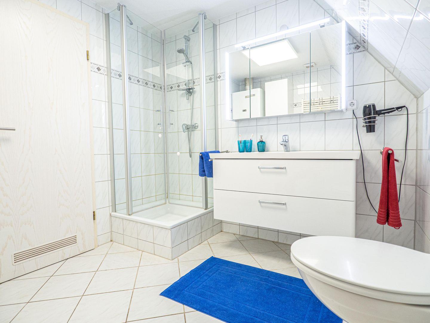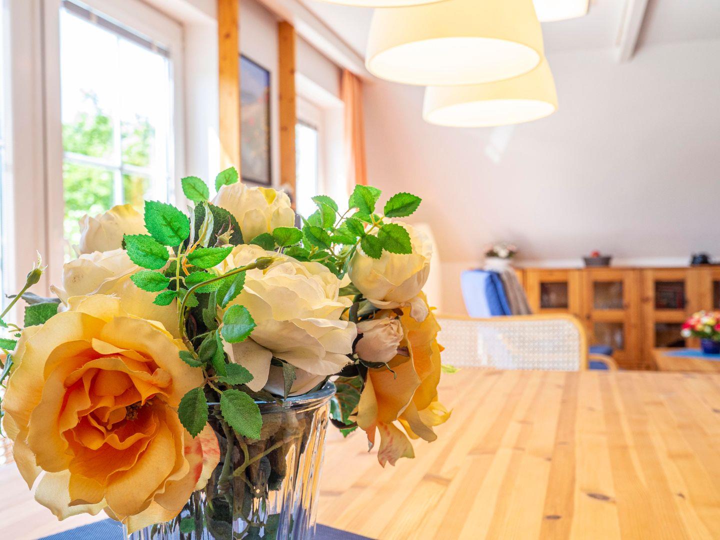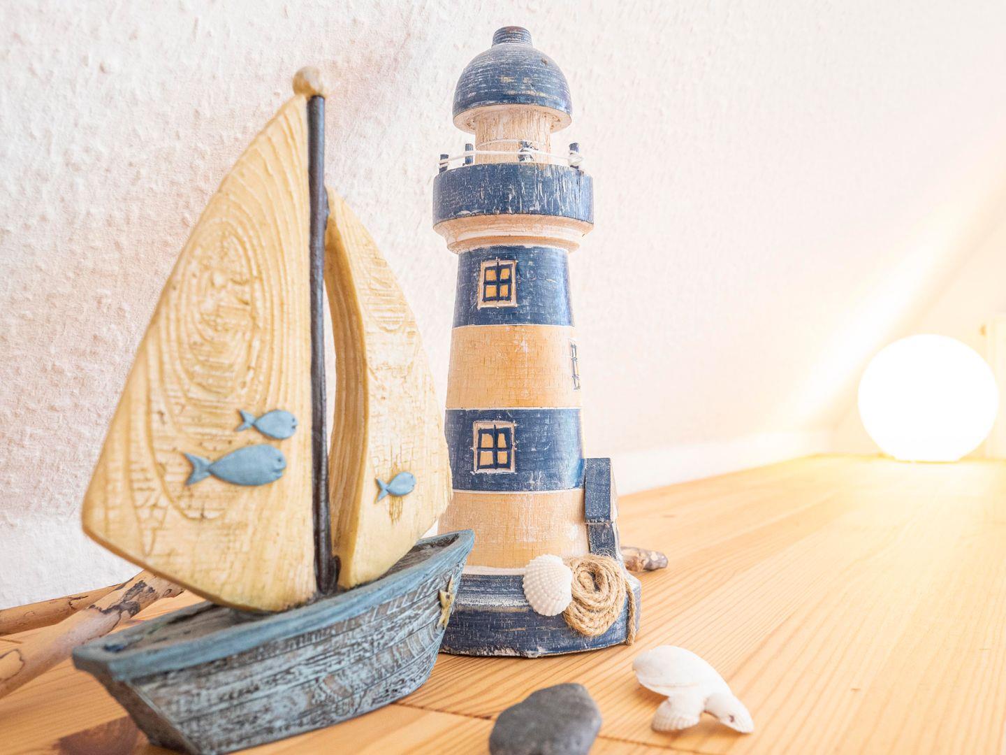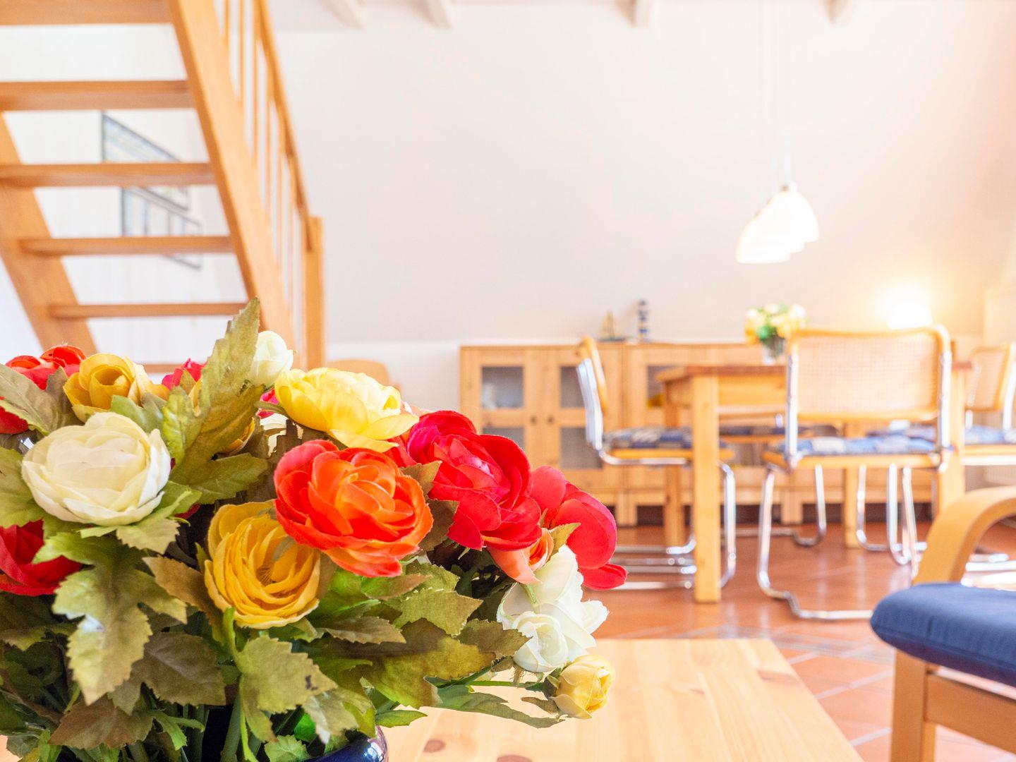 Die Ferienwohnung "Meeresrauschen" befindet sich im 1.OG links, hat ca. 70qm Wohnfläche und bietet Platz für bis zu 6 Personen. Sie erstreckt sich über 2 Etagen. Im OG liegt der lichtdurchflutete Wohn- und Essbereich (ca. 28 qm) mit großzügigem Südbalkon, Sitzecke mit Schlafcouch und Sesseln, SAT-TV, Radio/CD/DVD. Es gibt einen Essplatz mit großem 6eckigen Esstisch und 6 Stühlen. Die abgeschlossene Küche ist ausgestattet mit einem Kühlschrank mit Gefrierfach, 4-Platten Ceranfeld, Backofen, Geschirrspüler, Kaffeemaschine, Wasserkocher, Toaster, Töpfen und Pfannen. Das Bad bietet Dusche, WC und Haartrockner. Im Dachgeschoß (über wohnungsinterne Treppe verbunden) gibt es zwei abgeschlossene Schlafräume mit je einem Doppelbett. Zur Wohnung gehört ein Pkw-Stellplatz am Haus. Am Objekt gibt es eine abschließbare Fahrradunterstellmöglichkeit.