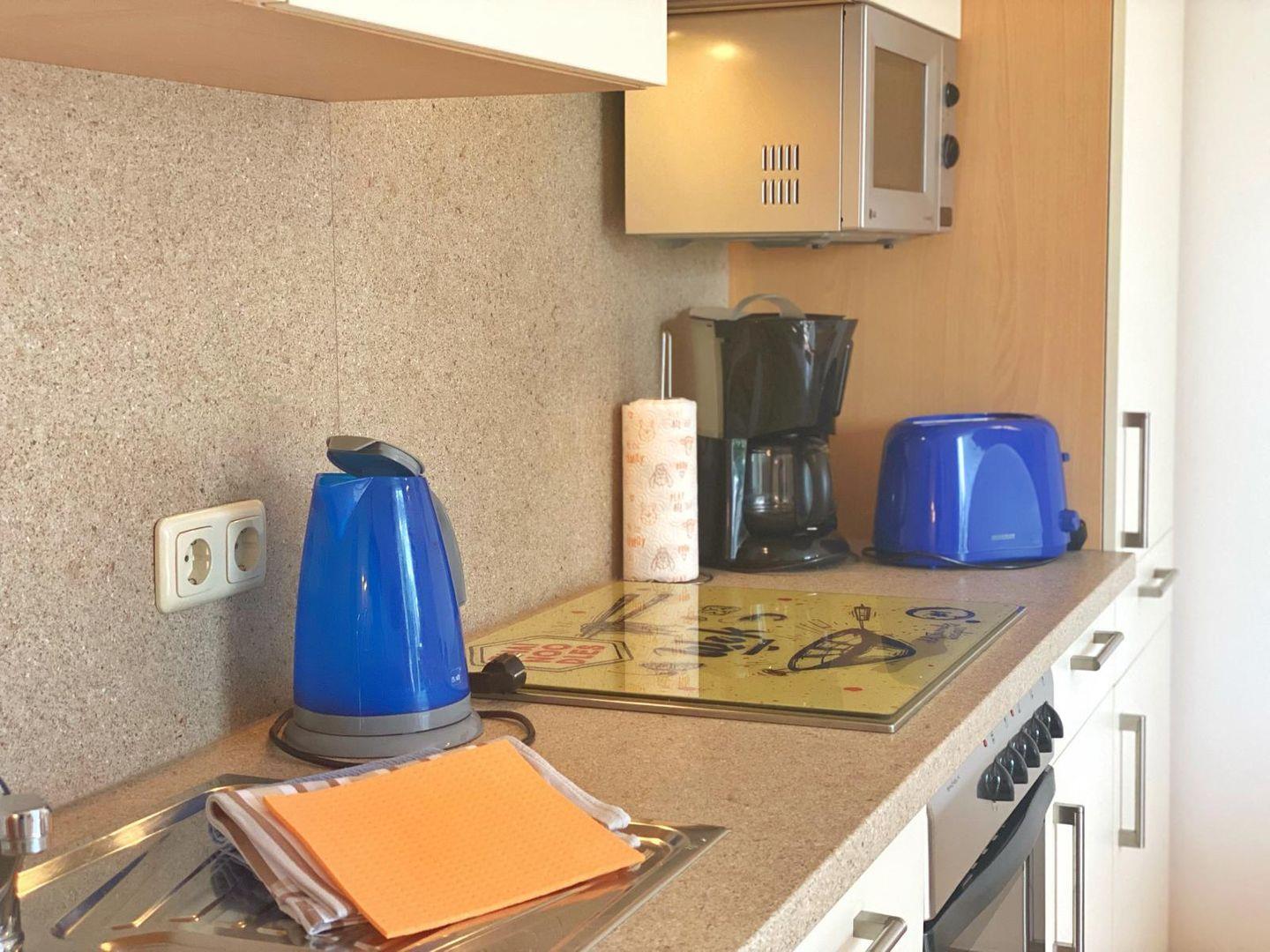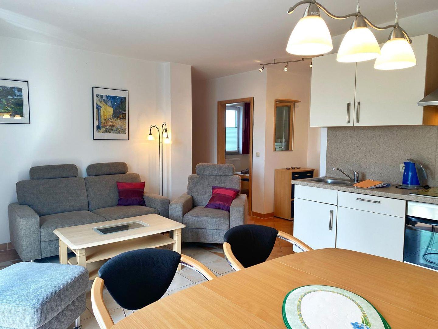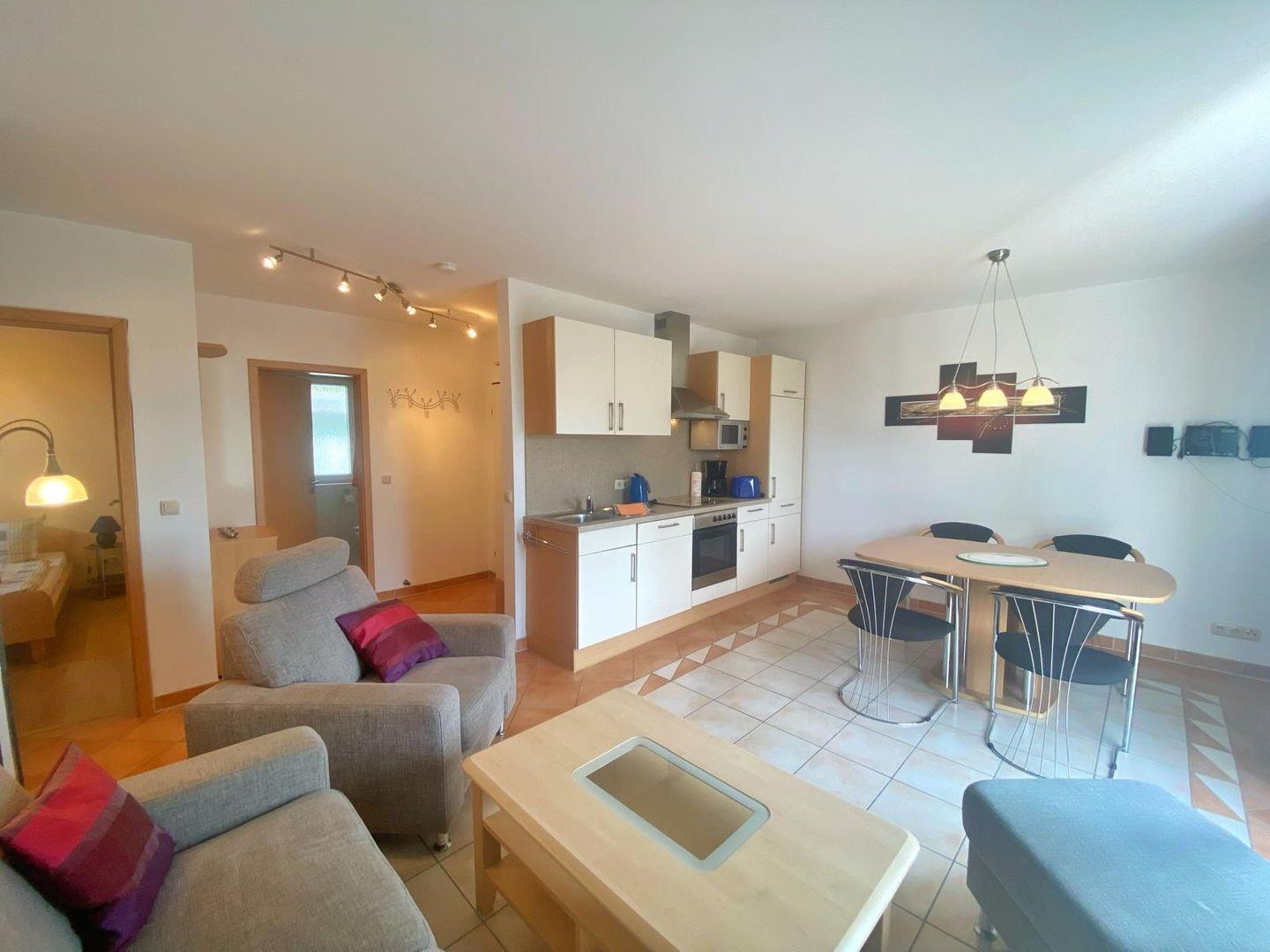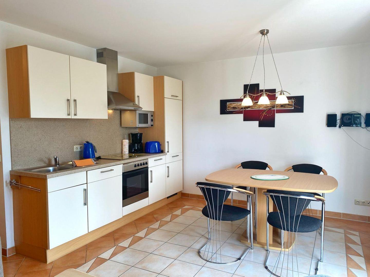 In das Wohnzimmer mit vorgelagerter Terrasse ist eine komplett ausgestattete Küche integriert. Die offene Küche verfügt über Geschirrspüler, Mikrowelle, Ceranfeld, Backofen, Kühlschrank mit Gefriermöglichkeit und natürlich über Kaffeemaschine, Toaster und Wasserkocher.