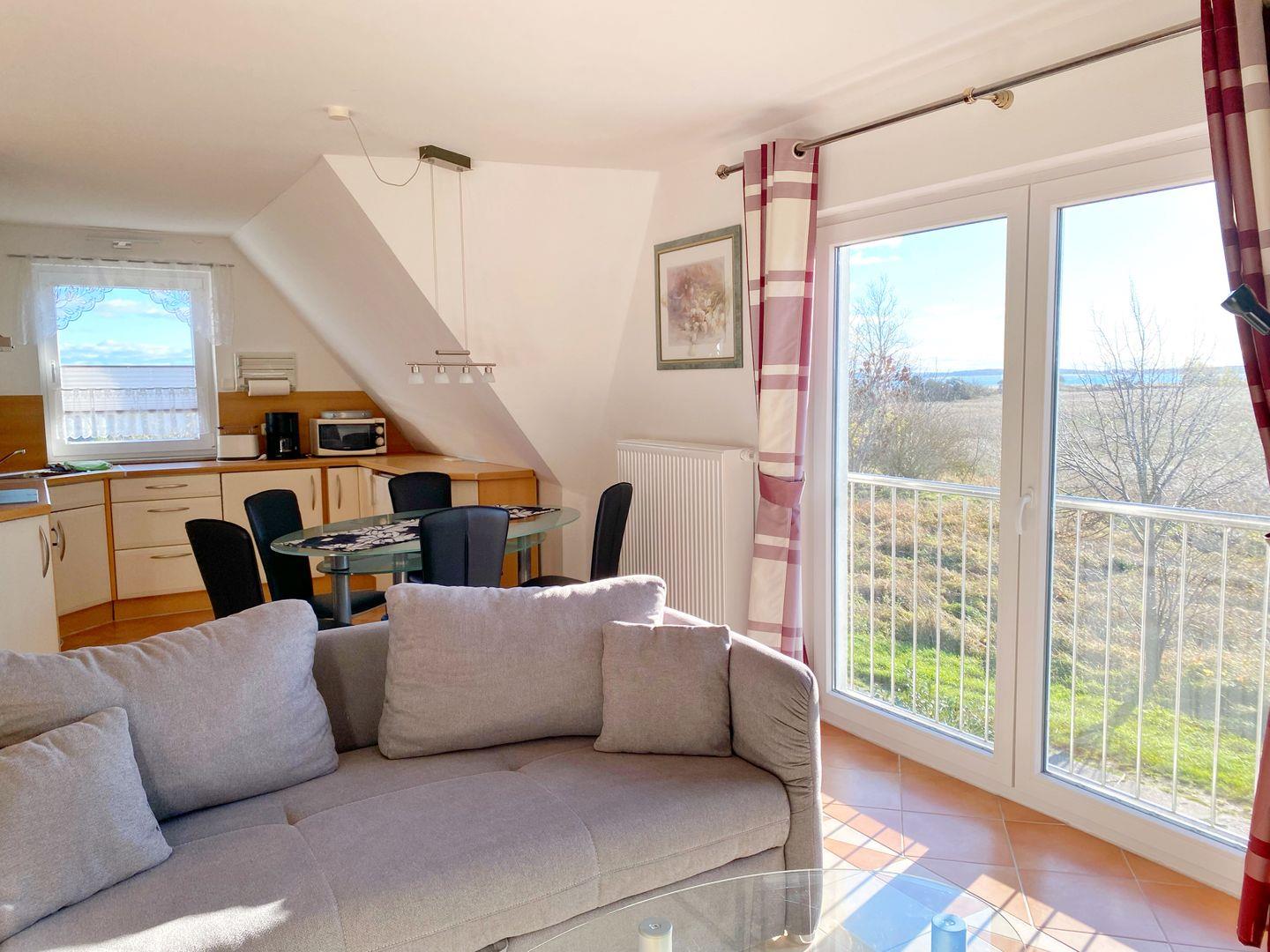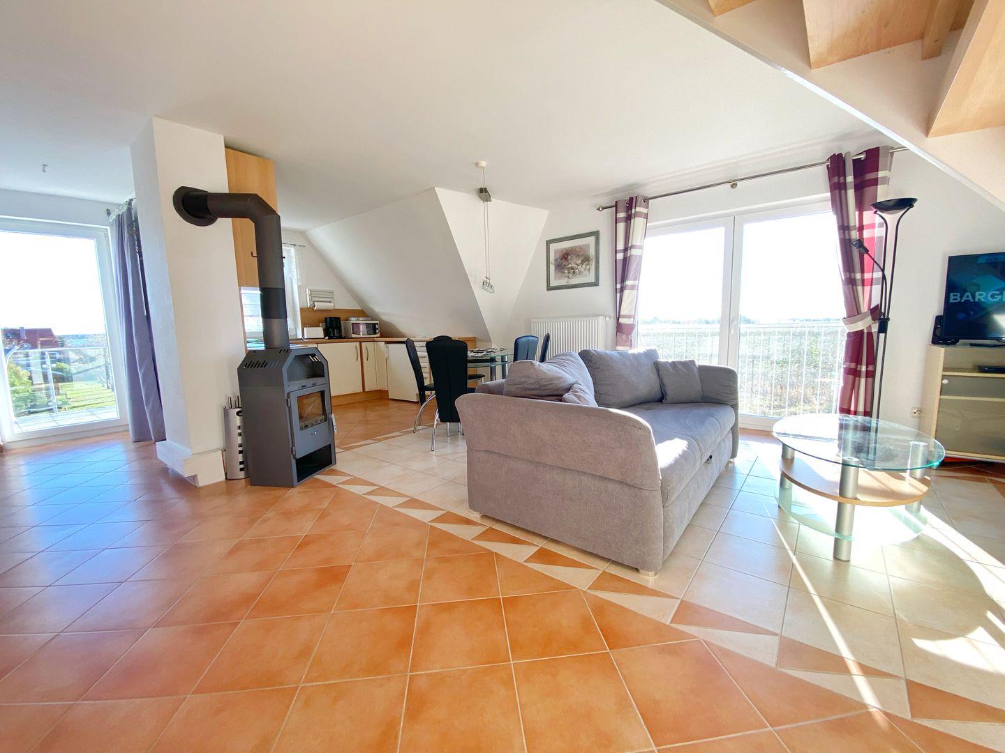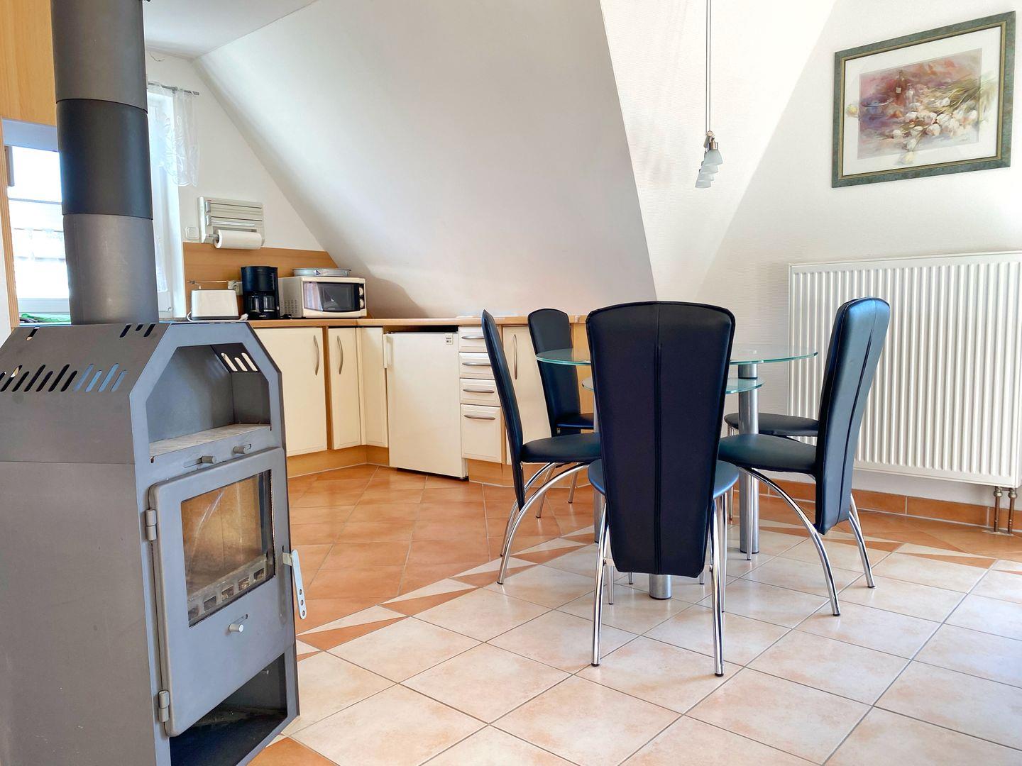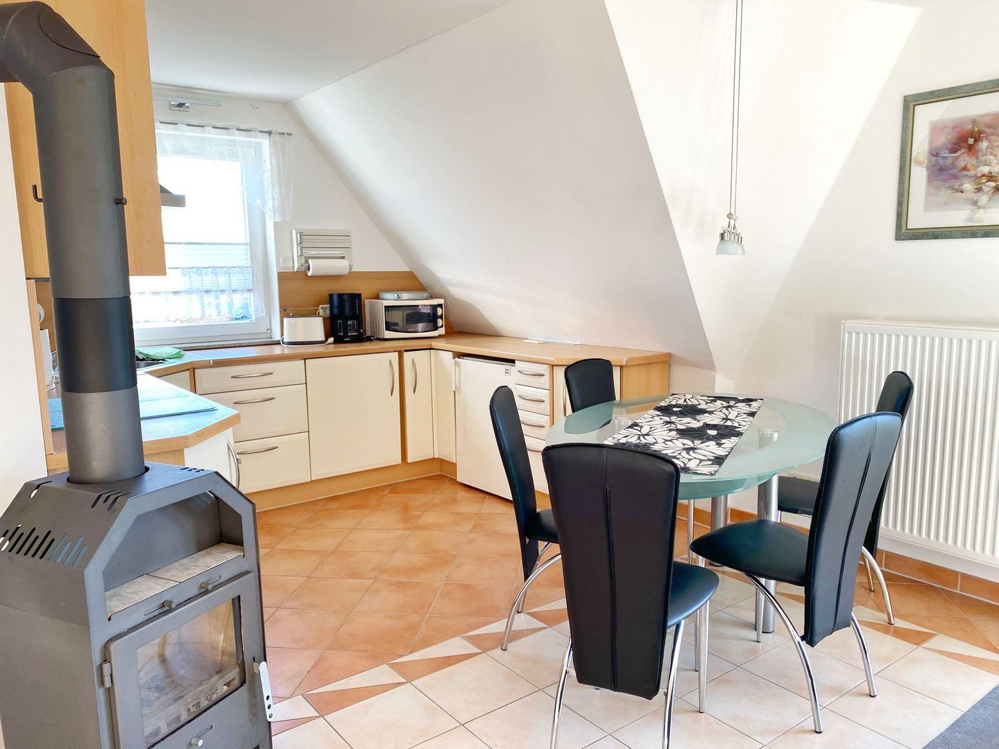 In das Wohnzimmer ist eine komplett ausgestattete Küche integriert. Die offene Küche verfügt über Geschirrspüler, Mikrowelle, Ceranfeld, Backofen, Kühlschrank mit Gefriermöglichkeit und natürlich über Kaffeemaschine, Toaster und Wasserkocher.