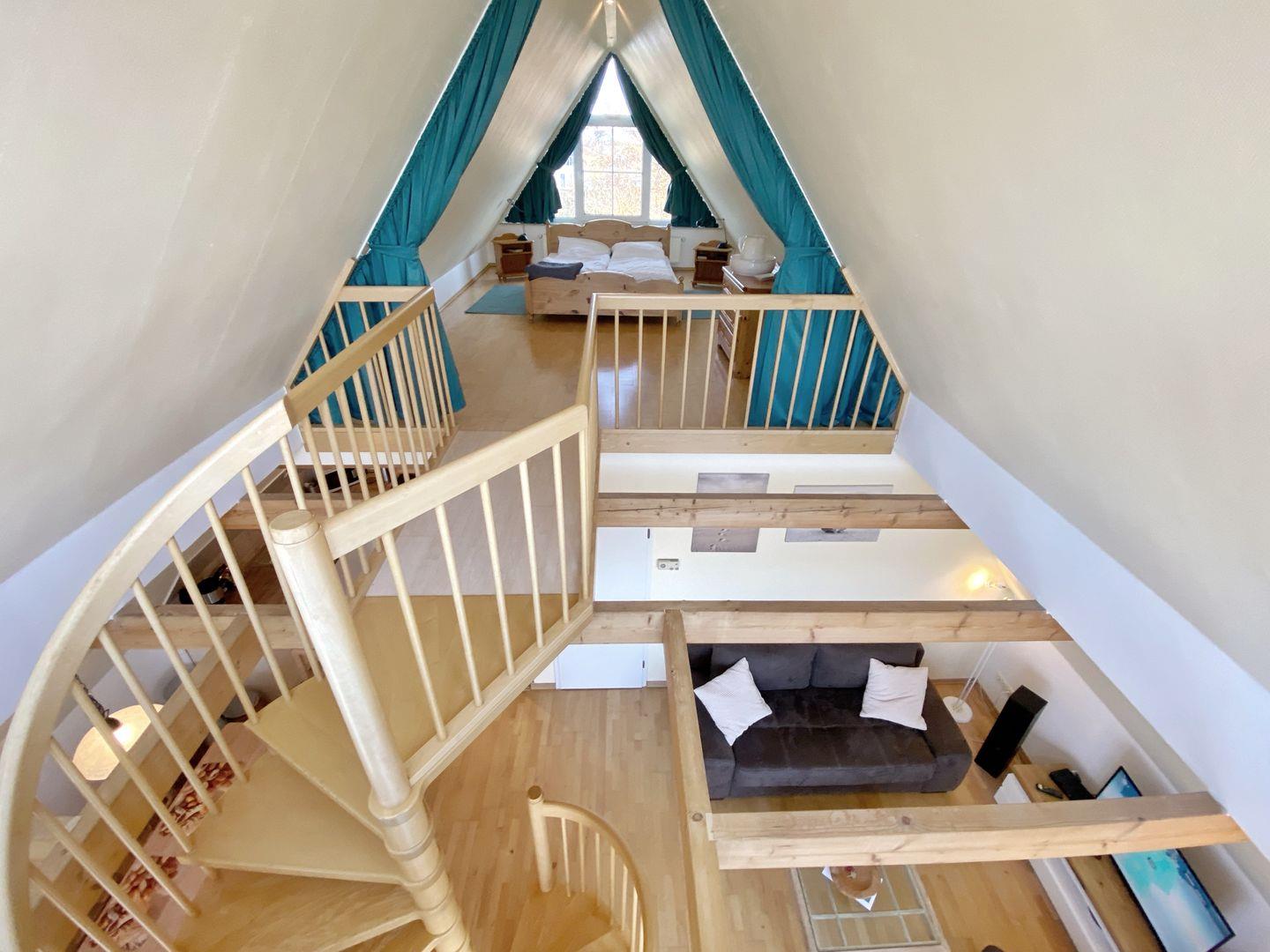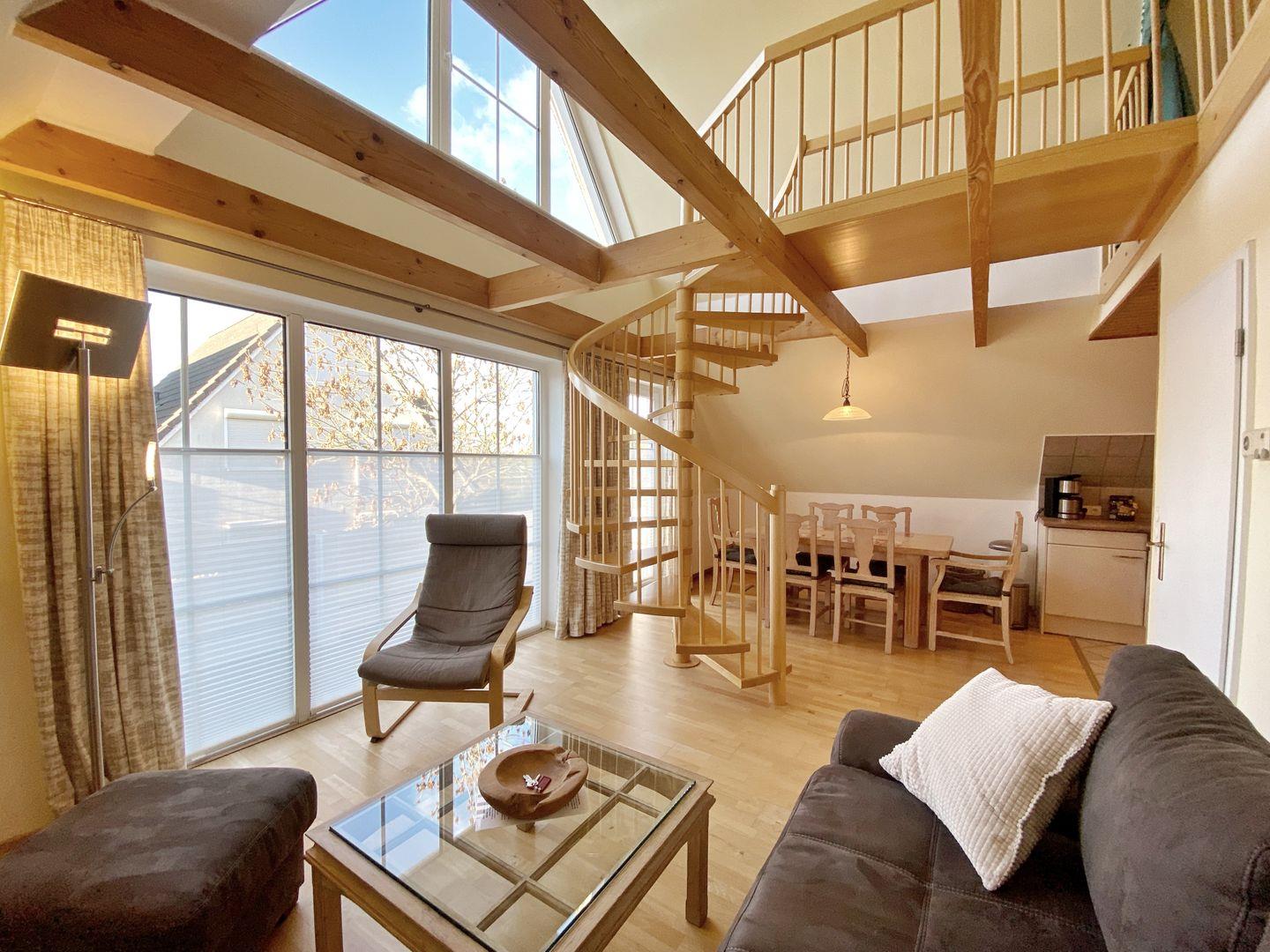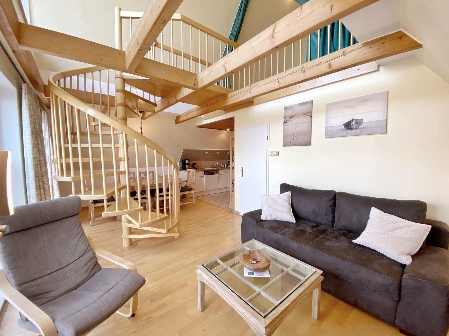 Die ansprechende Maisonettewohnung "Helisa" befindet sich im Obergeschoss unserer Inselsonne und bietet mit einer Grundfläche von ca. 72 qm sehr komfortabel Platz für 4 Personen. Das Appartement gliedert sich in einen hellen Wohn- und Essbereich mit Schlafraum im Spitzboden, eine offene Küche, ein großes Badezimmer und ein weiteres Schlafzimmer. An den Wohnbereich grenzt der große Balkon, auf dem Sie sich in bequemen Balkonmöbeln in der Inselsonne erholen können. Der über zwei Etagen verglaste Giebel bringt viel Licht in die Räume und gestattet den Blick in Richtung Wiek.