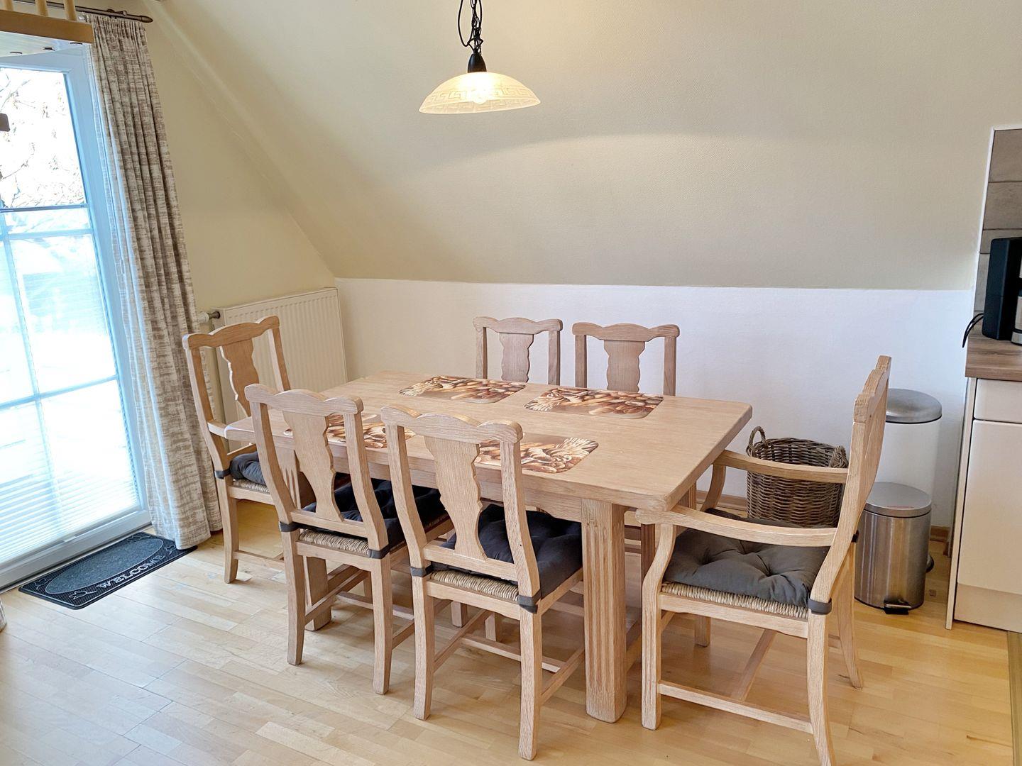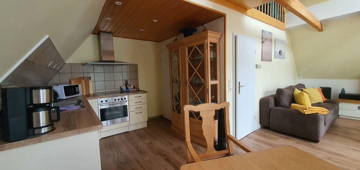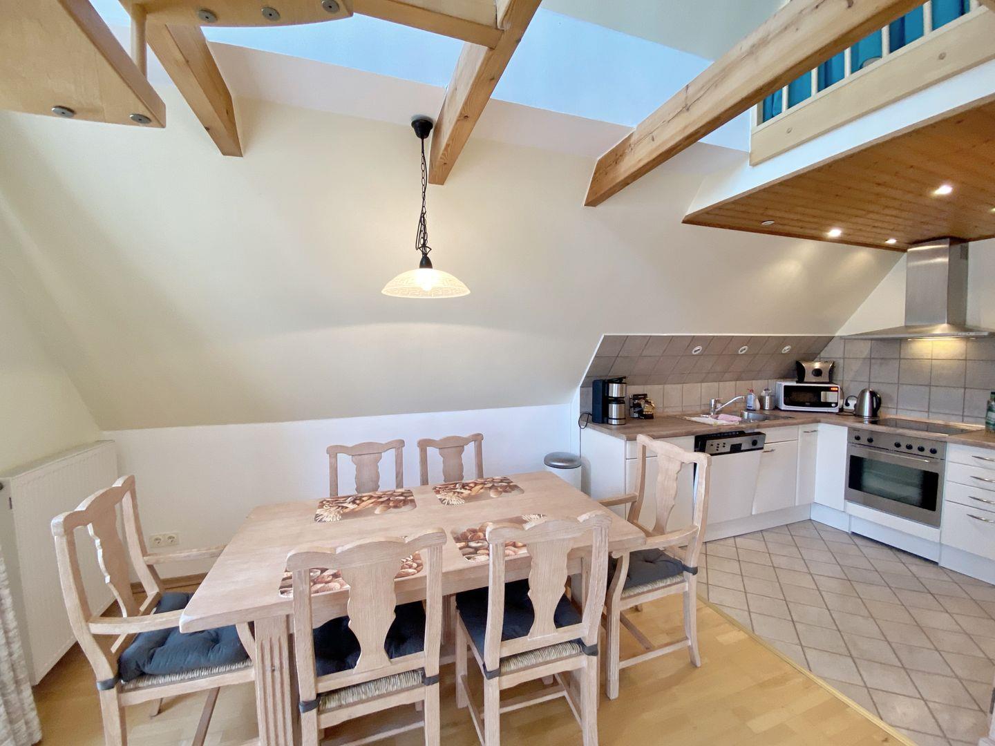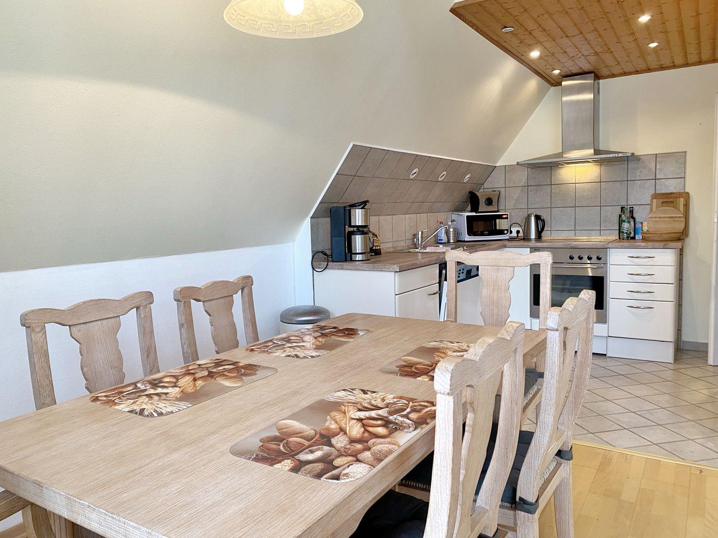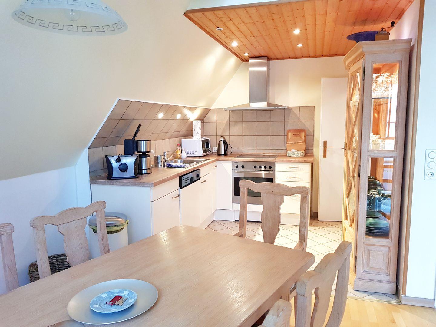 Die großzügige Küche ist voll ausgestattet und verfügt über Cerankochfeld, Backofen, Kühlschrank mit Gefriermöglichkeit, Geschirrspülmaschine und Mikrowelle.