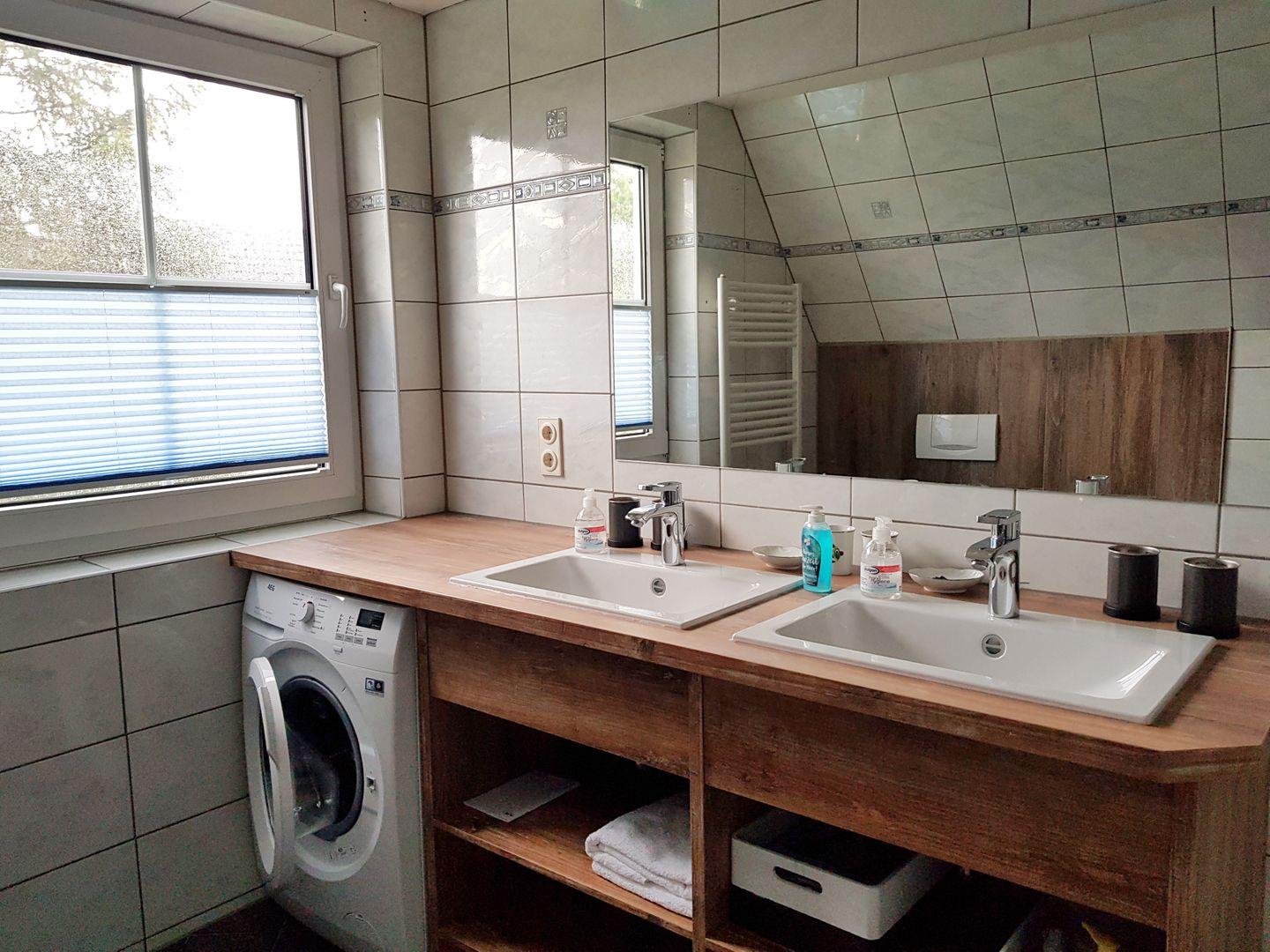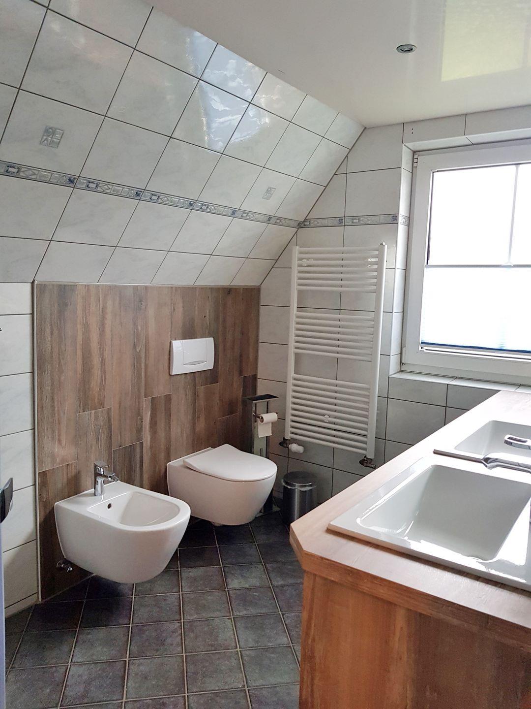 Das frisch modernisierte geräumige Badezimmer lässt mit Dusche, WC, Bidet, Doppelwaschtisch, Waschmaschine und Haartrockner kaum Wünsche offen.