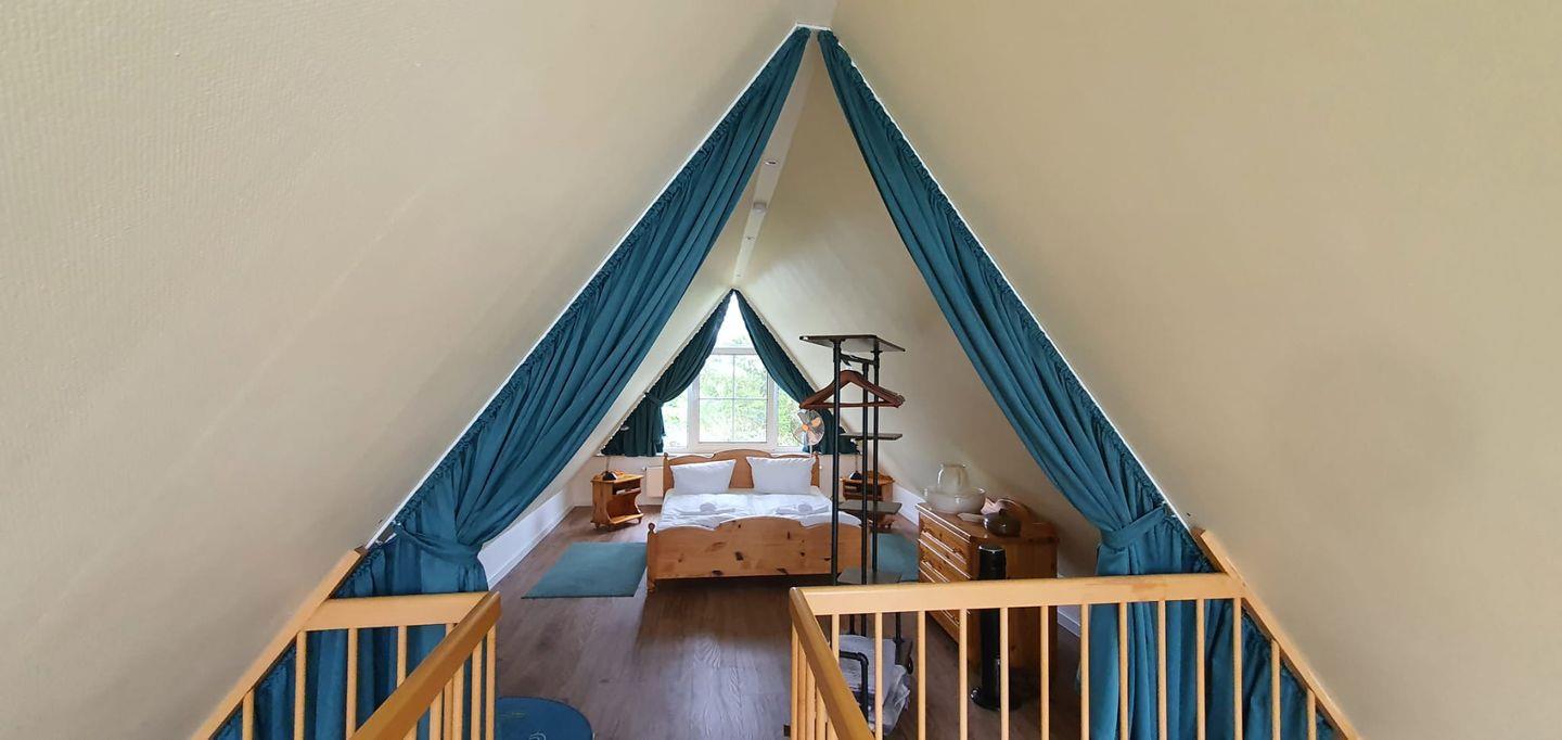 Im Wohnbereich befindet sich u.a. eine Couch und ein großformatiger Fernseher. Sie schlafen entweder in einem gemütlichen Schlafzimmer mit Holzmöbeln und zwei Einzelbetten, oder in unserem Highlight, dem Doppelbett im romantischen Spitzboden.