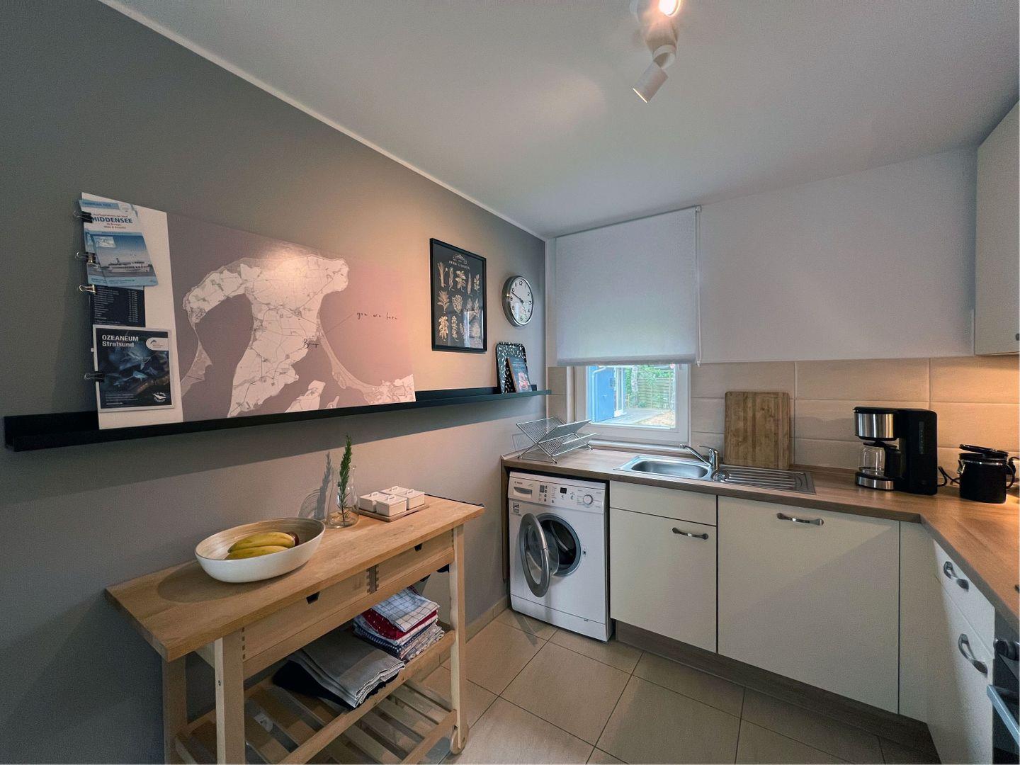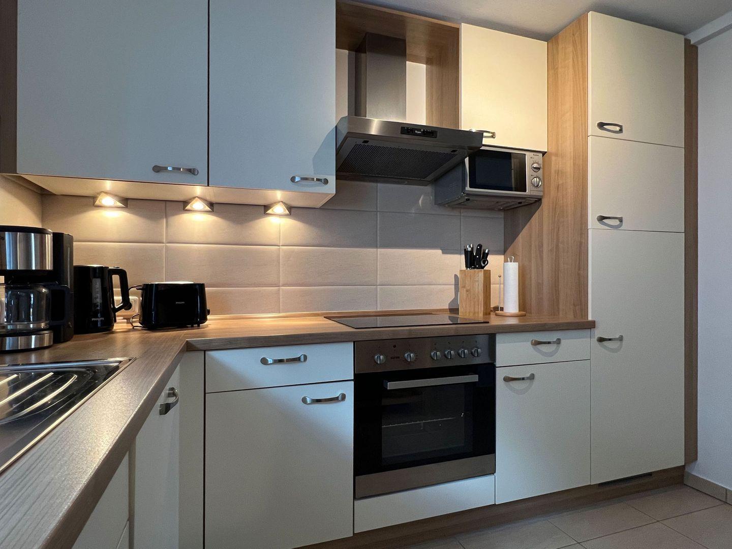 KÜCHE // separate Küche, 4-Platten Ceranherd, Kühlschrank mit Gefrierfach, Backofen, Mikrowelle, Toaster, Wasserkocher, Kaffeemaschine, reichlich Besteck, Geschirrspülmaschine und Küchenutensilien ++