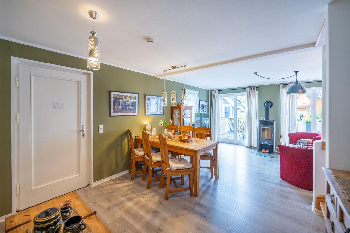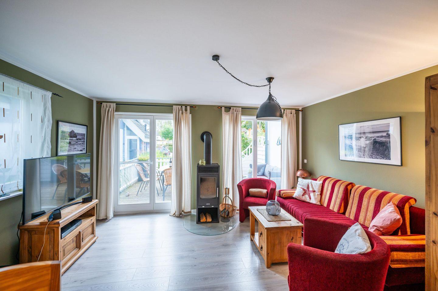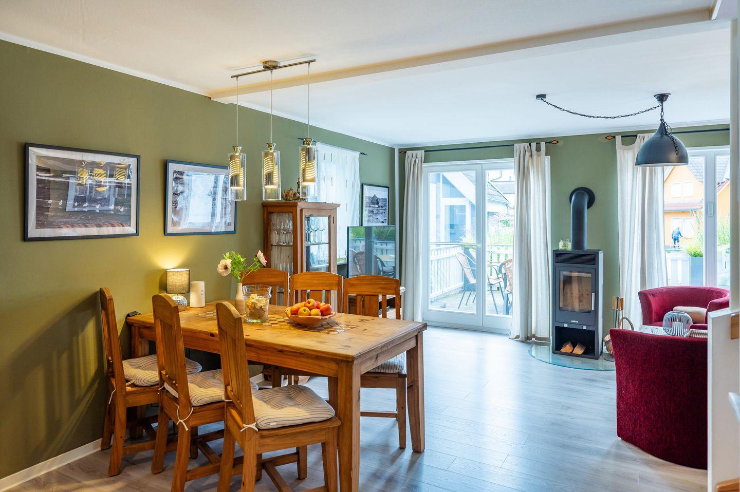 Willkommen im Ferienhaus “Wassermann”, das auf großzügigen 80 m² Platz für bis zu 4 Erwachsene und ein Kleinkind bietet. Ein wunderbarer Ort für entspannte Urlaubstage zu jeder Jahreszeit! Der gemütliche Wohnbereich mit bequemer Schlafcouch, Sessel und einem drehbaren Kaminofen schafft eine einladende, wohlige Atmosphäre. Die voll ausgestattete, zum Wohnzimmer offene Küche lädt zum gemeinsamen Kochen ein. Im Obergeschoss warten zwei Schlafzimmer mit bodentiefen Fenstern, die viel Licht und Komfort bieten. Dank Insektenschutz ist auch in lauen Sommernächten Erholung garantiert. Das Haus verfügt über ein modernes Bad mit Dusche und finnischer Sauna im Erdgeschoss, deren Nutzung Sie auf Wunsch gegen eine geringe Gebühr für die Dauer Ihres Aufenthalts hinzubuchen können, sowie ein weiteres mit Badewanne im Obergeschoss. Die großzügige, möblierte Holzterrasse bietet alle Voraussetzungen, um im Freien zu entspannen und die Sonne zu genießen. Auf Wunsch spendet Ihnen eine hochwertige, elektrische Markise Schatten. Nutzen Sie gern die Sonnenliegen, um auch im kleinen Gartenbereich hinter dem Haus die Seele baumeln zu lassen. Ein Pkw-Stellplatz befindet sich direkt am Haus.