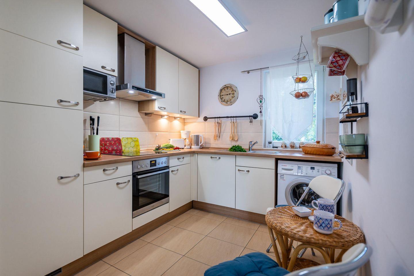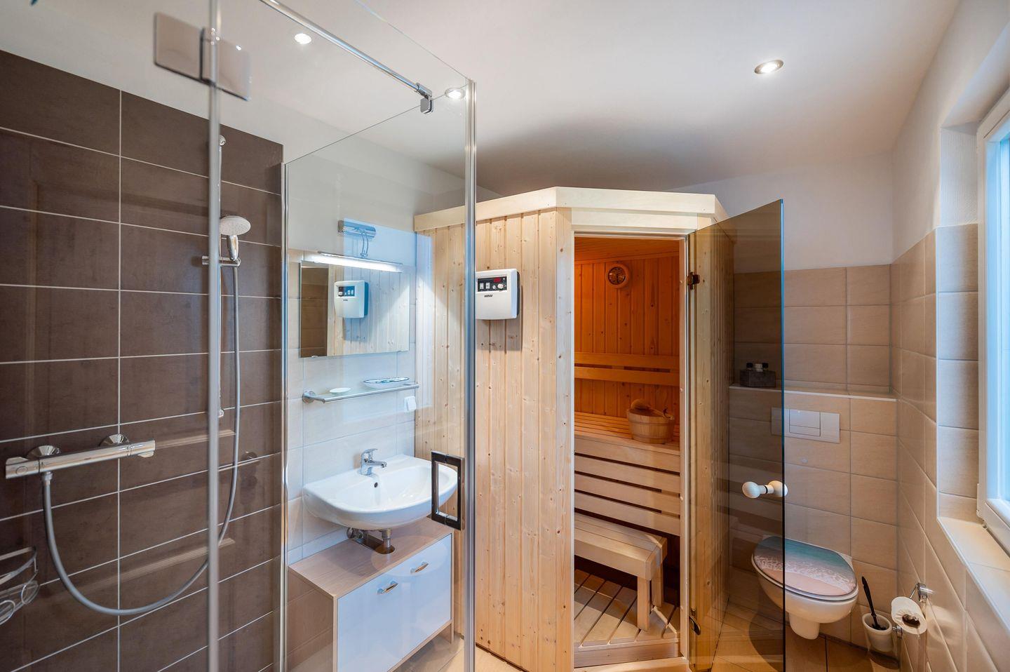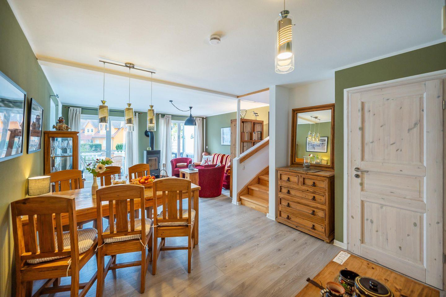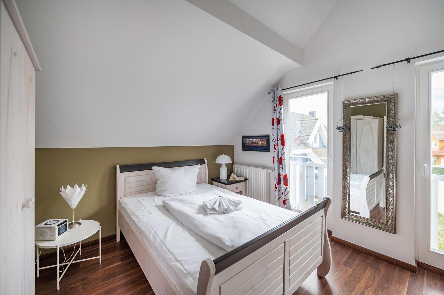 Willkommen im Ferienhaus “Wassermann”, das auf großzügigen 80 m² Platz für bis zu 4 Erwachsene und ein Kleinkind bietet. Ein wunderbarer Ort für entspannte Urlaubstage zu jeder Jahreszeit! Der gemütliche Wohnbereich mit bequemer Schlafcouch, Sessel und einem drehbaren Kaminofen schafft eine einladende, wohlige Atmosphäre. Die voll ausgestattete, zum Wohnzimmer offene Küche lädt zum gemeinsamen Kochen ein. Im Obergeschoss warten zwei Schlafzimmer mit bodentiefen Fenstern, die viel Licht und Komfort bieten. Dank Insektenschutz ist auch in lauen Sommernächten Erholung garantiert. Das Haus verfügt über ein modernes Bad mit Dusche und finnischer Sauna im Erdgeschoss, deren Nutzung Sie auf Wunsch gegen eine geringe Gebühr für die Dauer Ihres Aufenthalts hinzubuchen können, sowie ein weiteres mit Badewanne im Obergeschoss. Die großzügige, möblierte Holzterrasse bietet alle Voraussetzungen, um im Freien zu entspannen und die Sonne zu genießen. Auf Wunsch spendet Ihnen eine hochwertige, elektrische Markise Schatten. Nutzen Sie gern die Sonnenliegen, um auch im kleinen Gartenbereich hinter dem Haus die Seele baumeln zu lassen. Ein Pkw-Stellplatz befindet sich direkt am Haus.