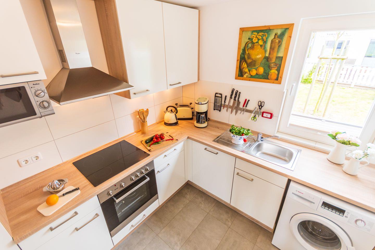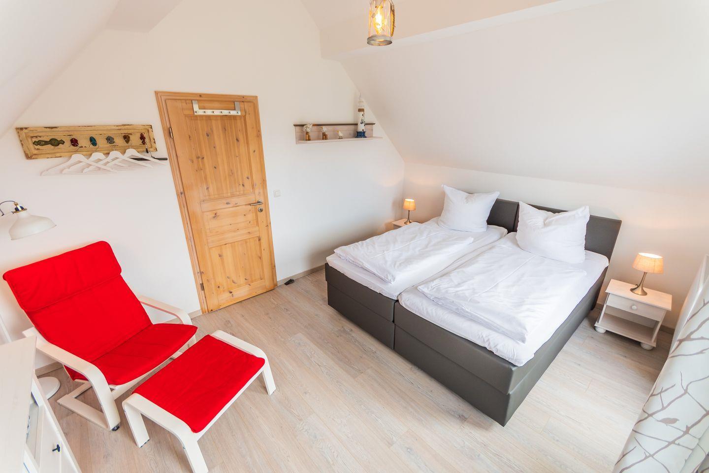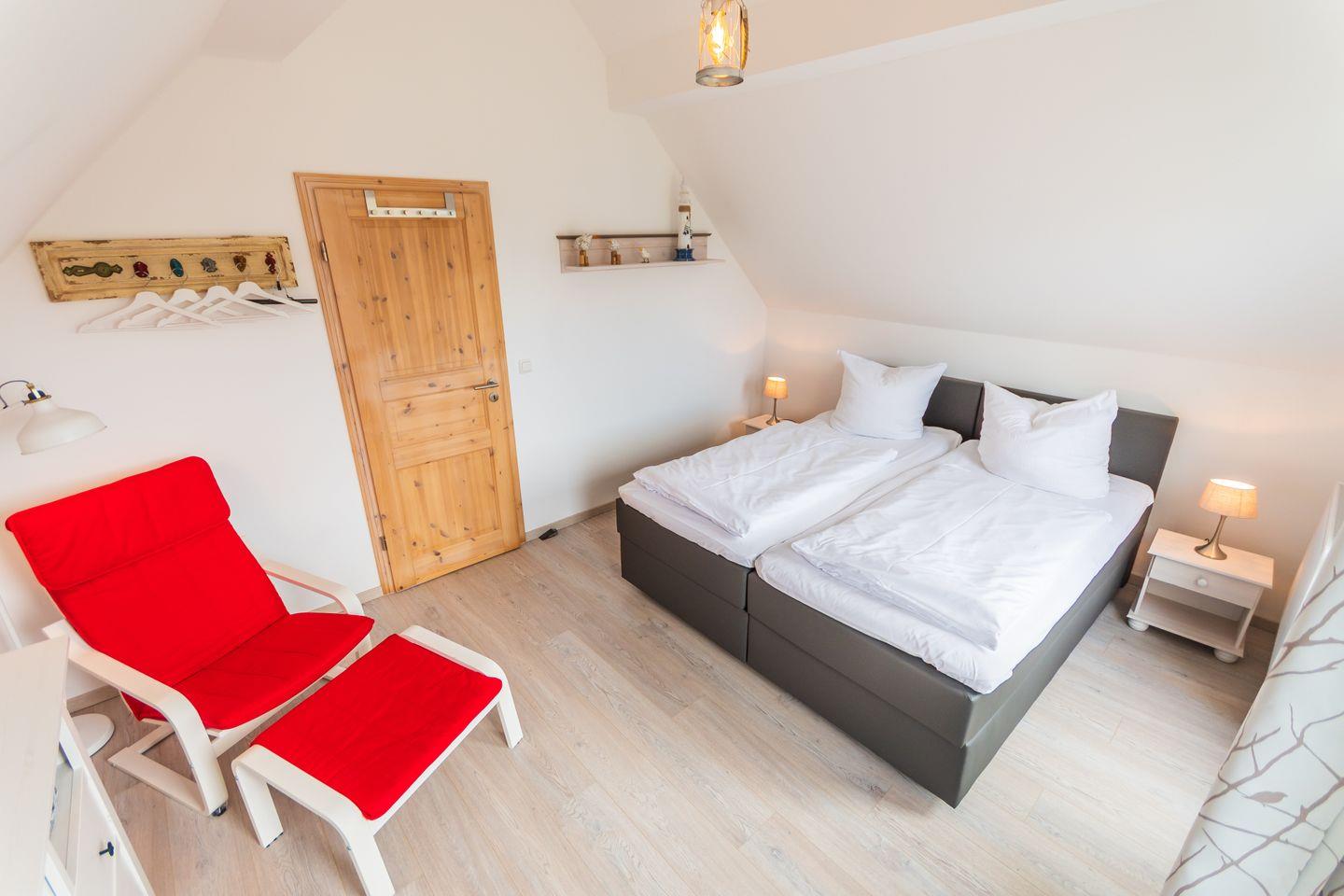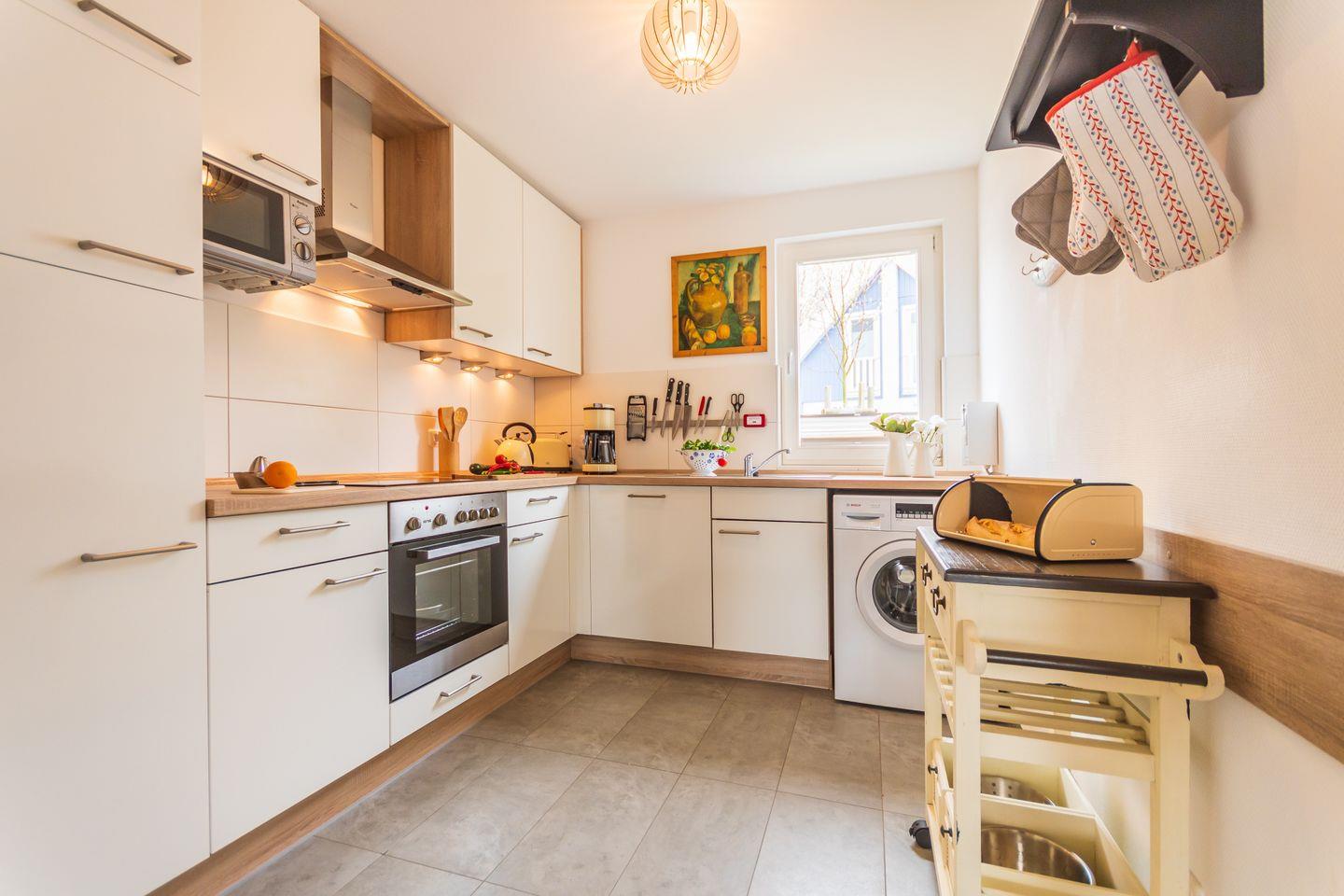 Der helle, offen gestaltete Wohn- und Essbereich lädt mit Kaminofen zum Wohlfühlen ein. Zwei komfortable Schlafzimmer mit hochwertigen Boxspringbetten sorgen für erholsame Nächte. Für die kleinen Gäste stehen ein Kinderreisebett mit Matratze (ohne Bettzeug) sowie ein Hochstuhl kostenfrei bereit.
