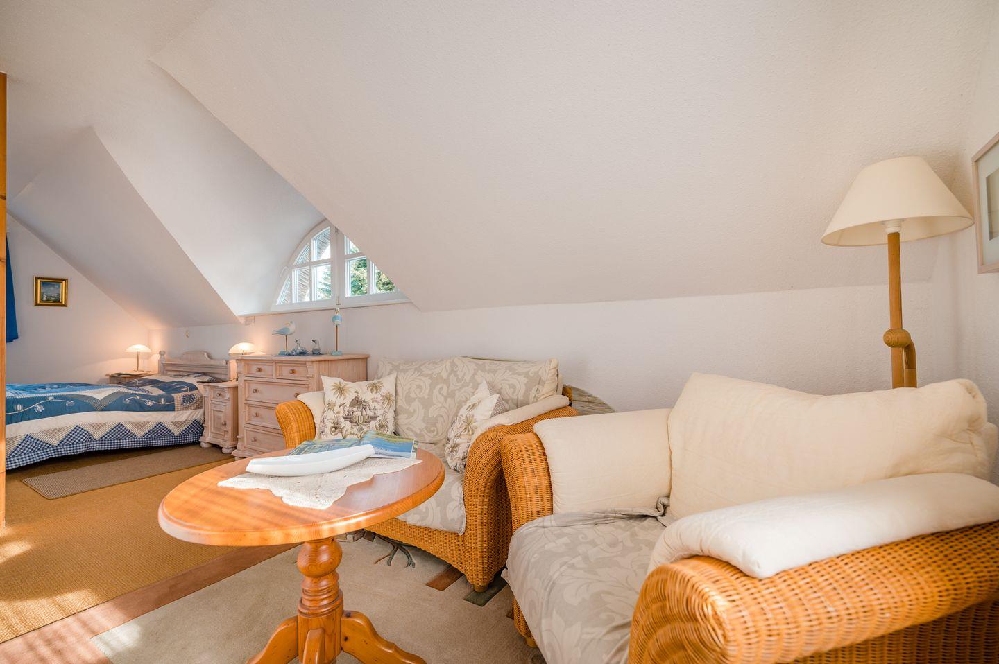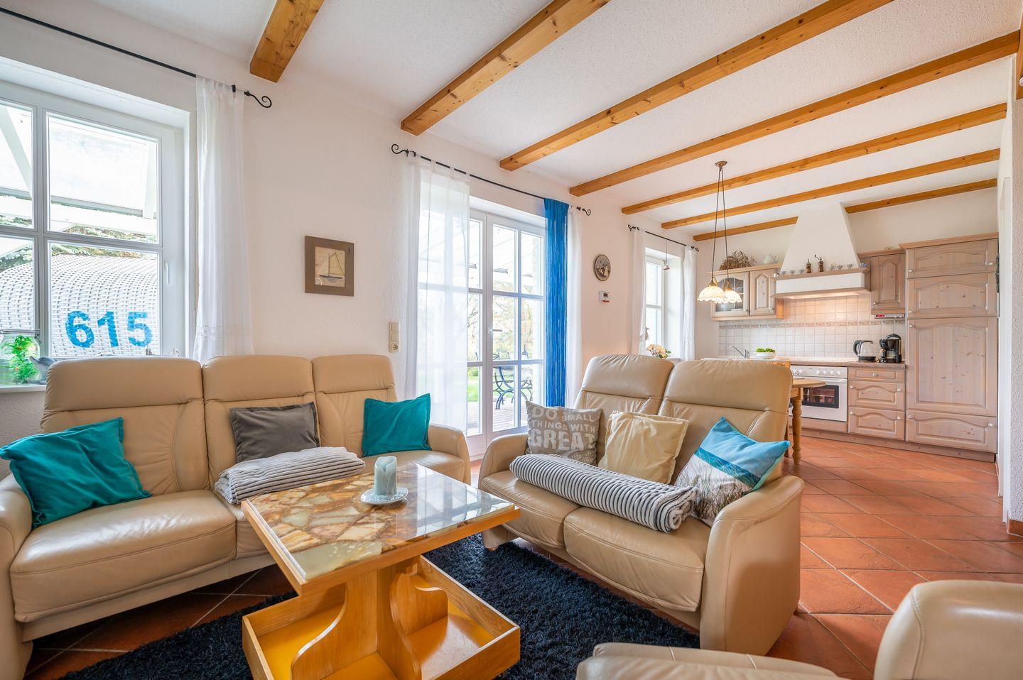 Das großzügige Wohn-Esszimmer ist mit einem Esstisch für 4 Personen, einem Couchtisch sowie zwei Ledersofas (Zwei- und Dreisitzer) ausgestattet, ergänzt durch einen Fernsehsessel von "Stressless". Für Ihren Komfort finden Sie außerdem Schreibtisch, Schuhschrank, Garderobe und eine Kommode im Erdgeschoss. Zwei Schlafzimmer, eine voll ausgestattete Küche und zwei Bäder runden das Angebot ab. Im Erdgeschoss befindet sich ein Gäste-WC mit Dusche, Toilette, Waschbecken, Spiegel, Schrank und Fenster. Im Obergeschoss erwartet Sie ein Bad mit Eckbadewanne, Dusche, WC, Waschbecken, Spiegel, Haartrockner, Schrank und Fenster. Der Hauswirtschaftsraum mit Waschmaschine, Wäscheständer, Bügelbrett, Bügeleisen, Regalen, Staubsauger und Besen sorgt für zusätzlichen Komfort.