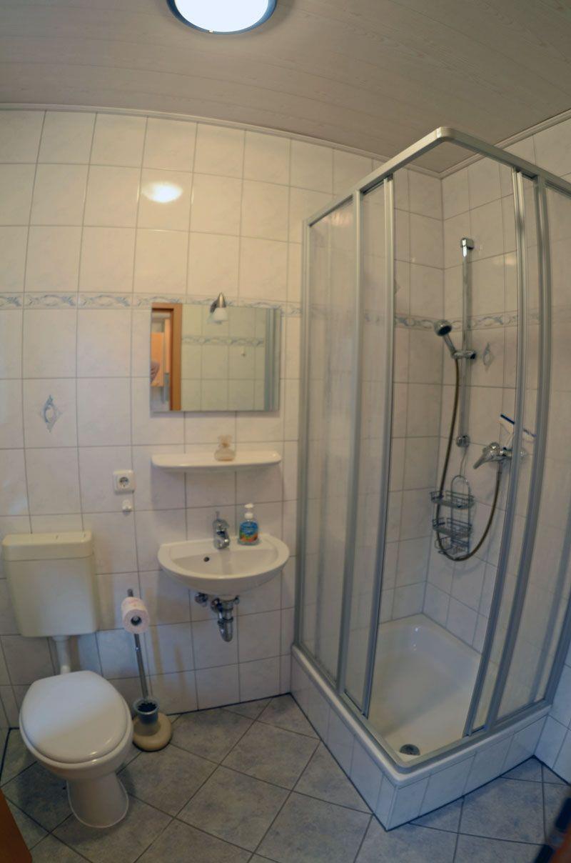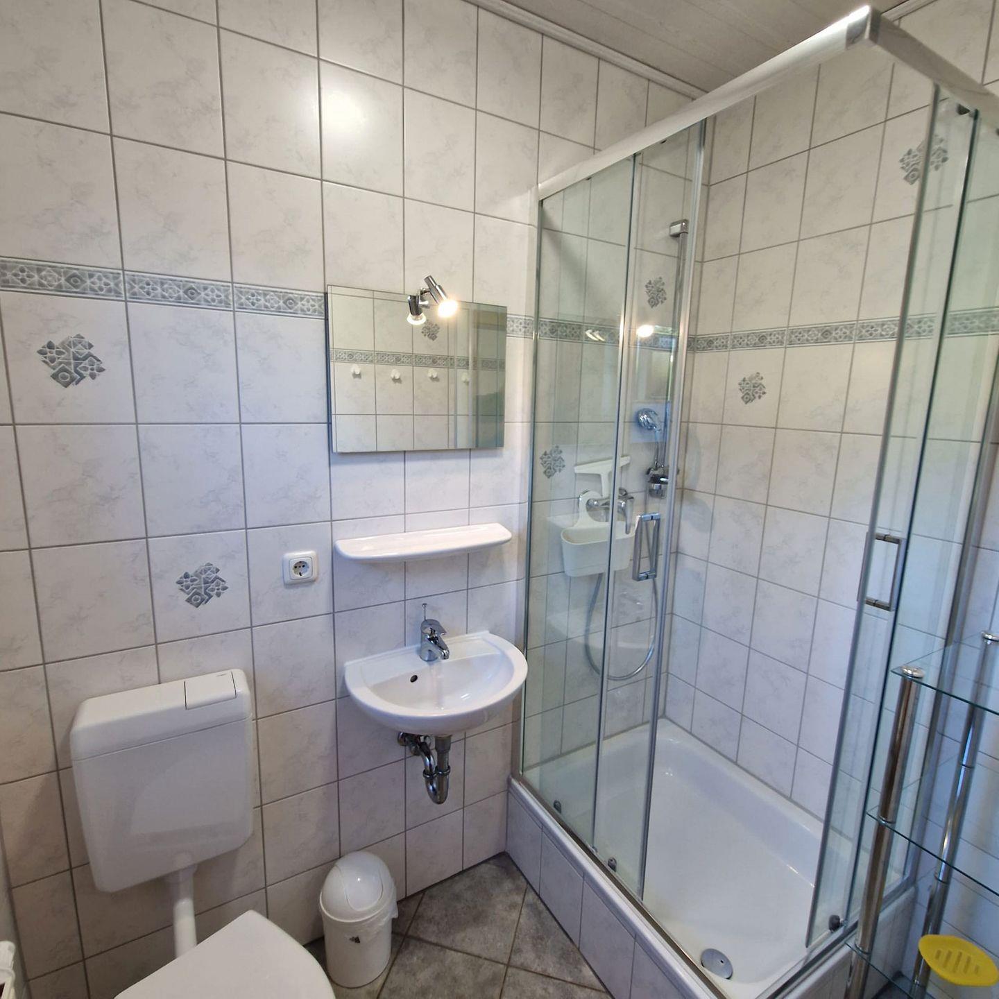 Das Bad im Erdgeschoß verfügt über eine Dusche, Waschbecken und WC.