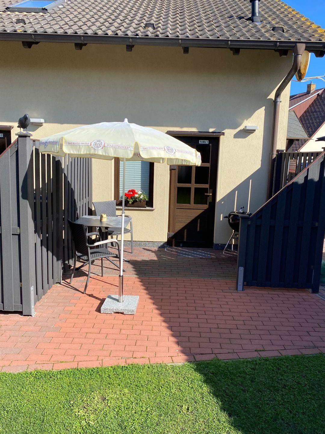 An der Ferienwohnung befindet sich ein kleiner Garten zur Mitnutzung und eine eigene Terrasse mit Gartenmöbeln, Grill und Sonnenschirm.