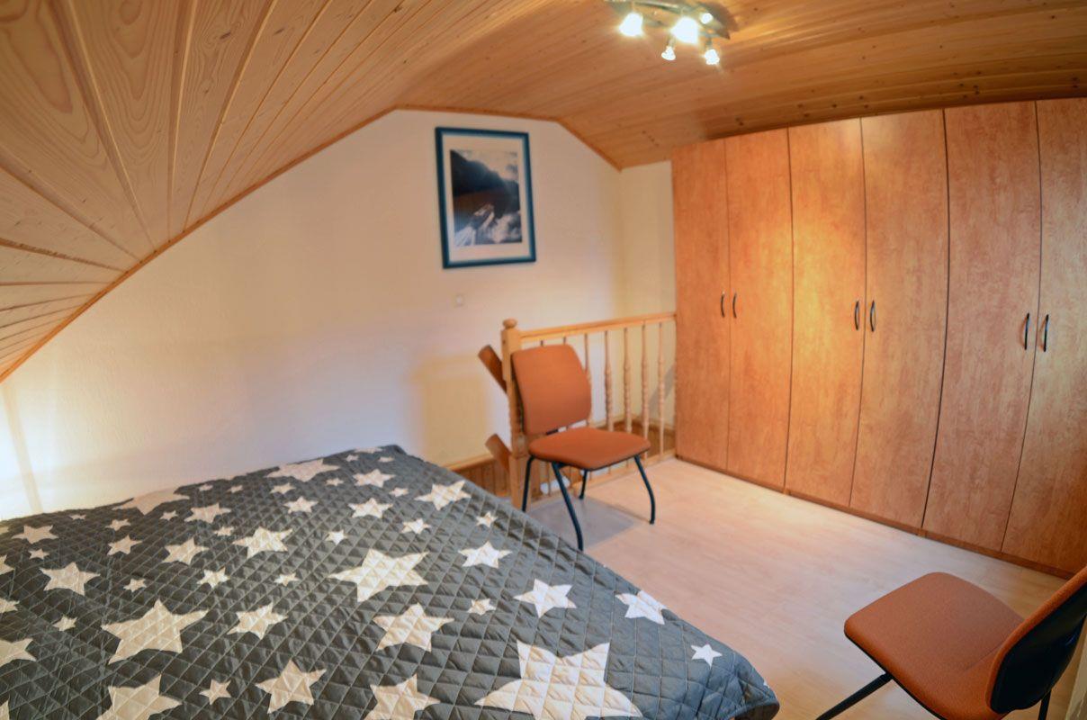 Über eine Treppe im Wohnbereich gelangt man ins Schlafzimmer im Dachgeschoß mit Doppelbett und großem Kleiderschrank.