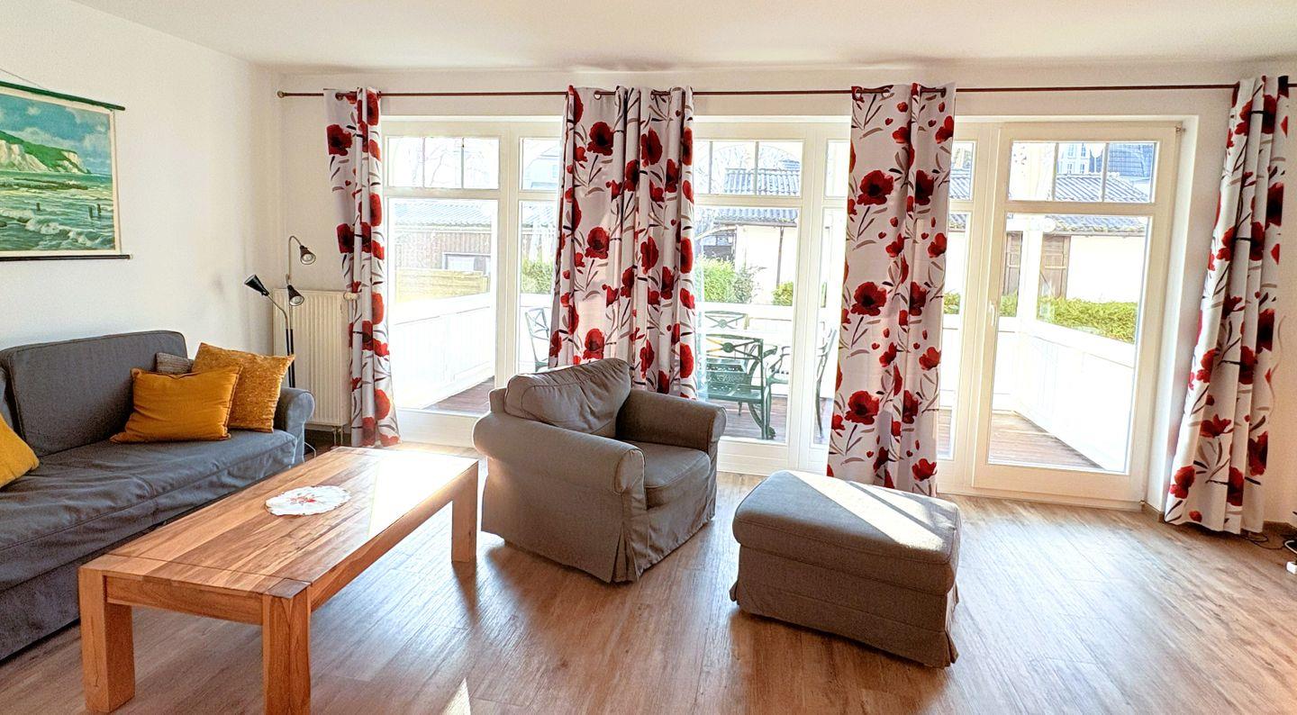 Geräumige 3-Zimmer-Ferienwohnung im Erdgeschoss der Strandresidenz Juliusruh (Haus II), nur 150 m vom Strand Schaabe entfernt. Auf ca. 70 m² bietet sie Platz für bis zu 4 Personen zzgl. 1 Kleinkind und verfügt über Balkon, WLAN, Parkplatz sowie zwei Schlafzimmer. Ein Hund (bis 35 cm Schulterhöhe) ist willkommen.