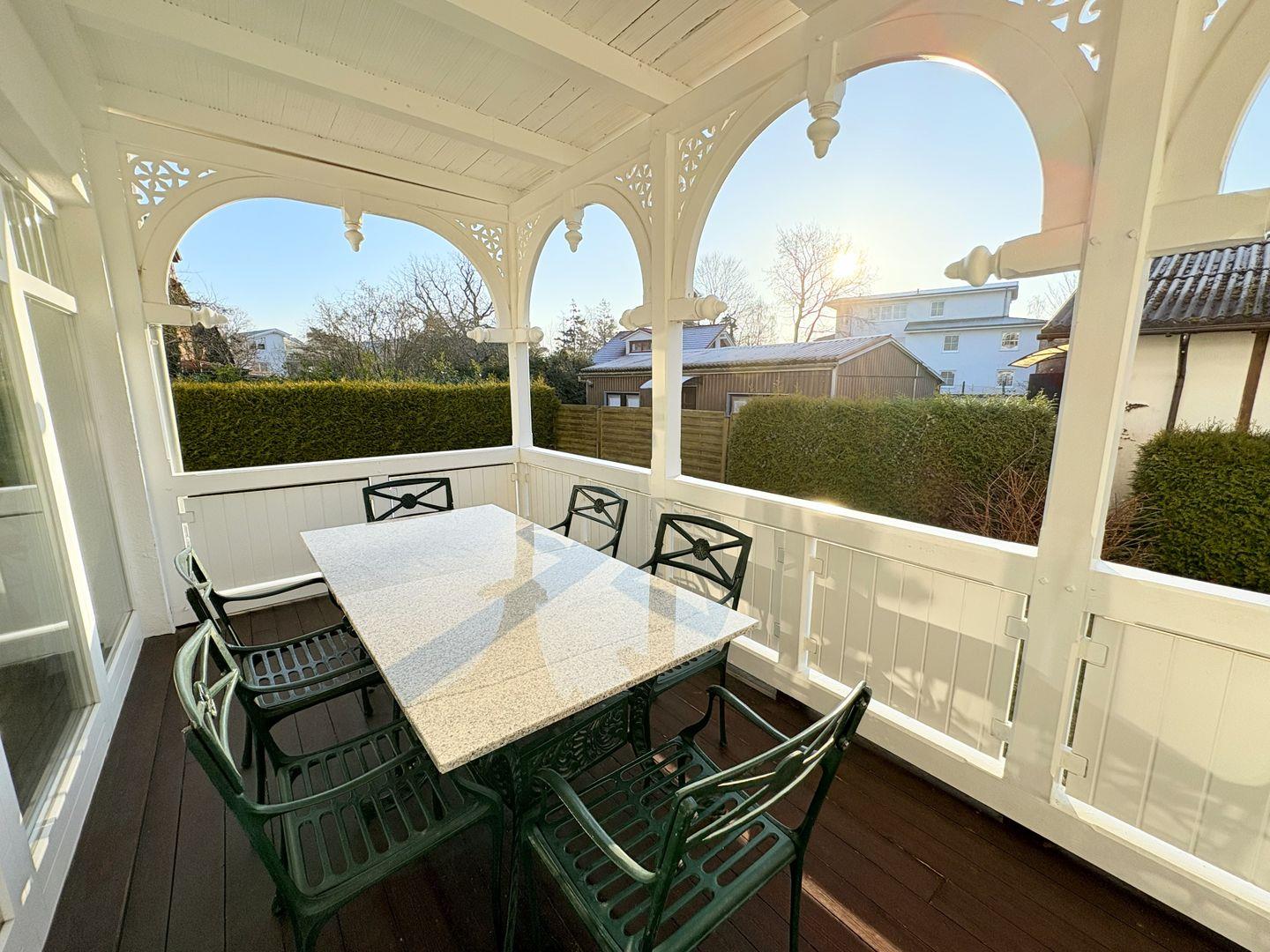 - Überdachter Balkon mit Tisch und Stühlen