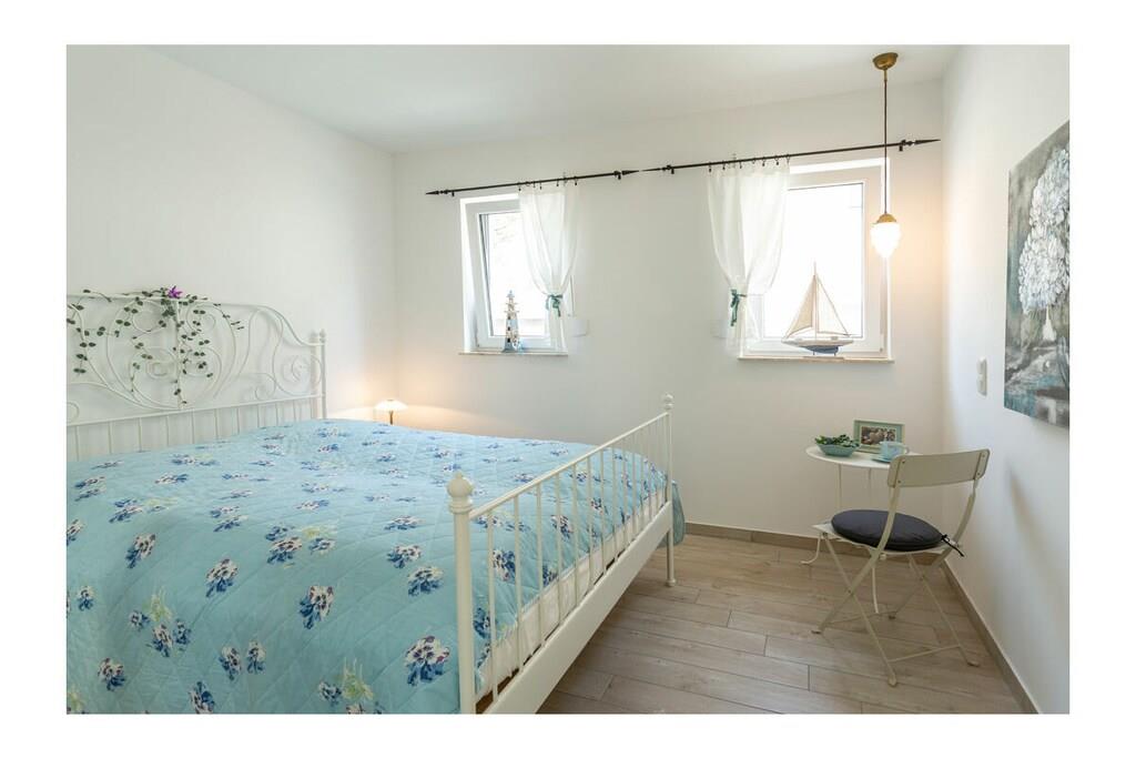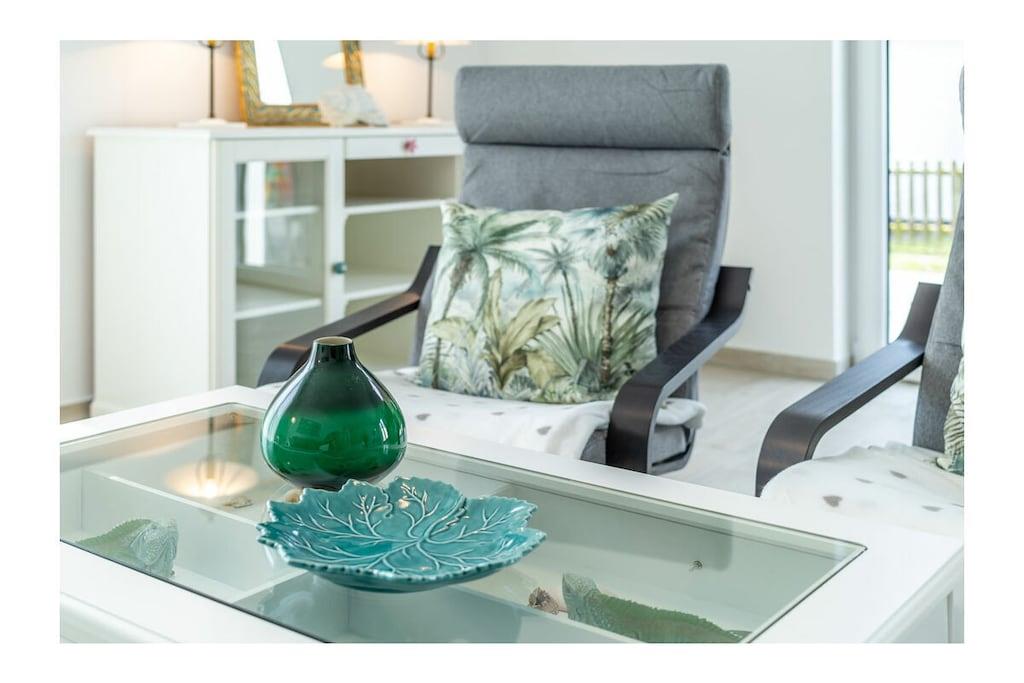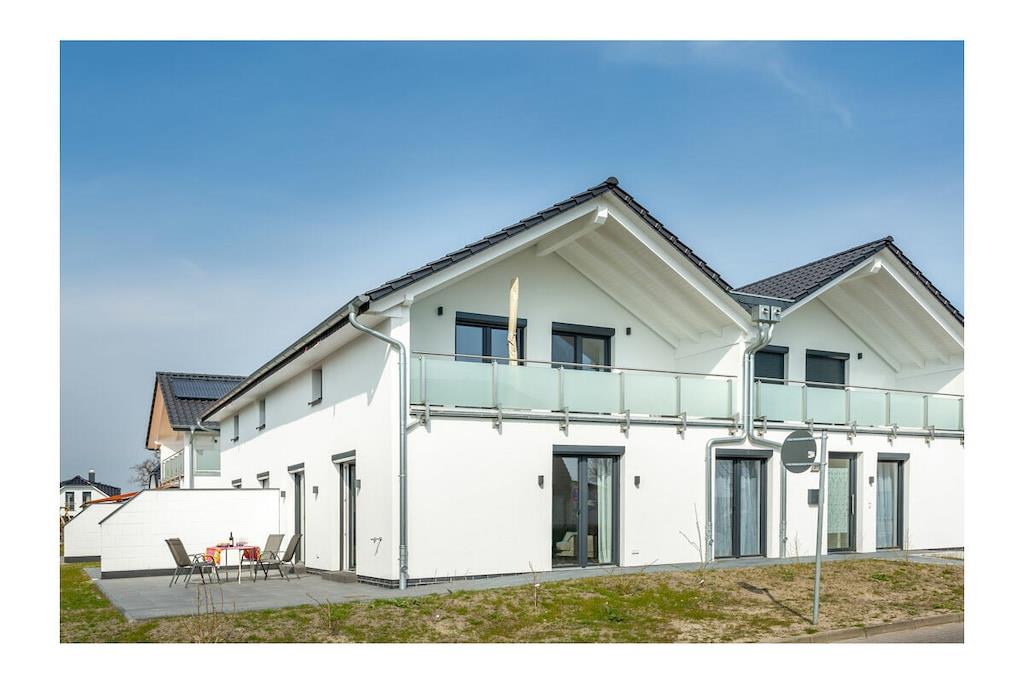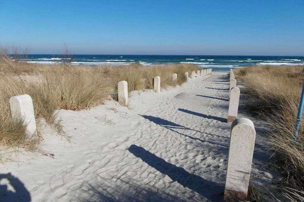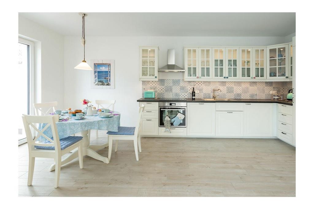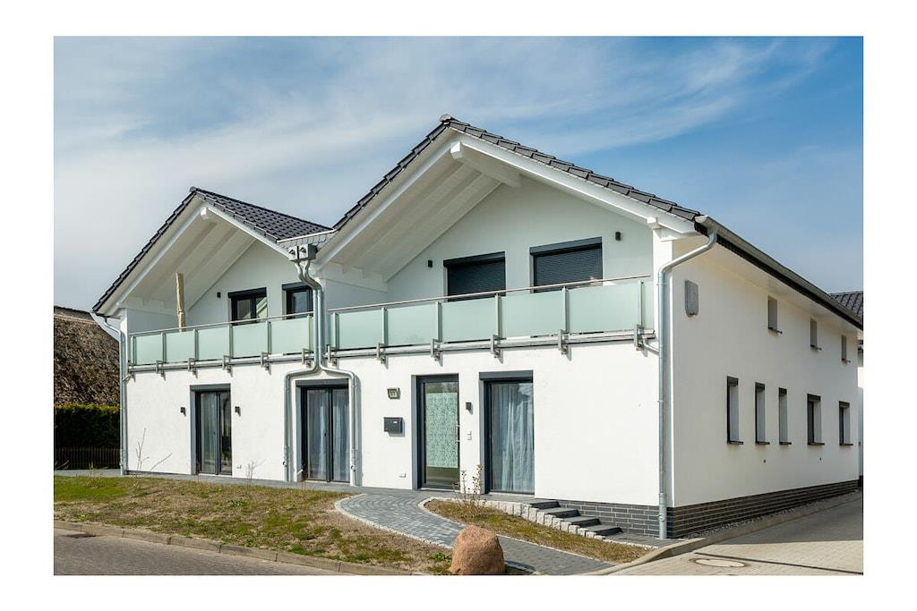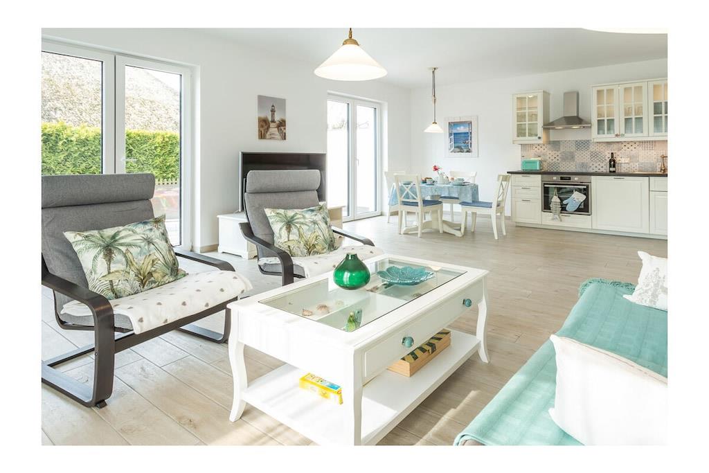Die Unbeschwertheit des Urlaubs genießen mit viel Licht, viel Luft, viel Sonne. Es erwartet sie ein großzügiger Wohn- & Essbereich (33,74 m²) mit 3 großen Terrassentüren nach Süden und Westen. Eine gemütliche Couch und zwei Sessel laden zum Entspannen ein, zum Fernsehen (TV/Sat, 55 Zoll Flatscreen/ Smart-TV), Internet Surfen (kostenloses WLAN ) oder zu lustigen Spieleabenden (Gesellschaftsspiele vorhanden). Die große, 5m lange, voll eingerichtete Einbauküche (mit direkter und indirekter Beleuchtung) verfügt über einen 4-Plattenherd (Ceran), Backofen, Kühlschrank, Gefrierschrank, Geschirrspüler und weitere diverse Elektrogeräten wie eine Kaffeemaschine, Wasserkocher, Toaster, Eierkocher. Ein Schlafzimmer ist mit komfortablem Doppelbett (2 getrennte Matratzen je 90 x 200) und geräumigem Kleiderschrank mit Spiegeltüren ausgestattet und zusätzlich noch mit einem großem Schreibtisch. Die große Terrassentür ist nach Süden ausgerichtet. Das andere Schlafzimmer ist ebenfalls mit komfortablem Doppelbett (2 getrennte Matratzen je 80 x 200), geräumigem Kleiderschrank mit Spiegeltüren ausgestattet und zusätzlich einem kleinem Tisch. Die beiden Fenster sind nach Osten ausgerichtet und mit Rolläden versehen. Das Badezimmer mit WC bietet einen großzügigen 140cm x 140cm großen ebenerdigen Duschbereich und eine Sitzecke für bequeme Körperpflege. Kosmetikspiegel, Föhn und Wäscheständer sind vorhanden. Das Fenster geht nach Osten und die große Terrassentür nach Süden. Alle Terrassentüren in der Wohnung sind mit elektrisch bedienbaren Rollläden abdunkelbar.. Im Flur befindet sich die Garderobe mit Spiegel, Schuhbank und Schirmständer. Die 25m² große Terrasse mit Blick auf den Bodden bietet viel Platz und ist mit Gartenmöbel für 4 Personen und Sonnenschirm ausgestattet. Erstvermietung April 2019. Die Wohnung besitzt einen eigenen Hauseingang mit barrierefreier Zuwegung. Die Wohnung ist eine Nichtraucherwohnung. Sie ist ganz in weiß eingerichtet, was sie sehr leicht und luftig wirken lässt. Wunderschöne Fliesen in Holzoptik (weiß gekalkte Buche) machen sie außerdem pflegeleicht. Alle Räume haben Fußbodenheizung. Die auf der Nordseite des Hauses vorhandene Remise ist abschließbar und kann für das Abstellen von Fahrrädern genutzt werden. 1 beleuchteter PKW- Stellplatz steht ebenfalls auf der Nordseite des Hauses zur Verfügung. Der Hafen von Breege (nur 250 Meter entfernt) ist ein beliebtes Ausflugsziel und Startpunkt für Fährfahrten nach Hiddensee und Ralswiek zu den Störtebeker Festspielen. Einkaufsmöglichkeiten, Bäcker und Restaurants sind in unmittelbarer Nähe. Es gibt optimale Rad- und Wandermöglichkeiten, um die Insel zu erkunden. Haustiere sind mit Rücksicht auf Allergiker leider nicht gestattet.