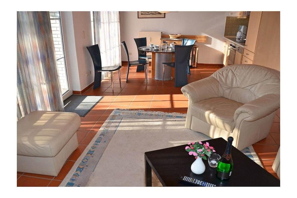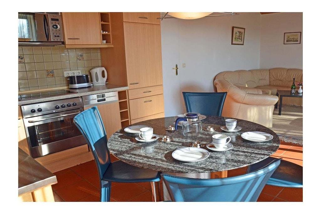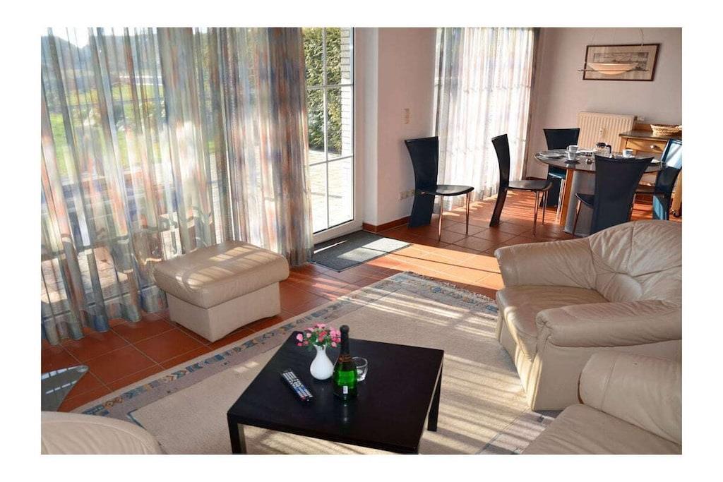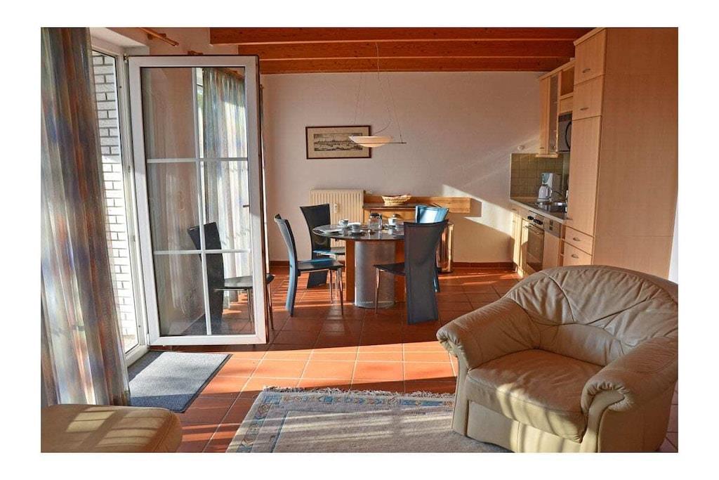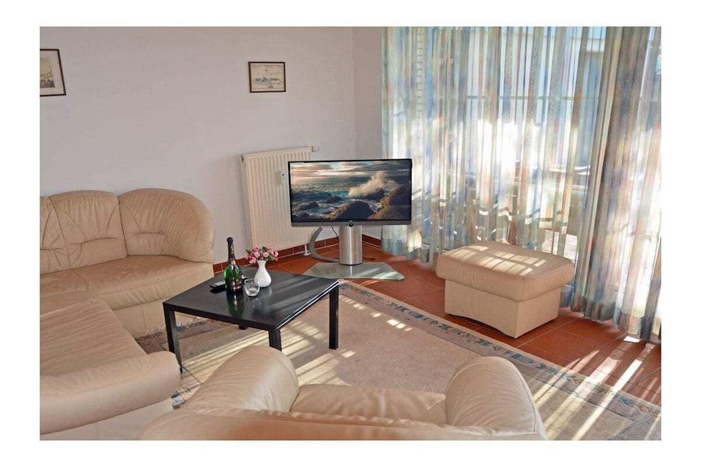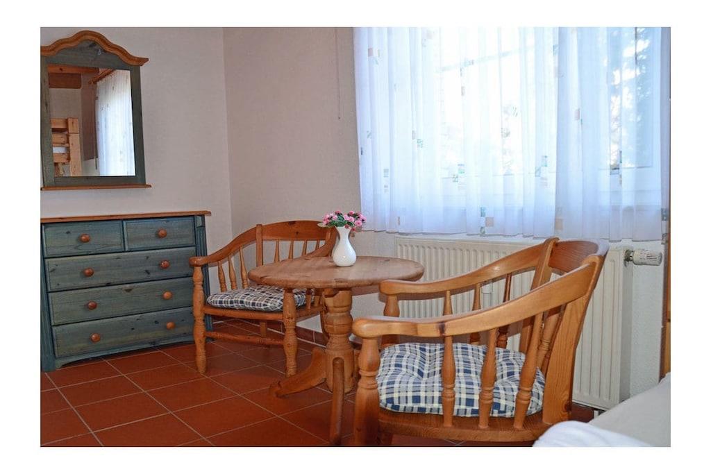 Rustikal-gemütliche Landhausstil-Ferienwohnung mit eigenem, separaten Garten (ca. 400 qm), Terrasse mit Sitzmöbeln und Sonnenliege sowie zweite Terrasse mit Grillkamin, Wohnzimmer mit Sofa-Ecke, TV/ Sat (Flatscreen), kostenfreies Internet (WLAN), komplett ausgestattete Einbauküche mit diversen Elektrogeräten, 4 Plattenherd (Ceranfeld) mit Backofen, Kühlschrank mit kleinem Gefrierfach, Geschirrspüler und Mikrowelle, 1. Schlafzimmer mit Doppelbett (2 Matratzen je 90 x 200) und großem Kleiderschrank, 2. Schlafzimmer mit Etagenbett (je 90 x 200), Sitzecke und Spiegelkommode, Bad mit barrierefrei zugänglicher Dusche, PKW Stellplatz direkt am Objekt, Abstellmöglichkeiten für Fahrräder auf der umzäunten/ abschließbaren Terrasse (kein Schuppen) “Breege – das charmante Seebad” Diese Ferienwohnung liegt im Norden von Rügen im Fischerdorf Breege, einem seit 1883 anerkanntem Urlaubsziel. Zusammen mit der Gemeinde Juliusruh bildet Breege seit 1928 ein Seebad. Sie wohnen in unmittelbarer Nähe (ca. 10 Minuten zu Fuß) zum herrlich feinsandigen Strand der Schaabe, mit 12 km die längste natürliche Badebucht der Insel Rügen. Der Hafen von Breege (ca. 5 Minuten zu Fuß) ist ein beliebtes Ausflugsziel und Startpunkt für Fährfahrten nach Hiddensee und Ralswiek zu den Störtebeker Festspielen. Ca. 2 km entfernt in Altenkirchen finden Sie einen Netto, das Kaufhaus „Stolz“, Edeka und einen Getränkemarkt. Restaurants und Radverleih sind in der Nähe. Es gibt optimale Rad- und Wandermöglichkeiten um die Insel zu erkunden. Haustiere nach Absprache (Gebühr Euro 5,-/ pro Haustier/ pro Nacht)
