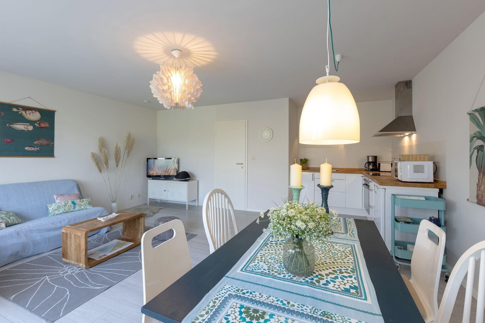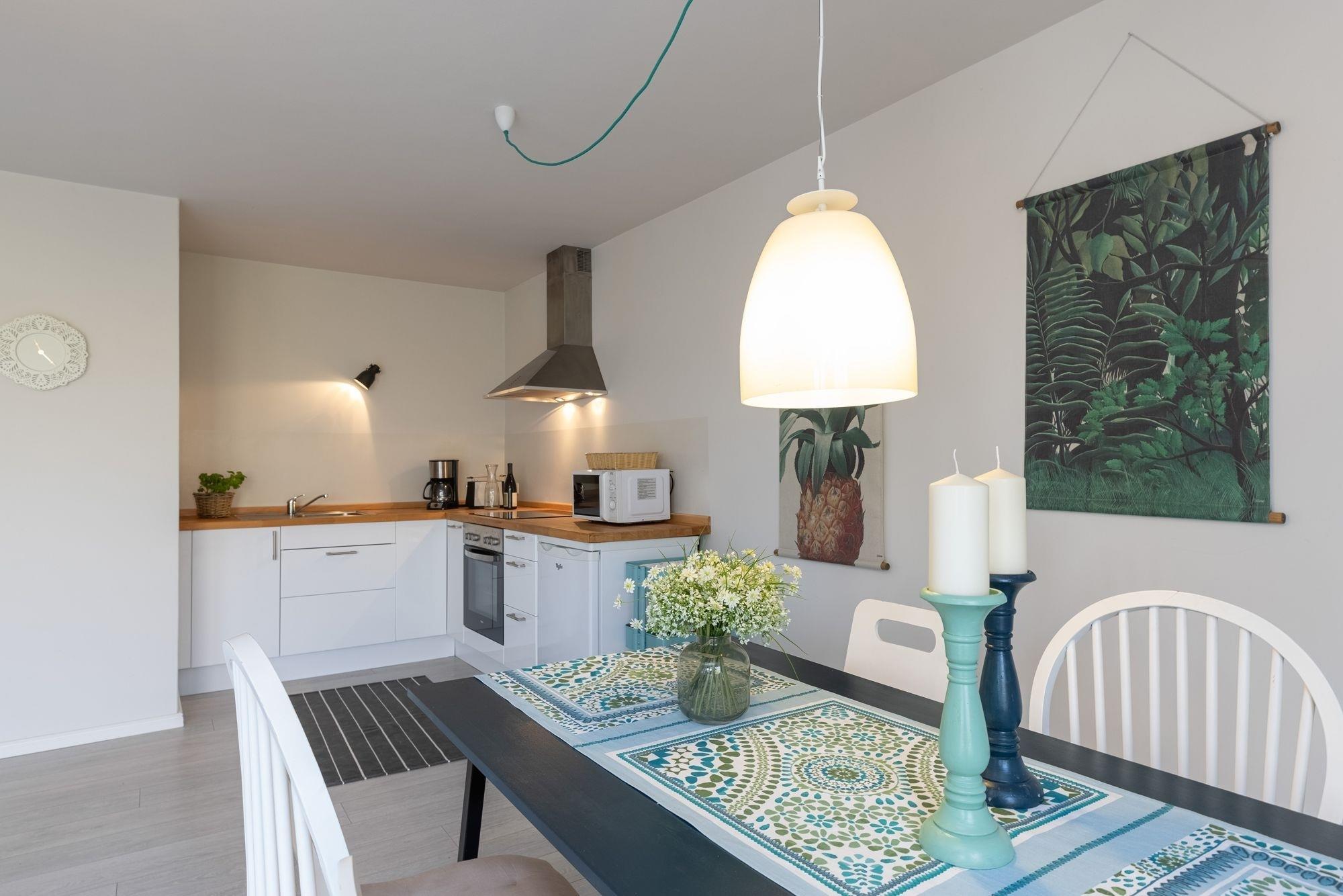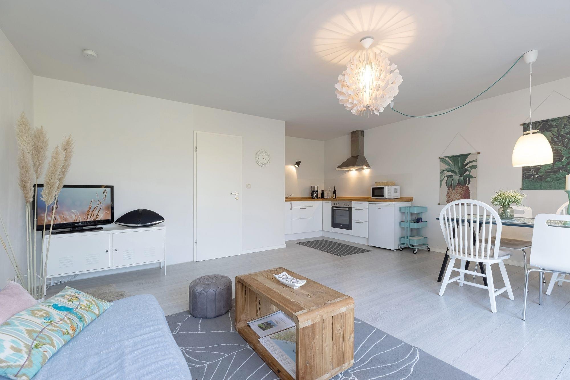 In der modernen offenen Küche mit einem 4-Platten-Ceranfeld-Herd, einem Backofen, einer Mikrowelle können Sie nach Herzenslust Ihre Lieblingsgerichte zubereiten. Zudem steht ein kleiner Kühlschrank mit Gefrierfach zur Verfügung sowie eine Kaffeemaschine, ein Toaster und ein Wasserkocher. Das lichtdurchflutete kombinierte Wohn-/Schlafzimmer bietet eine einladende Sitzecke für 4 Personen zum Essen und Kartenspielen. Gegenüberliegend befindet sich ein komfortabler Sessel und das gemütliche Sofa, das ganz einfach in eine Schlafmöglichkeit für Ihre Kinder (160x200 cm) verwandelt werden kann. Von hier aus können Sie bequem den Fernseher bedienen. Im ruhigen Schlafzimmer können Sie sich abends in das große Doppelbett (2x 90x200 cm) kuscheln und die am Tag gewonnenen Eindrücke noch einmal Revue passieren lassen. Beide Räume lassen sich mit Vorhängen verdunkeln für eine angenehme Nachtruhe. Einen Kleiderschrank haben wir im Flur für Sie bereit gestellt. Vom kombinierten Wohn-/Schlafzimmer aus gelangen Sie auf die ca. 35 m² große Sonnenterrasse mit Zugang zum idyllischen Gemeinschaftsgarten. Für die Entspannung und gemeinsame Familienzeit stehen Ihnen 2 Sonnenliegen, ein schattenspendender Sonnenschirm und Gartenmöbel zur freien Verfügung. Grillen ist ausdrücklich erlaubt, ein Grill steht für Sie bereit. Das modern gestaltete Badezimmer verfügt über ein Fenster und ist mit Dusche und WC ausgestattet. Ein Föhn liegt für Sie bereit. Verbunden mit dem wohnungseigenen WLAN-Zugang können Sie Urlaubsgrüße bequem an Ihre Liebsten versenden.