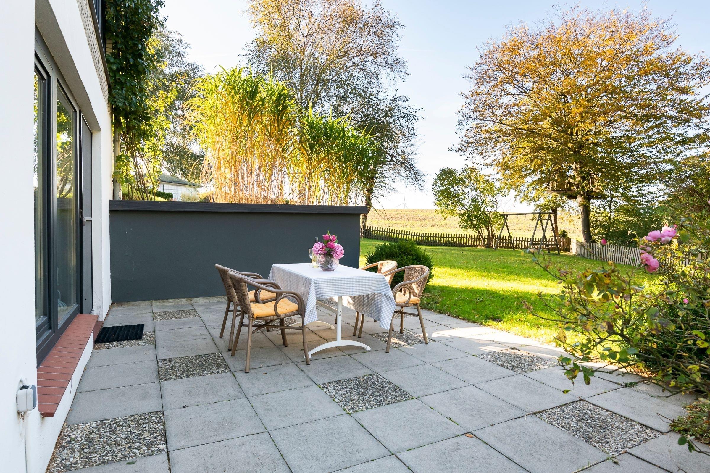 Moderne Ferienwohnung mit Terrasse und Garten in Brenkenhagen, nahe Ostsee und Natur.