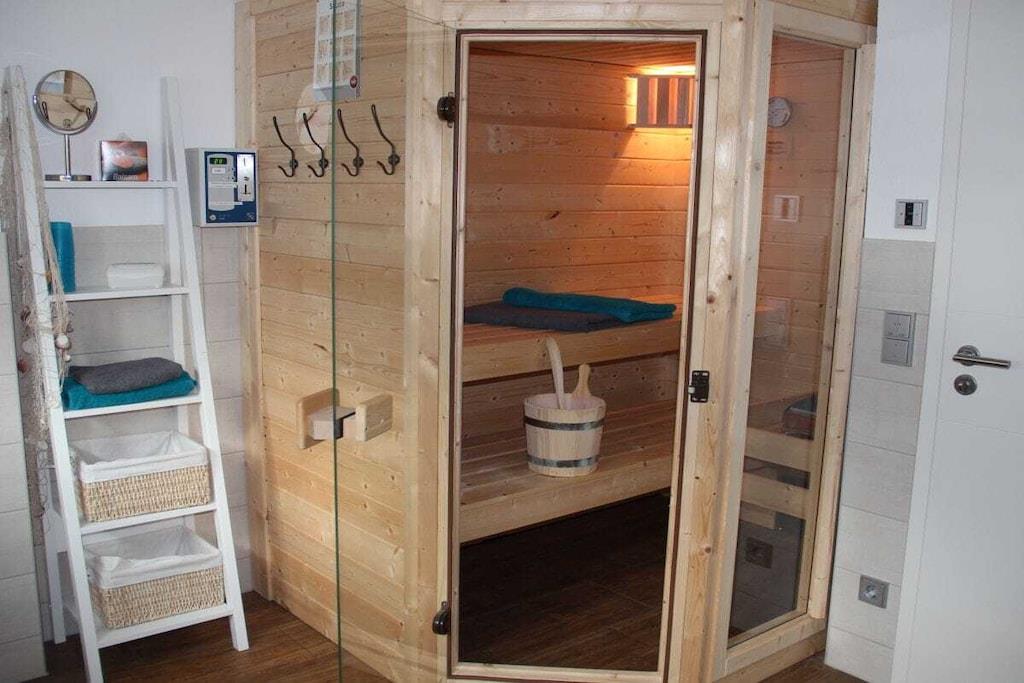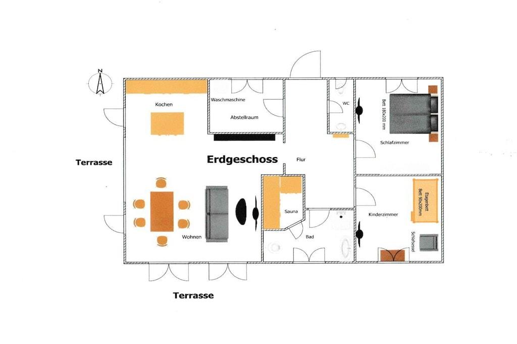 Parterre: (Eingangshalle(, ), Küche(Kochnische, Kochplatte, Wasserkocher, Toaster, Kaffeemaschine, Backofen, Mikrowelle, Spülmaschine, Kühlschrank, Tiefkühlschrank, Heizung), Wohn/Esszimmer(, , Bibliothek, TV, Esstisch, Radio, Hochstuhl), Schlafzimmer(, Doppelbett, TV, Fliegenfenster), Schlafzimmer(, Bibliothek, Schrankbett 1 Person, Doppelbett, Etagenbett, TV, Fliegenfenster), Badezimmer(, Toilette, Sauna, Dusche, Waschbecken, Heizung, Fliegenfenster), guest toilet(Toilette, Waschbecken), Abstellraum(, Waschmaschine, Trockenschrank)) , , , Internet, Waschmaschine, Heizung, Terrasse(, Strand, Grill, Grill, Gartenmöbel), Parkplatz, Trockenschrank