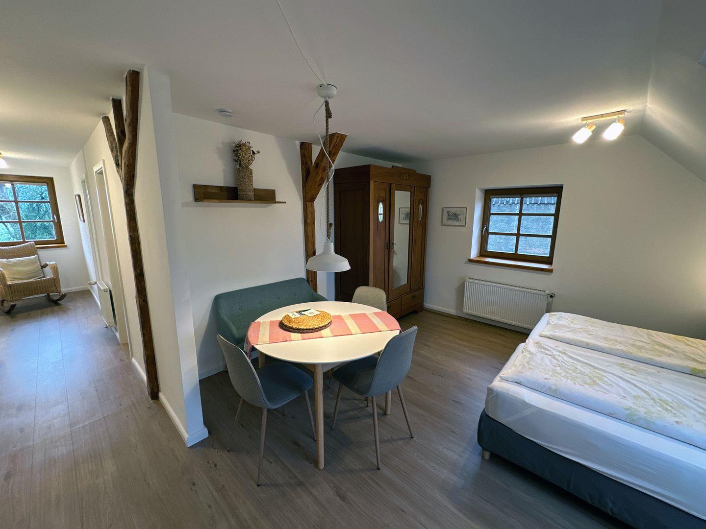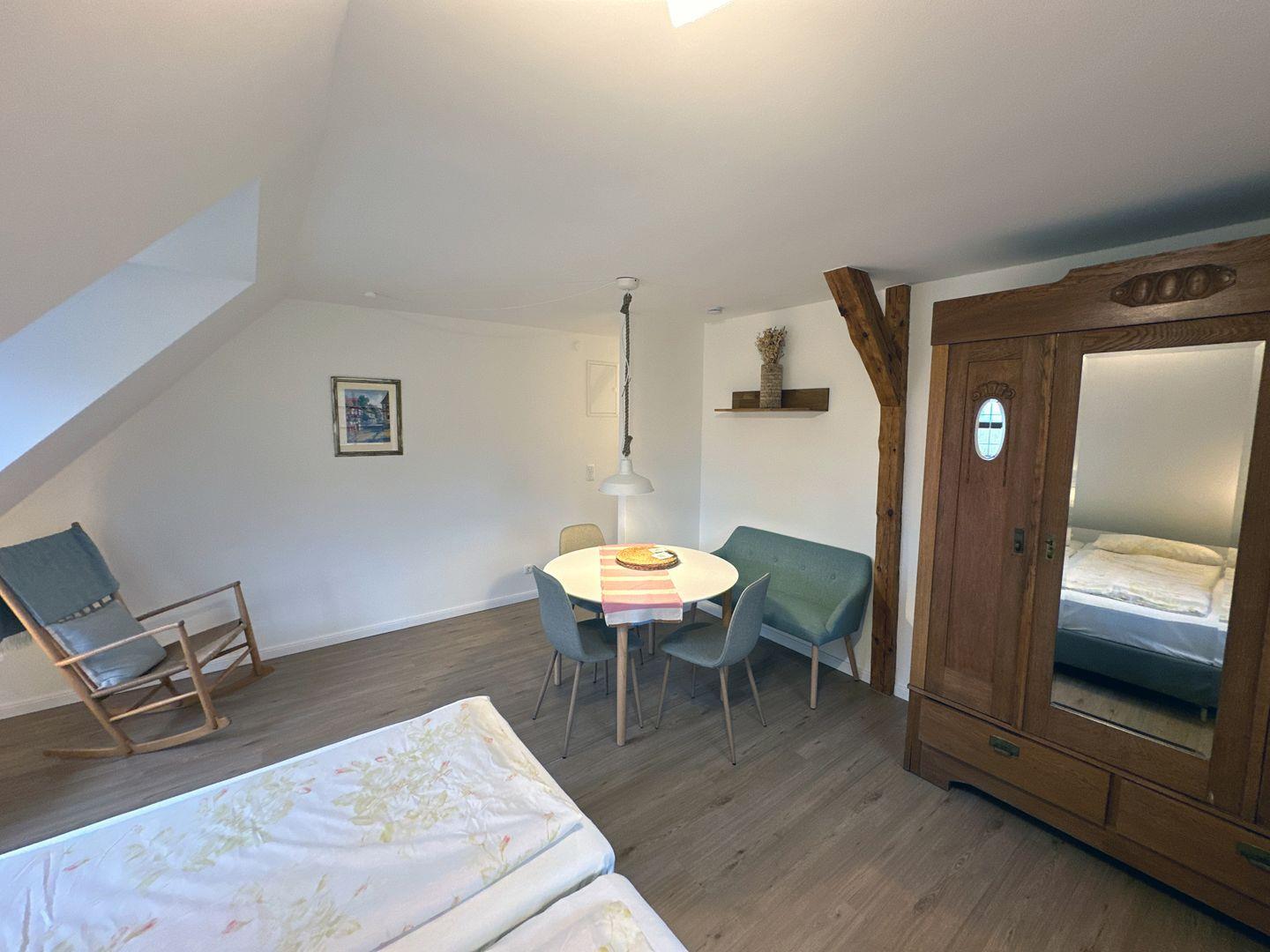 Die Ferienwohnung Froschteich auf dem Lassen Hof in Brodersby an der Schlei bietet Platz für bis zu 3 Personen, ein Kind und befindet sich im ersten Stock mit einer Wohnfläche von 50 m². Sie verfügt über ein separates Schlafzimmer mit zwei Einzelbetten (jeweils 90x200 cm). Der offene Wohn- und Essbereich ist mit einer gut ausgestatteten Küchenzeile und zwei weiteren Einzelbetten (jeweils 90x200 cm) ausgestattet. Das Badezimmer bietet eine Dusche und ein WC.