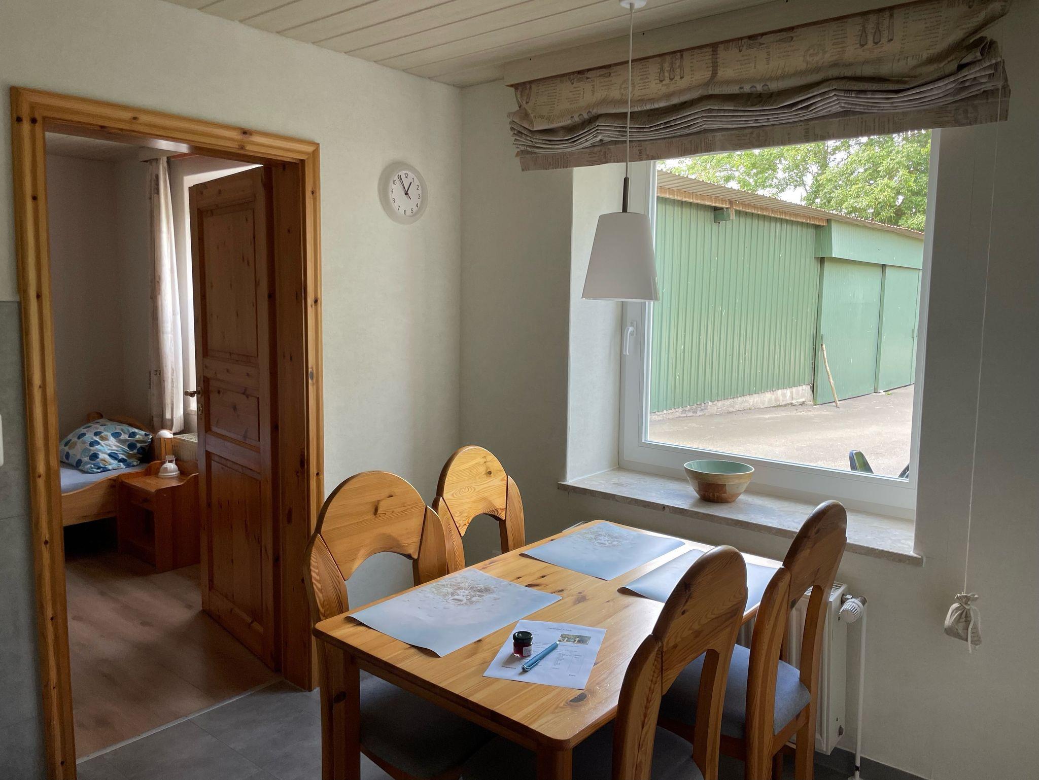Ein Essbereich mit Tisch und Stühlen ist in der Küche integriert.